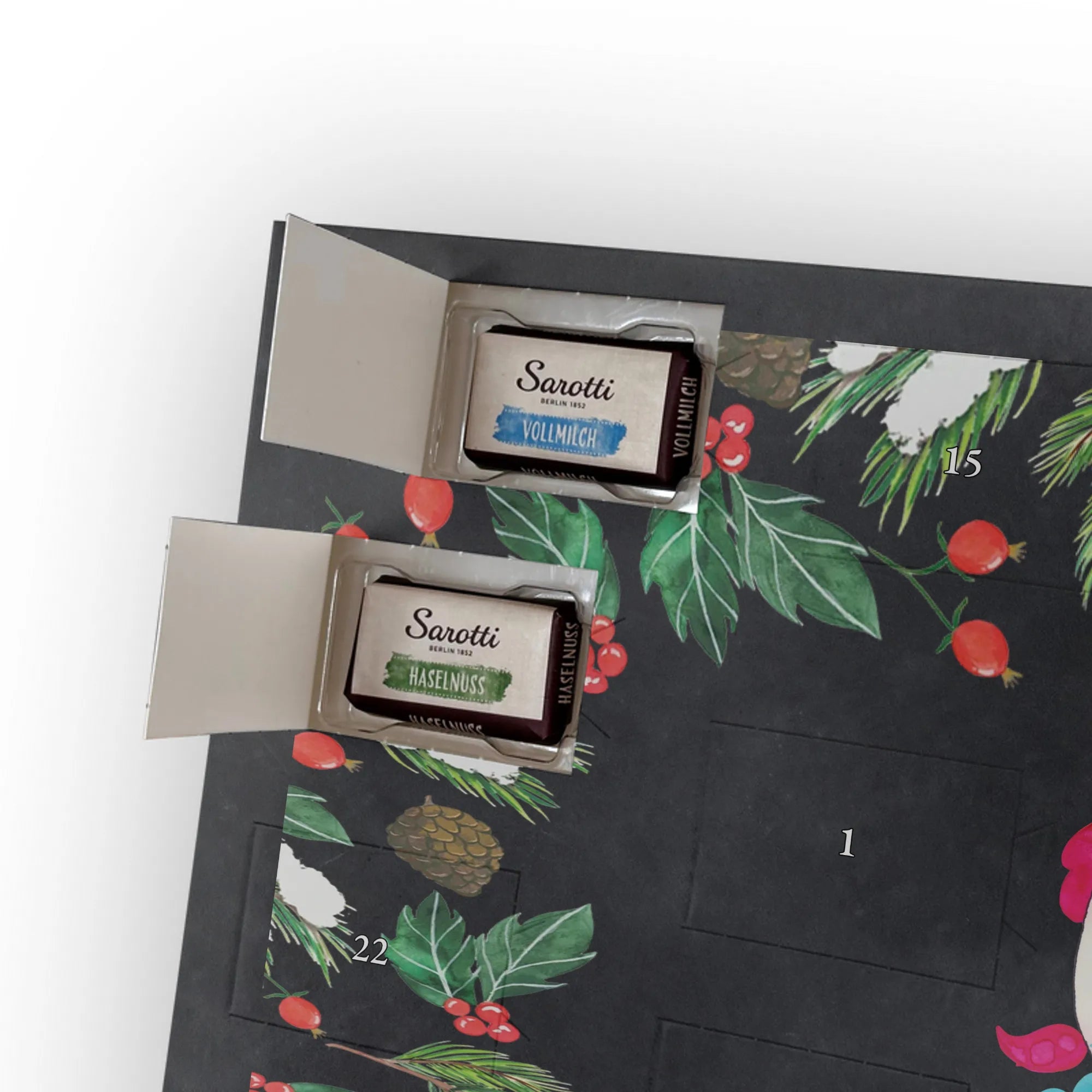 Personalisierter Schoko Adventskalender von Mr. & Mrs. Panda – der perfekte Adventskalender mit Namen für alle, die Geschenke mit Persönlichkeit lieben. Unsere Designs sind mit süßen Illustrationen und liebevollen Sprüchen bedruckt und lassen sich ganz easy mit deinem Namen oder kurzem Wunschtext versehen. Die hochwertige, seidenmatte Oberflächenveredelung verleiht dem Kalender ein edles Finish, und auch die Seitenflächen sind vollständig bedruckt – kleine Details mit großer Wirkung. Maße: 355 mm x 245 mm x 11 mm. Du kannst den Kalender sowohl aufhängen als auch aufstellen, je nachdem, wie du ihn präsentieren möchtest. Gefüllt ist er mit 24 einzeln verpackten Schokoladentäfelchen in vier köstlichen Geschmacksrichtungen. Insgesamt enthält er 107 g Markenschokolade von Sarotti® und Confiserie Heidel®: Vollmilch, Nougat, Zartbitter und Haselnuss. Wichtig: Es handelt sich um einen Kalender gefüllt mit Sarotti® und Confiserie Heidel® Markenschokolade. Ob als Geschenk für die Liebsten oder als besonderer Adventsüberraschung für dich selbst – dieser Adventskalender zaubert jeden Tag ein Lächeln!