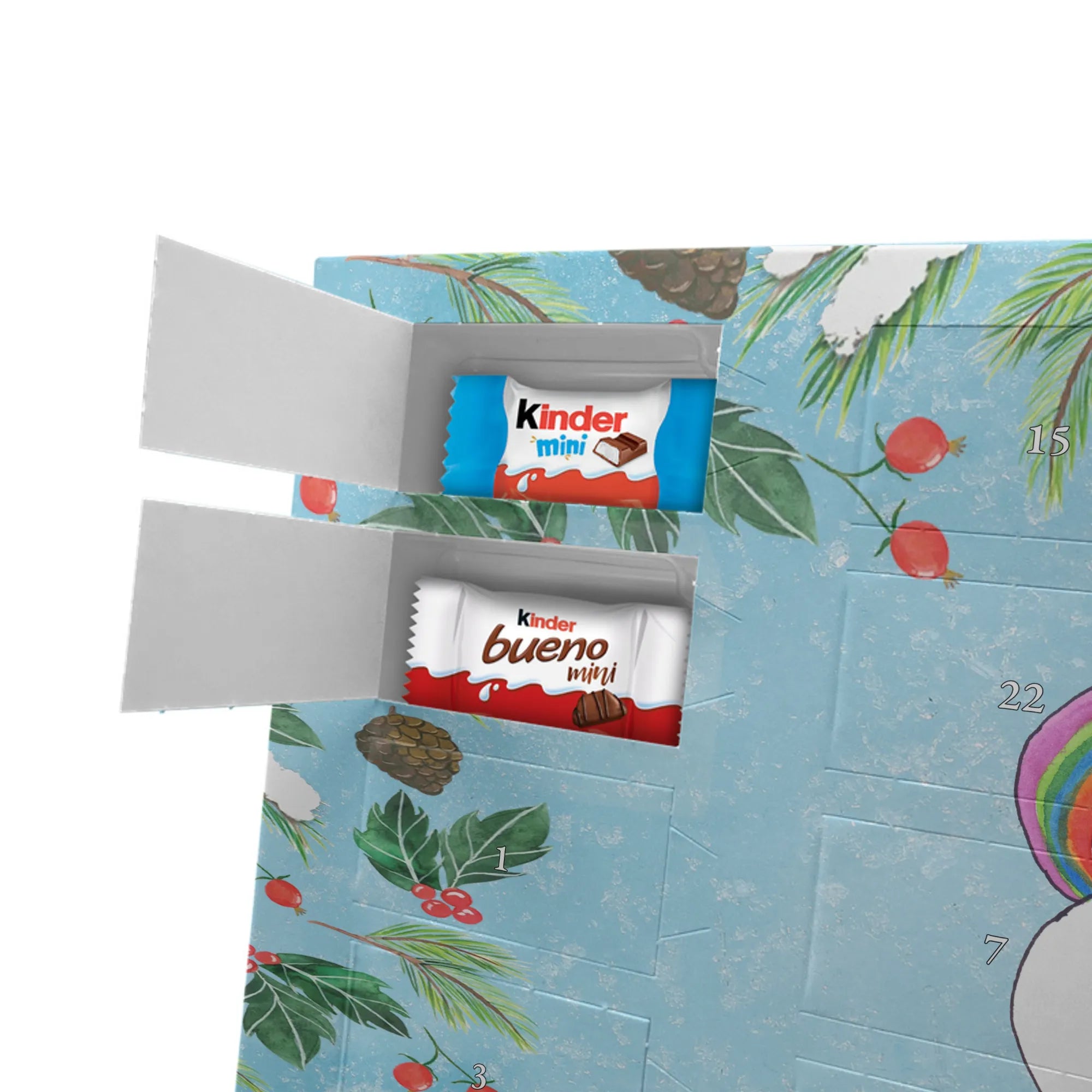 Süße Überraschungen: Gefüllt mit kinder® Schokolade – inklusive kinder® Schoko-Bons, kinder® Bueno mini und kinder® Schokolade mini – bietet der Kalender 24 köstliche Momente, die die Vorweihnachtszeit noch schöner machen. Ideal als Adventskalender mit Namen, Adventskalender personalisiert oder Adventskalender Freundin.