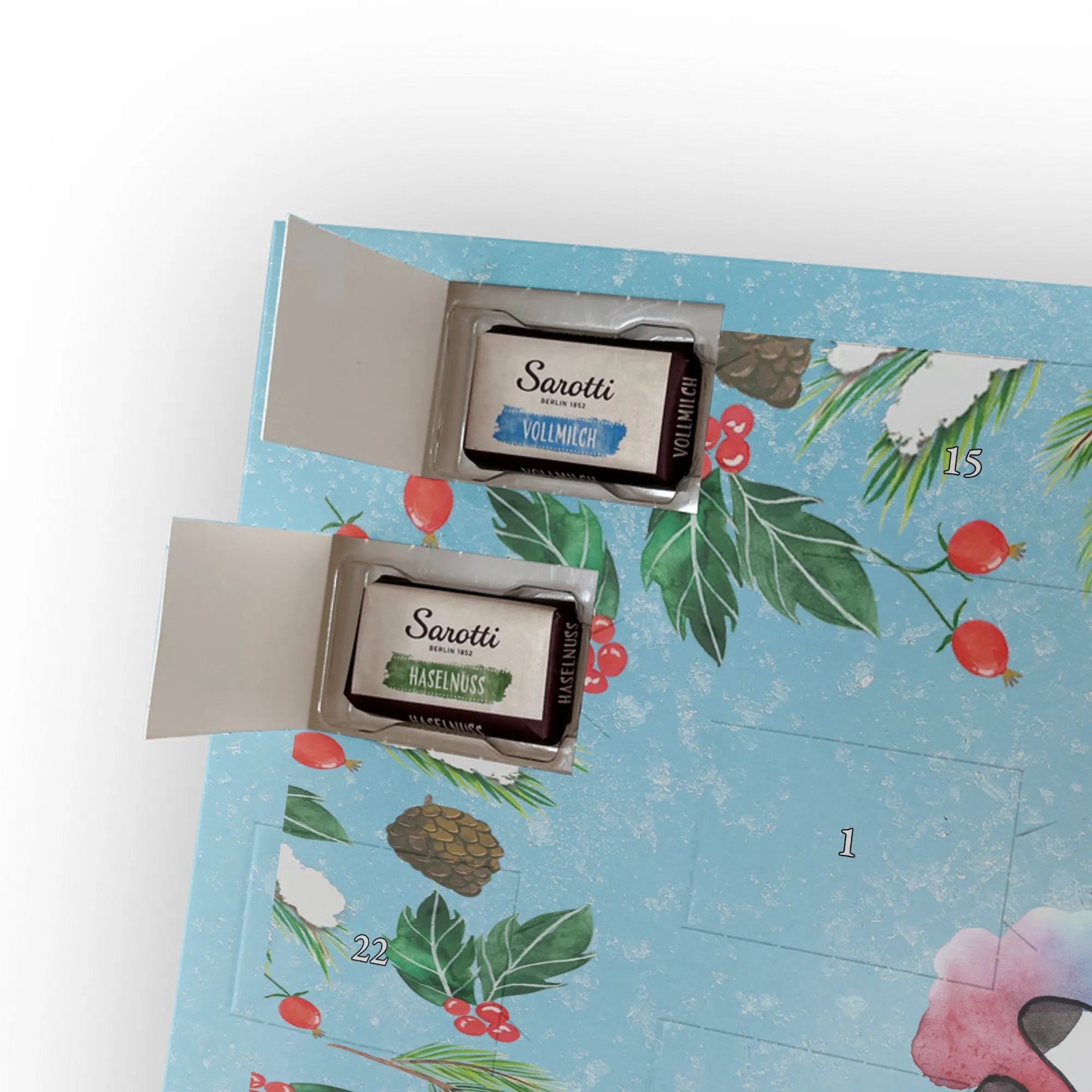 Er verbindet ein wundervolles Design aus der Einhorn - Kollektion mit hochwertiger Schokolade: 24 einzeln verpackte Täfelchen gefüllt mit Markenschokolade von Sarotti® und Confiserie Heidel® in den Geschmacksrichtungen Vollmilch, Nougat, Zartbitter und Haselnuss. Die brillante Druckqualität und die seidenmatte Oberfläche lassen das Aquarell-Motiv von Mrs. Panda besonders hübsch wirken. Bedruckte Seitenflächen und die Möglichkeit, den Kalender aufzuhängen oder aufzustellen, machen ihn besonders vielseitig.