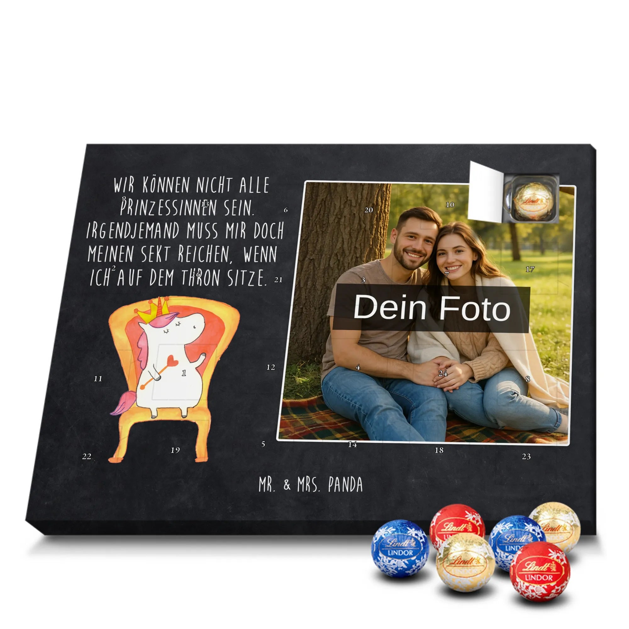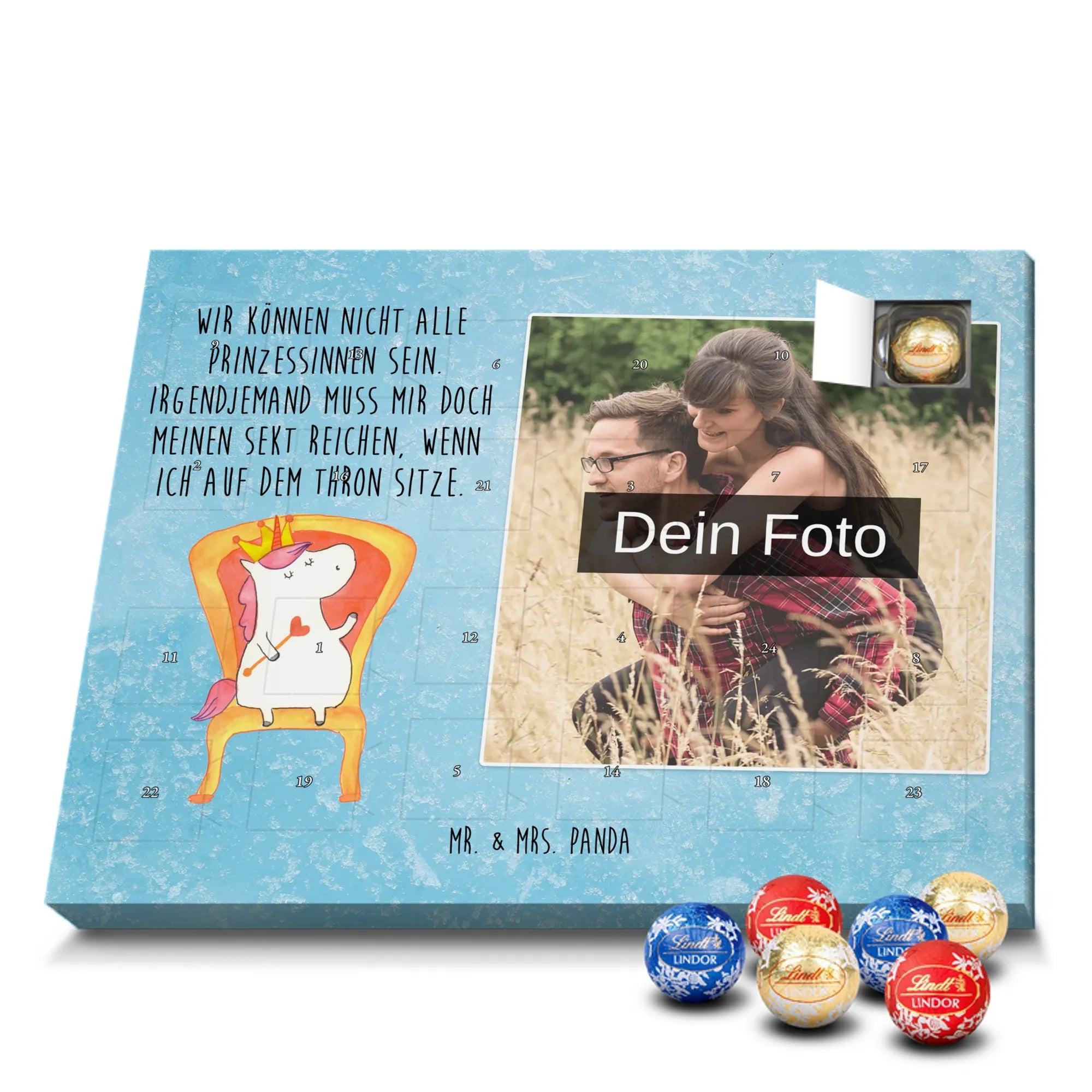 Wunderschöner Personalisierter Schoko Foto Adventskalender von Mr. & Mrs. Panda – perfekt zum Verschenken oder zum Verwöhnen. Dieser Adventskalender verbindet liebevolle Mr. & Mrs. Panda-Motive und Sprüche mit deinem persönlichen Foto auf der Vorderseite. Die hochwertige Verarbeitung mit seidenmatter Oberflächenveredelung sorgt für brillante Farben und eine edle Haptik, die man gerne anfasst. Bedruckte Seitenflächen und die stabile Ausführung machen den Kalender zum echten Hingucker in der Adventszeit. Bitte achte auf eine hohe Auflösung deines Fotos, damit das Druckergebnis klar und scharf wird, und wähle einen passenden Bildausschnitt, damit keine wichtigen Details abgeschnitten werden. Lade nur Bilder hoch, bei denen du die Rechte besitzt oder die Erlaubnis hast, besonders bei Fotos mit Personen. Wichtig: Die Fotos werden weder aufbereitet noch zugeschnitten – eine Rücknahme bei personalisierten Foto-Artikeln ist ausgeschlossen. Der Kalender kann aufgehängt oder aufgestellt werden, so wie es dir gefällt. Maße: 233 mm x 178 mm x 24 mm. Gefüllt mit Lindt Lindor Markenschokolade: 24 einzeln verpackte Markenschokoladen Kugeln in drei Sorten (Vollmilch, Feinherb, Weiße Schokolade). Zutatenhinweis: Kann Haselnüsse und Mandeln enthalten. Ein liebevoller, personalisierter Adventsmoment von Mr. & Mrs. Panda.