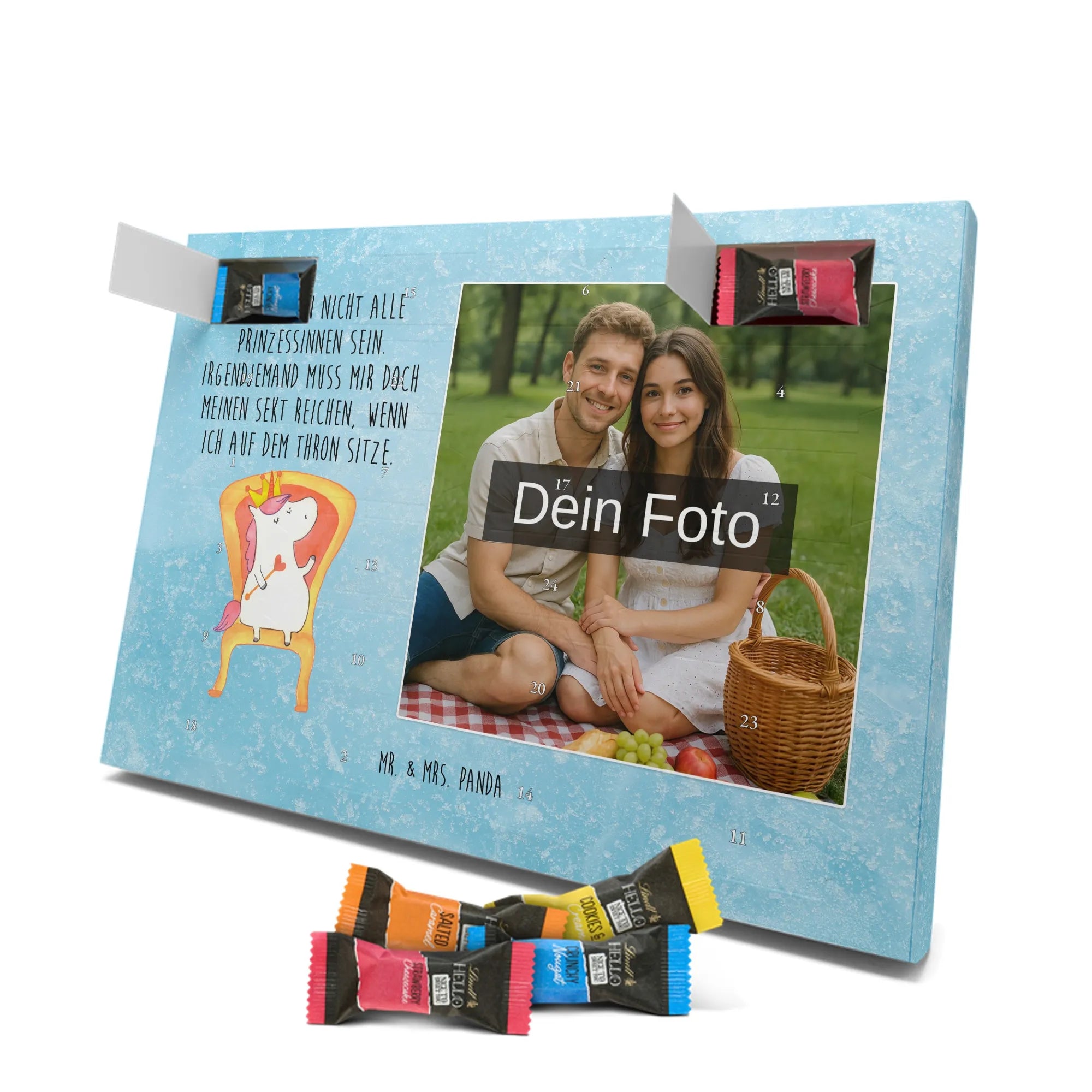 Verschenke Vorfreude: Unser individueller Foto-Adventskalender mit Schokolade von Mr. & Mrs. Panda macht jeden Dezembertag zum kleinen Fest. Der Kalender kombiniert bezaubernde Illustrationen und Sprüche von Mr. & Mrs. Panda mit deinem eigenen Foto – so entsteht ein ganz persönliches Geschenk. Achte auf Bildqualität und Bildausschnitt, damit das Foto optimal zur Geltung kommt, und nutze nur Bilder, für die du die Rechte besitzt. Die hochwertige seidenmatte Oberfläche mit bedruckten Seitenflächen veredelt das Design. Maße: 325 mm x 225 mm x 27 mm. Gefüllt mit Lindt Hello Schokolade: 24 einzeln verpackte Mini Sticks in den Sorten Karamell-Schokoladenkuchen, Kekse, Knuspriger Nougat und Erdbeer-Cheesecake. Zutaten und Allergene findest du auf der Verpackung; enthalten sind z. B. Milcheiweiß, Milchzucker, Soja, Weizen und Haselnüsse. Besonderheit: Du kannst den Kalender aufstellen oder an der Wand aufhängen. Bitte beachten: Die Fotos werden weder aufbereitet noch zugeschnitten – personalisierte Foto-Artikel sind vom Rückgaberecht ausgeschlossen. Hol dir ein Stück Adventszauber mit deinem persönlichen Foto-Adventskalender!