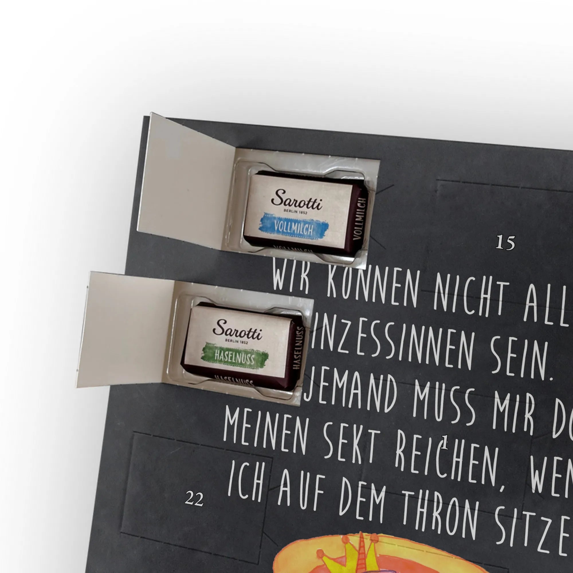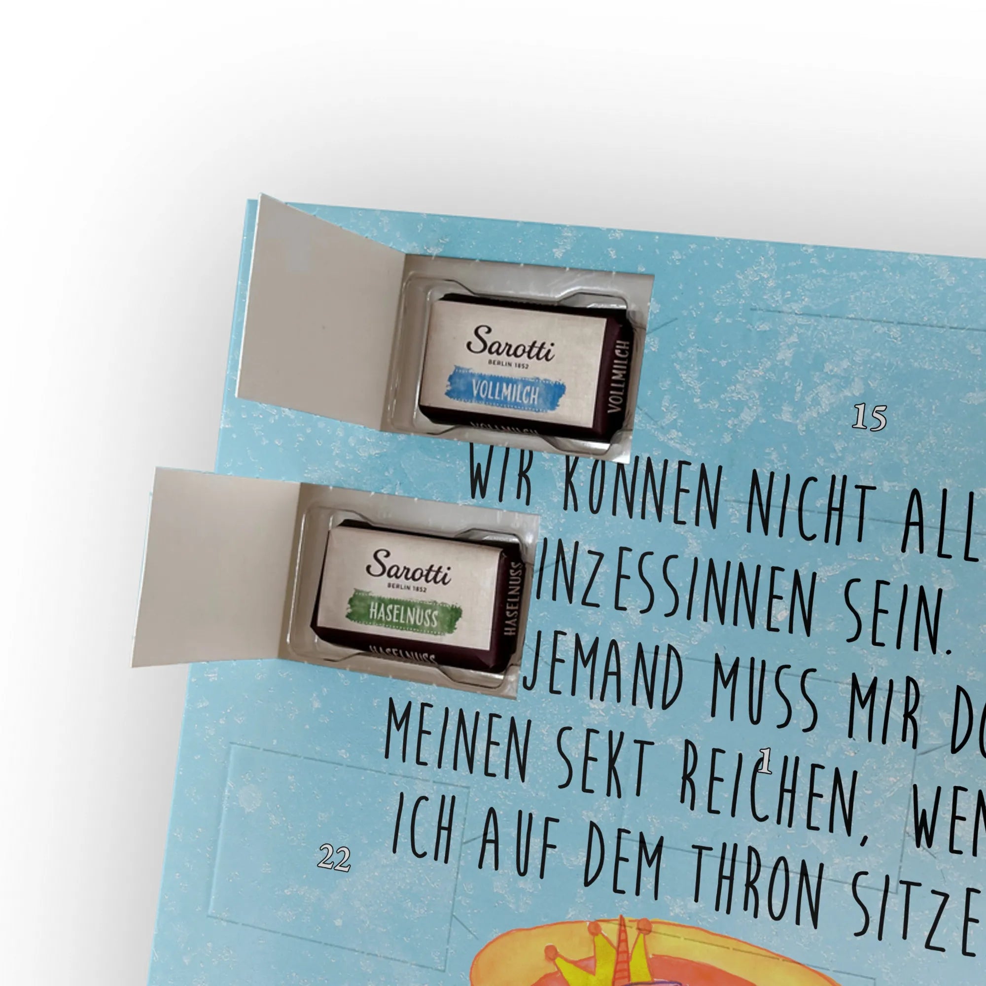 Personalisierter Schoko-Adventskalender mit Foto – das kleine Weihnachtswunder von Mr. & Mrs. Panda! Verschenke jeden Tag Vorfreude: Der Kalender ist liebevoll gestaltet mit unseren herzlichen Illustrationen und Sprüchen, während dein Foto die persönliche Mitte bildet. Bitte lade ein hochauflösendes Foto hoch und prüfe den Bildausschnitt, damit nichts Wichtiges verloren geht. Nutze nur Bilder, für die du die Rechte hast. Die hochwertige, seidenmatte Veredelung und die bedruckten Seitenflächen garantieren ein edles Erscheinungsbild. Maße: 355 mm x 245 mm x 11 mm; lässt sich sowohl aufhängen als auch aufstellen. Achtung: Fotos werden nicht nachbearbeitet oder zugeschnitten; personalisierte Artikel sind vom Rückgaberecht ausgeschlossen. Gefüllt mit 24 einzeln verpackten Schokoladentäfelchen aus den vier Geschmacksrichtungen Vollmilch, Nougat, Zartbitter und Haselnuss – von Sarotti® und Confiserie Heidel®. Insgesamt enthält der Kalender 107 g Markenschokolade. Ein persönliches Geschenk mit süßem Inhalt, ideal für Partner, Familie und Freunde, verpackt mit der typischen Mr. & Mrs. Panda Liebe zum Detail.