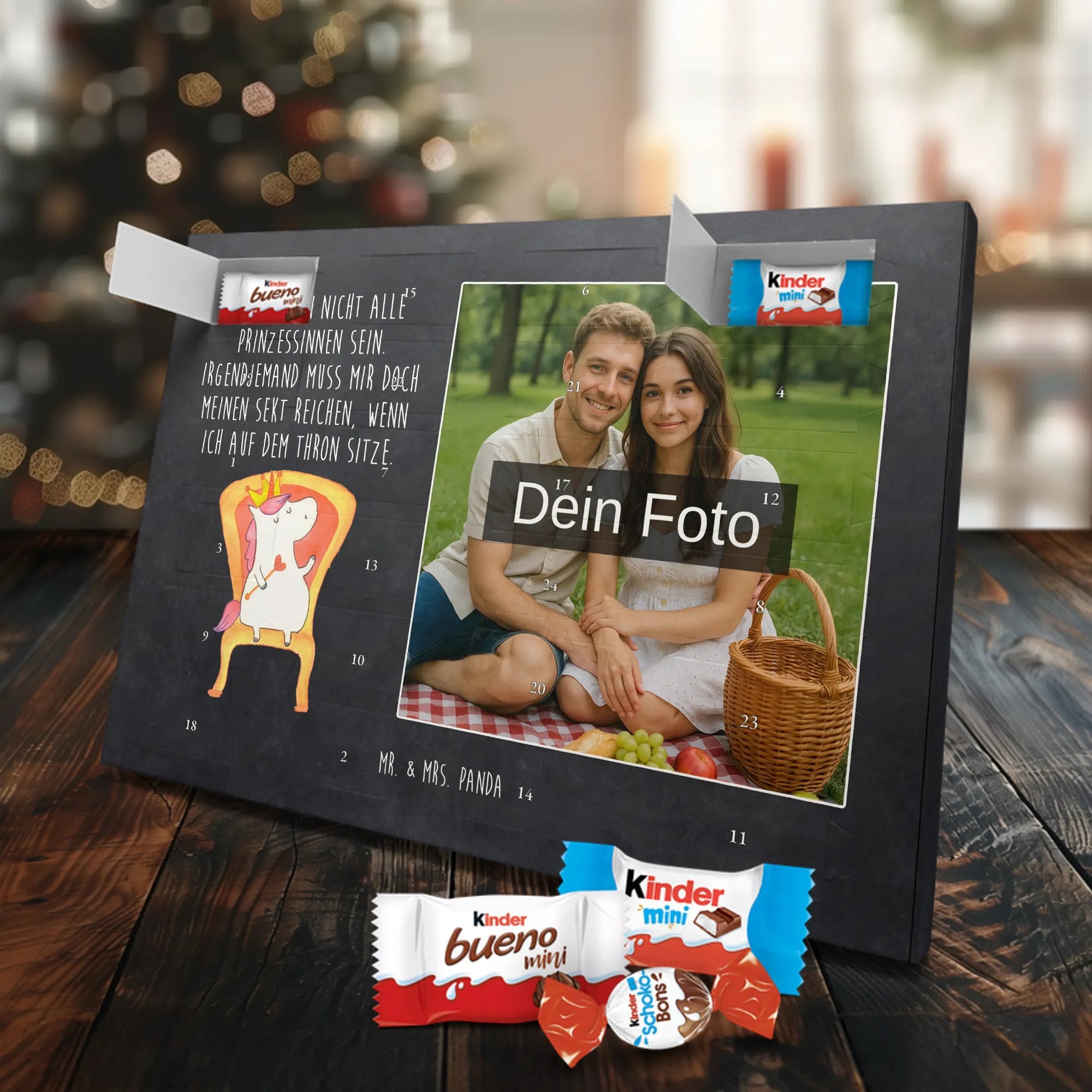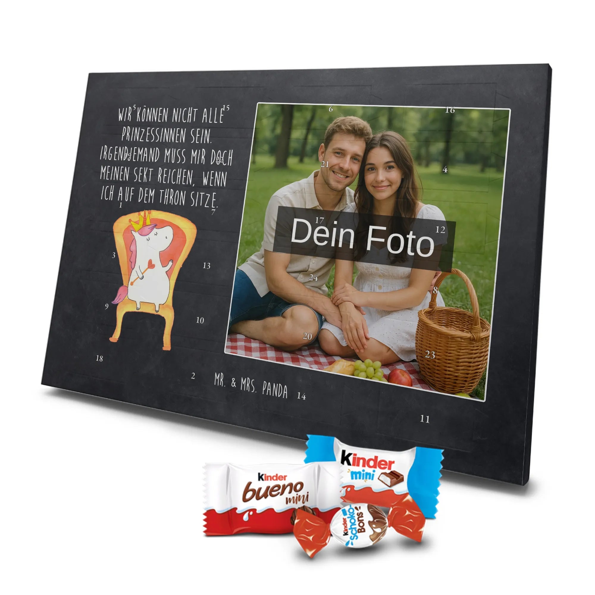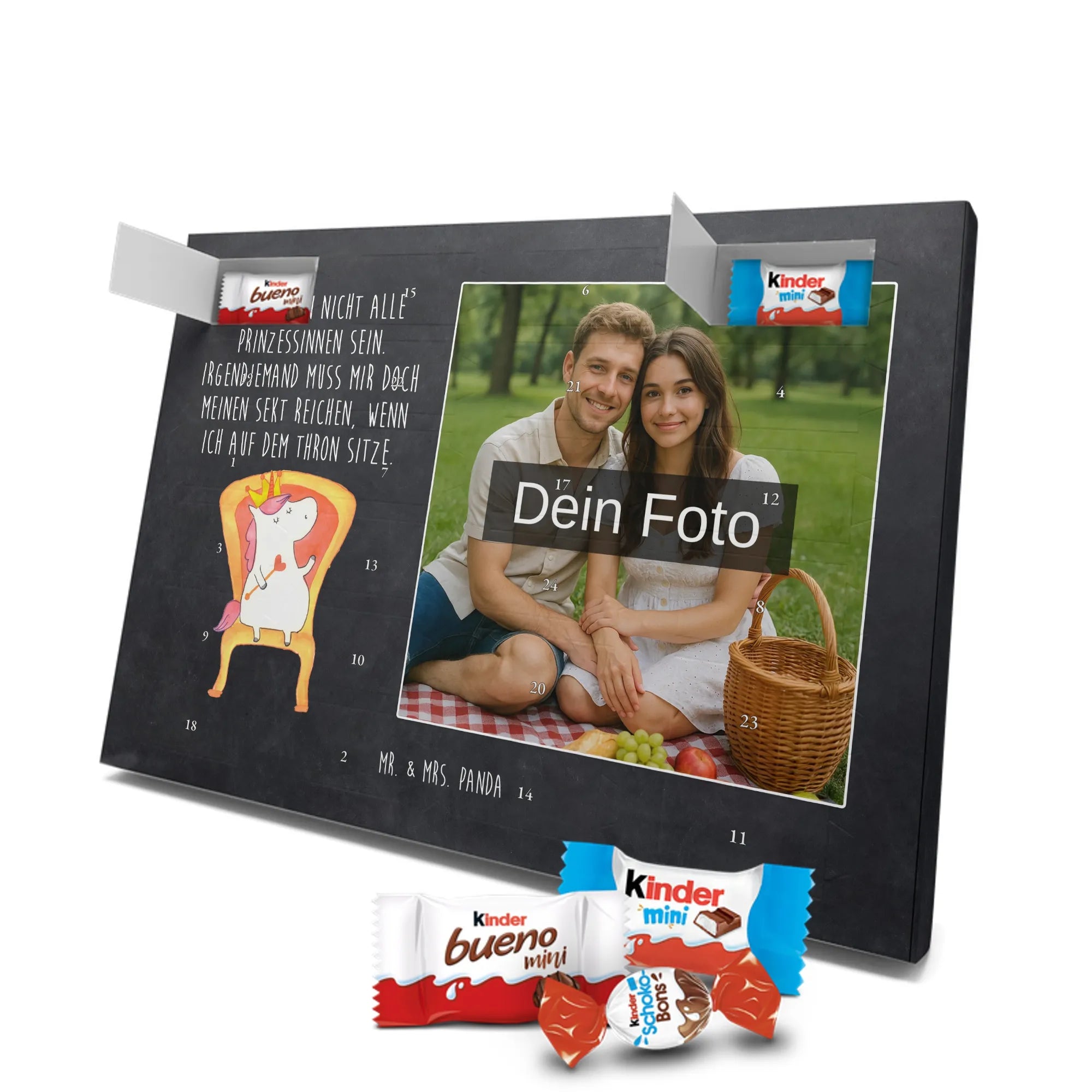 🐼 Personalisierter Schoko-Foto-Adventskalender mit deinem Bild, Mr. & Mrs. Panda Motiven und gefüllt mit kinder® Schokolade.