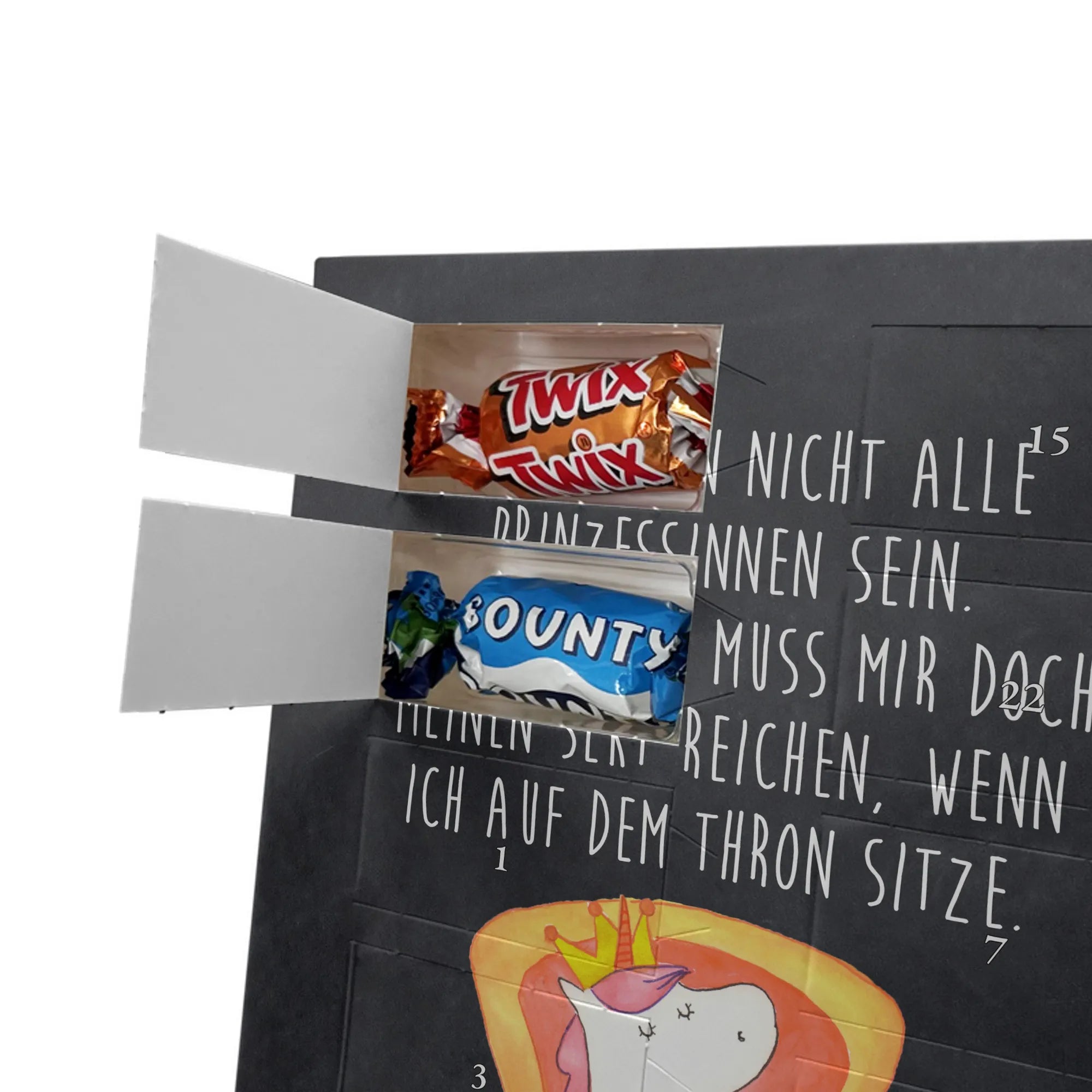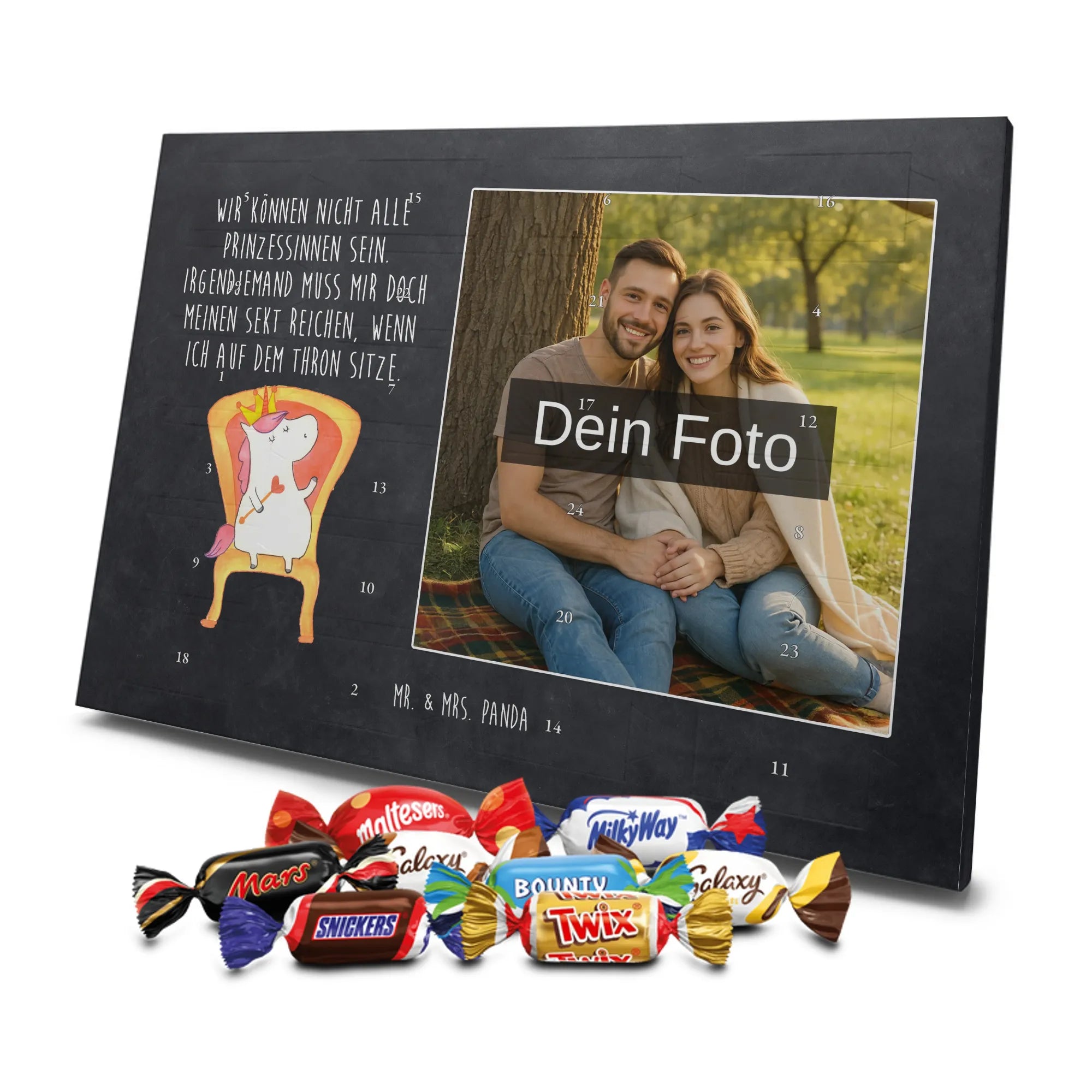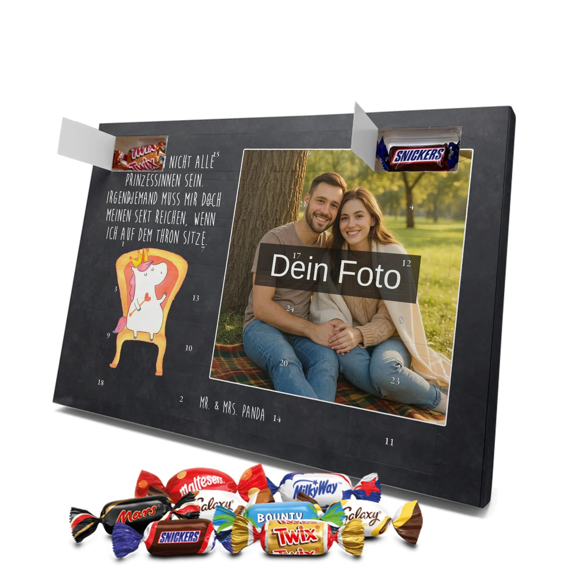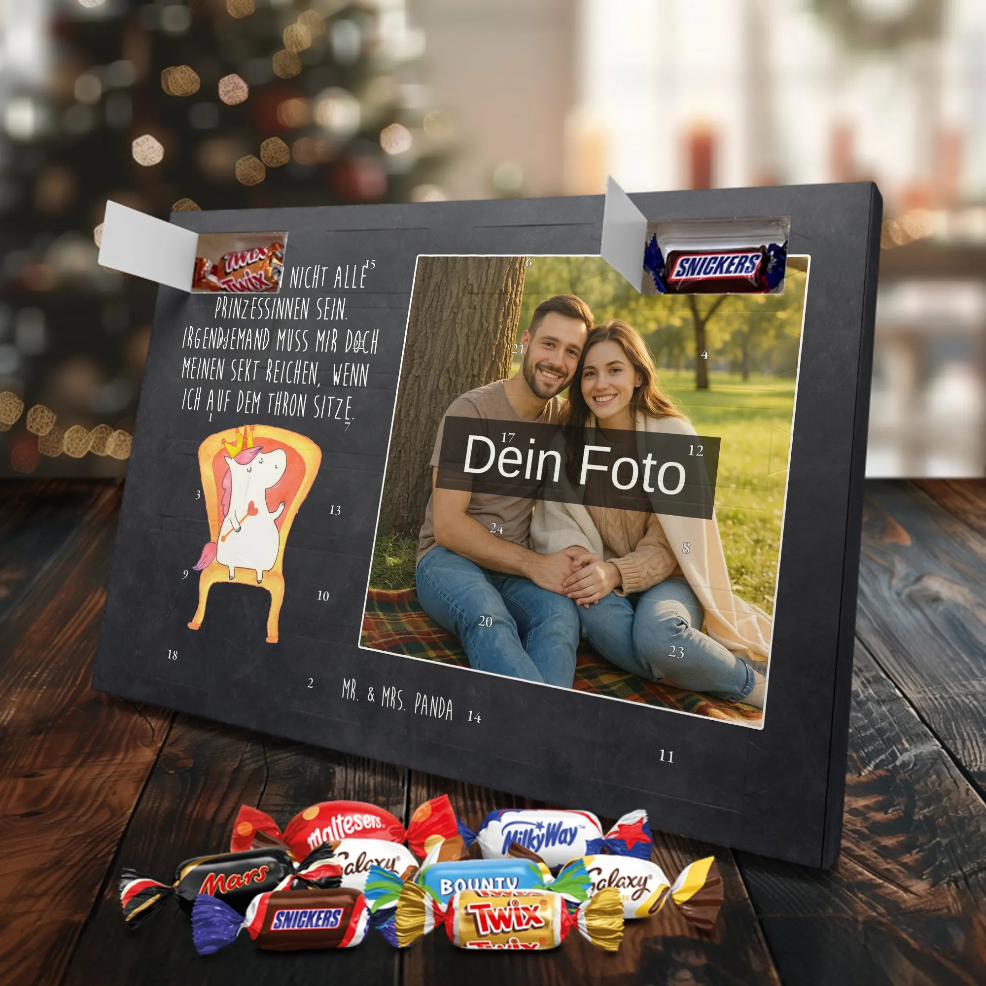 Lustiger Personalisierter Schoko Foto-Adventskalender – das Must-have für eine persönliche Adventszeit von Mr. & Mrs. Panda. Jeder Kalender wird mit unseren charmanten Illustrationen und liebevollen Sprüchen bedruckt, während dein Foto die Vorderseite einzigartig macht. Achte bitte darauf, ein Foto mit guter Qualität und ausreichend hoher Auflösung hochzuladen, damit der Druck gestochen scharf wirkt. Überprüfe den Bildausschnitt, damit wichtige Bereiche nicht verloren gehen. Denk daran, nur Bilder zu verwenden, bei denen du die nötigen Rechte besitzt. Die Verarbeitung ist hochwertig: brillante Druckqualität mit seidenmatter Oberflächenveredelung und bedruckten Seitenflächen. Maße: 325 mm x 225 mm x 27 mm. Du kannst den Kalender aufhängen oder aufstellen – sehr praktisch. Hinweis: Die hochgeladenen Fotos werden nicht nachbearbeitet oder zugeschnitten; Rücknahme bei personalisierten Foto-Artikeln ist ausgeschlossen. Gefüllt ist der Kalender mit Celebrations Schokolade – 24 Stück in 8 verschiedenen Sorten (Maltesers, Mars, Snickers, Twix, Milky Way, Bounty, Galaxy, Galaxy Caramel). Verschenke ein Stück persönlich gestaltete Vorfreude und mache jeden Dezembertag zu etwas Besonderem.