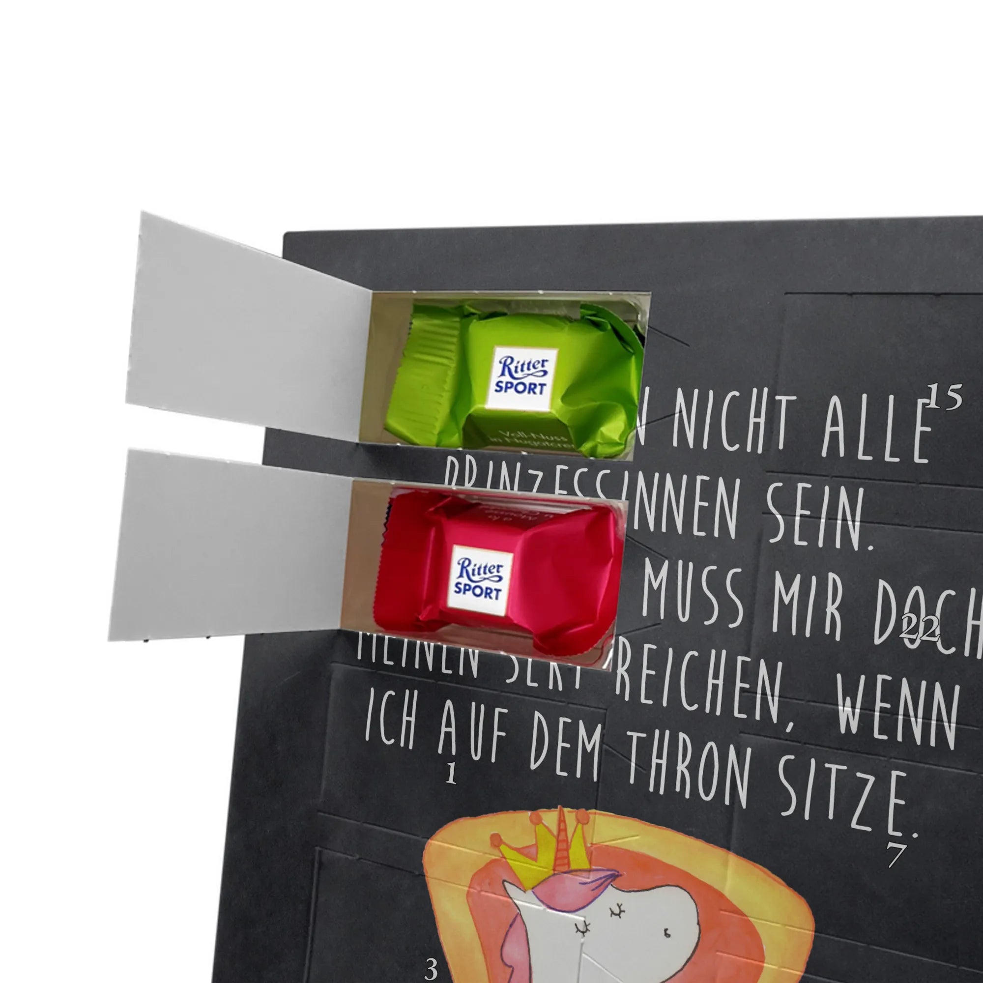Schoko Foto Adventskalender personalisiert – ein fröhlicher Hingucker von Mr. & Mrs. Panda, der Adventszeit und Erinnerungen verbindet. Der Kalender ist bedruckt mit zauberhaften Motiven & Sprüchen von Mr. & Mrs. Panda und lässt sich ganz leicht mit einem Foto deiner Wahl personalisieren. Achtung Bildqualität: Für ein scharfes Druckbild solltest du ein Foto in hoher Auflösung verwenden. Kontrolliere den Bildausschnitt, damit wichtige Gesichter oder Details nicht verloren gehen. Verwende nur Fotos, für die du die Rechte besitzt oder die frei nutzbar sind. Bitte beachte: Die Fotos werden weder nachbearbeitet noch zugeschnitten und personalisierte Foto Artikel sind vom Umtausch ausgeschlossen. Die Verarbeitung überzeugt mit seidenmatter Oberflächenveredelung und bedruckten Seitenflächen für ein edles Finish. Maße: 325 mm x 225 mm x 27 mm. Besonderheit: Du kannst den Kalender aufhängen oder aufstellen – ganz flexibel. Gefüllt ist der Kalender mit Ritter Sport Schokowürfeln in leckeren Geschmacksrichtungen wie Mousse au Chocolat, Schoko Crisp, Voll-Nuss in Nougatcreme, Karamell Duo, Joghurt und Erdbeer-Joghurt. Ein liebevolles Geschenk, das jeden Tag im Advent versüßt.