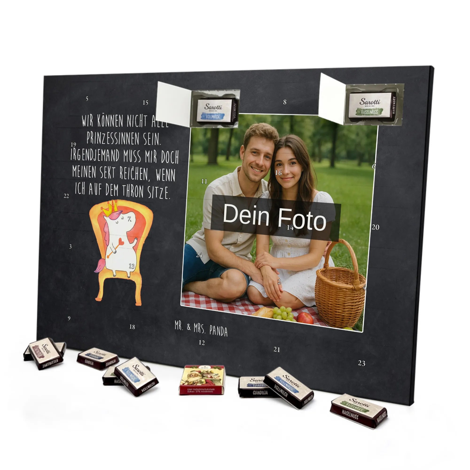 Personalisierter Schoko-Foto-Adventskalender von Mr. & Mrs. Panda – perfekt, wenn du ein einzigartiges, herzhaft-süßes Geschenk suchst. Du lädst ein Foto hoch, das wir auf der Vorderseite platzieren; der Rest des Kalenders ist mit unseren liebevollen Illustrationen und frechen Sprüchen gestaltet. Achte bitte darauf, dass das Bild eine hohe Auflösung hat und der Bildausschnitt passt, damit das Druckbild schön und scharf wird. Lade nur Fotos hoch, an denen du die Rechte besitzt oder für die du die Erlaubnis hast. Wichtig: Wir bearbeiten oder kürzen die Fotos nicht und personalisierte Artikel sind vom Rückgaberecht ausgeschlossen. Die hochwertige, seidenmatte Oberflächenveredelung sorgt für edle Optik, die bedruckten Seitenflächen geben dem Kalender eine liebevolle Note. Maße: 355 mm x 245 mm x 11 mm. Du kannst den Kalender aufstellen oder aufhängen – ganz wie du möchtest. Gefüllt ist er mit kinder® Schokolade: enthalten sind kinder® Schoko-Bons, kinder® Bueno mini und kinder® Schokolade mini. Wir empfehlen, vor dem Hochladen den Bildausschnitt am Bildschirm zu prüfen, damit Gesichter und wichtige Details nicht abgeschnitten werden. Dieser Adventskalender ist ideal für Paare, Familien und als persönliches Mitbringsel – mit ganz viel Mr. & Mrs. Panda Herz.