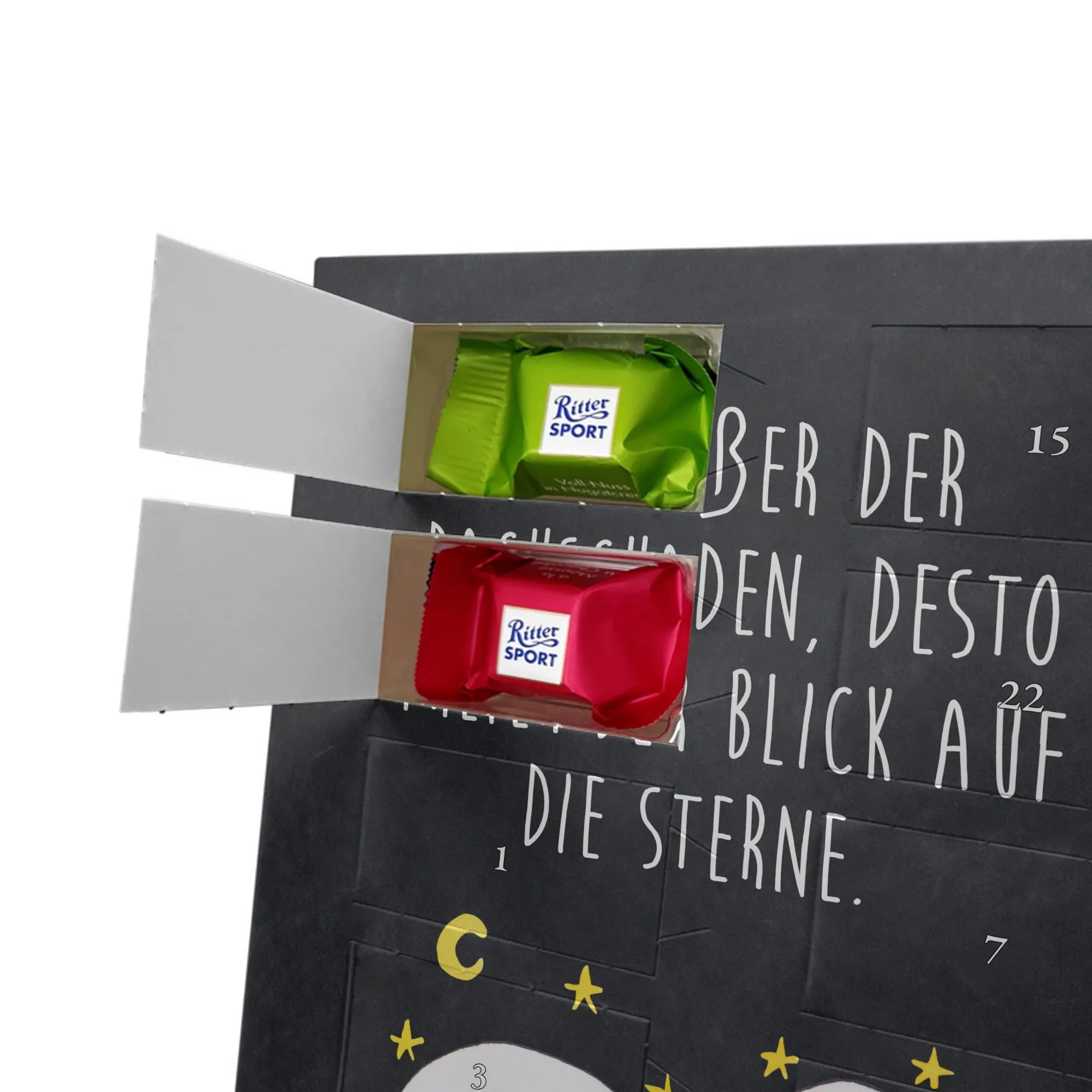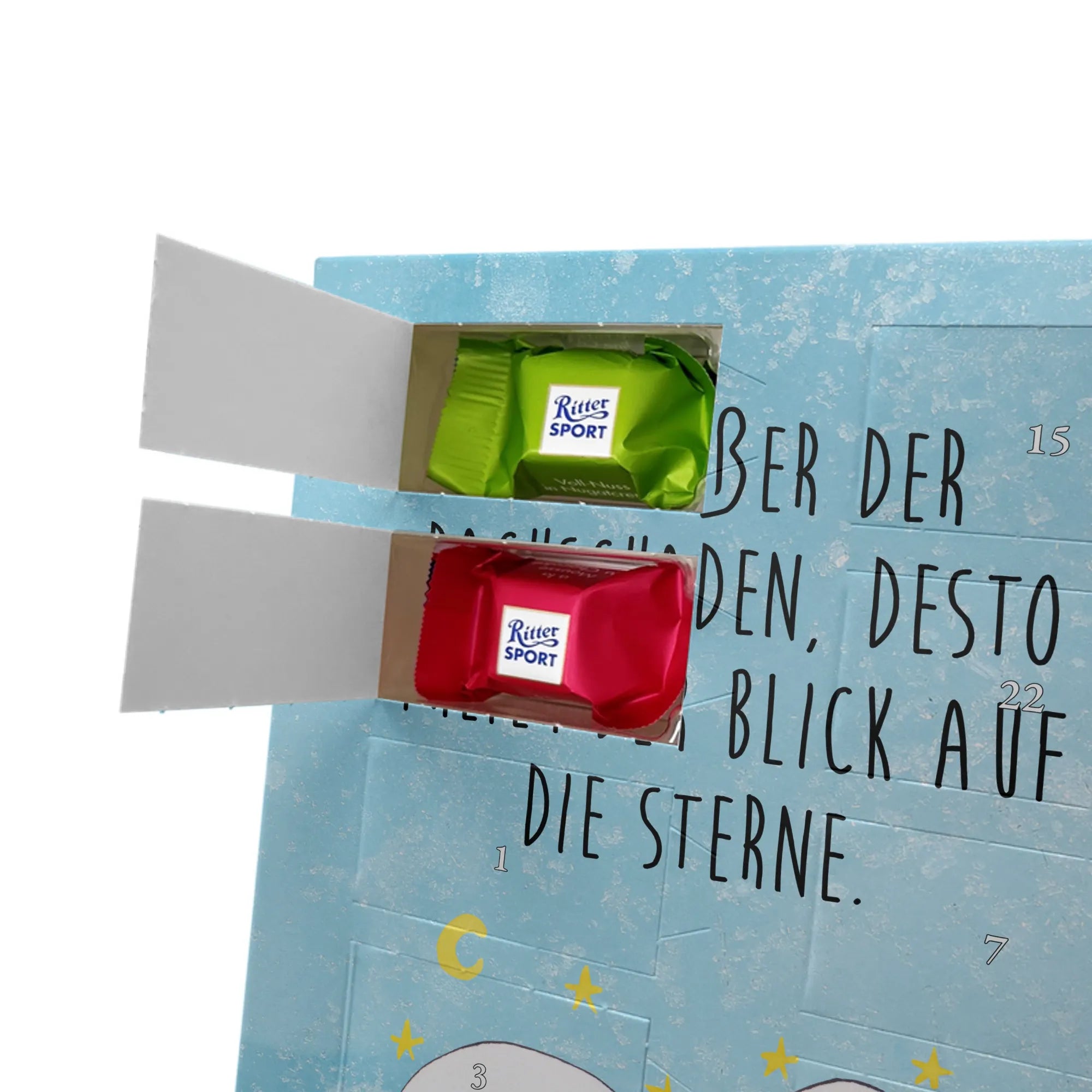 Personalisiertes Schoko-Foto Adventskalender von Mr. & Mrs. Panda – zaubere ein Lächeln in die Adventszeit mit einem persönlichen Foto und unseren liebevollen Motiven & Sprüchen. Der Kalender ist hochwertig bedruckt, verfügt über seidenmatte Oberflächenveredelung und bedruckte Seitenflächen für ein besonders schönes Erscheinungsbild. Bitte lade ein Foto in hoher Auflösung hoch und achte auf den richtigen Bildausschnitt, damit wichtige Details nicht verloren gehen. Verwende nur Bilder, bei denen du die Rechte besitzt; Fotos werden weder aufbereitet noch zugeschnitten und personalisierte Foto Artikel sind vom Umtausch ausgeschlossen. Maße: 325 mm x 225 mm x 27 mm. Besonderheit: Der Adventskalender kann aufgehängt oder aufgestellt werden – ganz flexibel. Gefüllt ist er mit Ritter Sport Schokowürfeln in köstlichen Geschmacksrichtungen wie Mousse au Chocolat, Schoko Crisp, Voll-Nuss in Nougatcreme, Karamell Duo, Joghurt und Erdbeer-Joghurt. Ein persönliches, süßes Geschenk, das hochwertige Optik mit täglichem Genuss verbindet und die Vorfreude auf Weihnachten jeden Tag steigert.