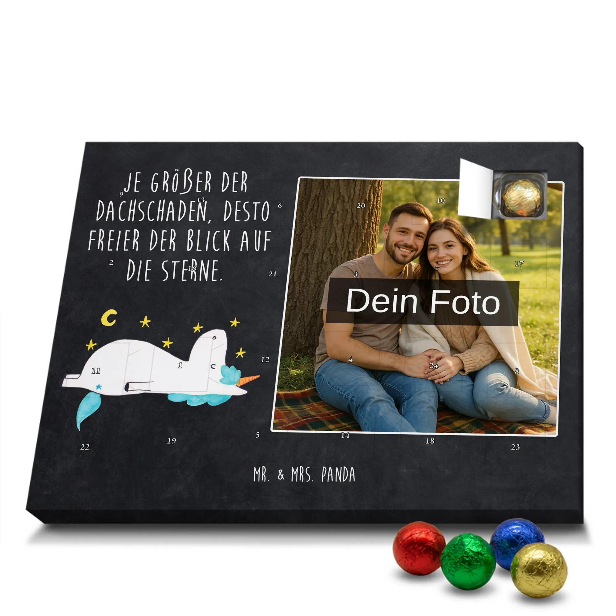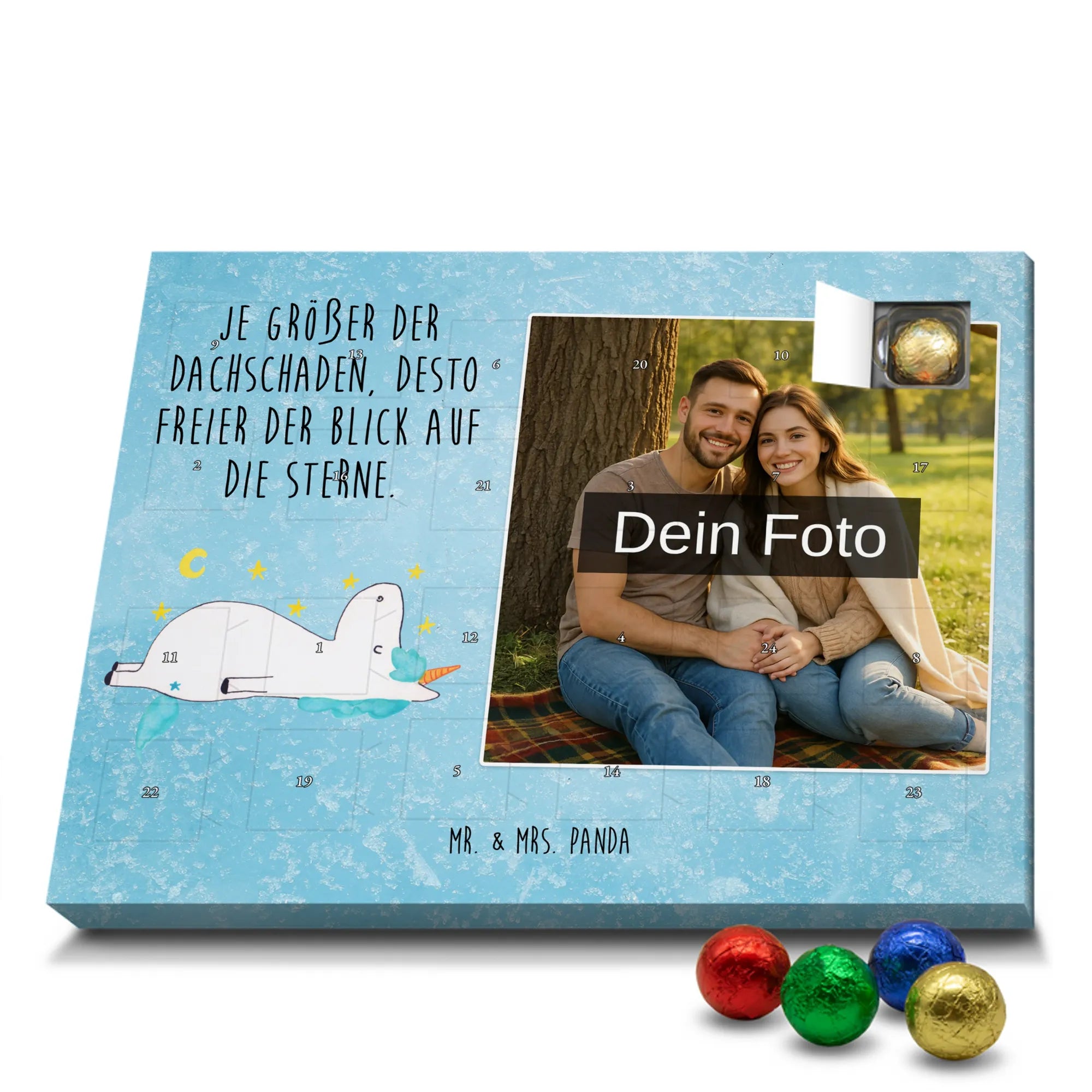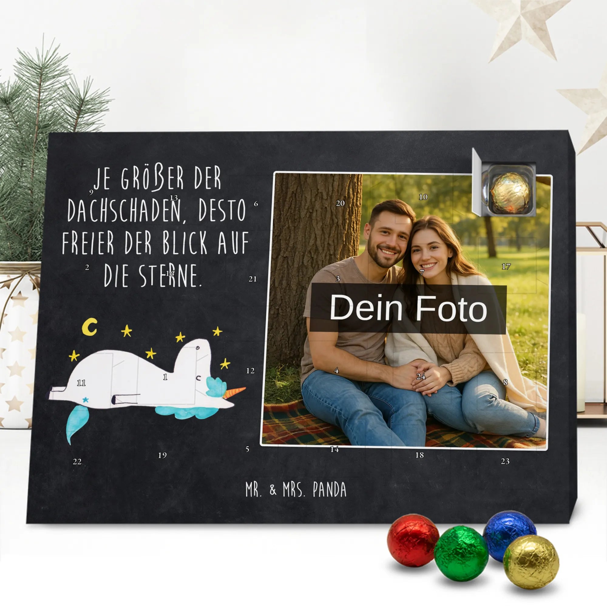 Suchst du ein besonderes Geschenk, das persönlich, zauberhaft und voller Vorfreude ist? Unser Personalisierter Schoko Foto Adventskalender aus der Einhorn - Kollektion von Mr. & Mrs. Panda vereint ein liebevoll handgezeichnetes Einhornmotiv mit deiner eigenen Lieblingsfoto-Erinnerung. Das süße Einhorn blickt verträumt in den Sternenhimmel und trägt den frechen Spruch: „Je größer der Dachschaden, desto freier der Blick auf die Sterne.“ – perfekt für alle, die das Besondere lieben.