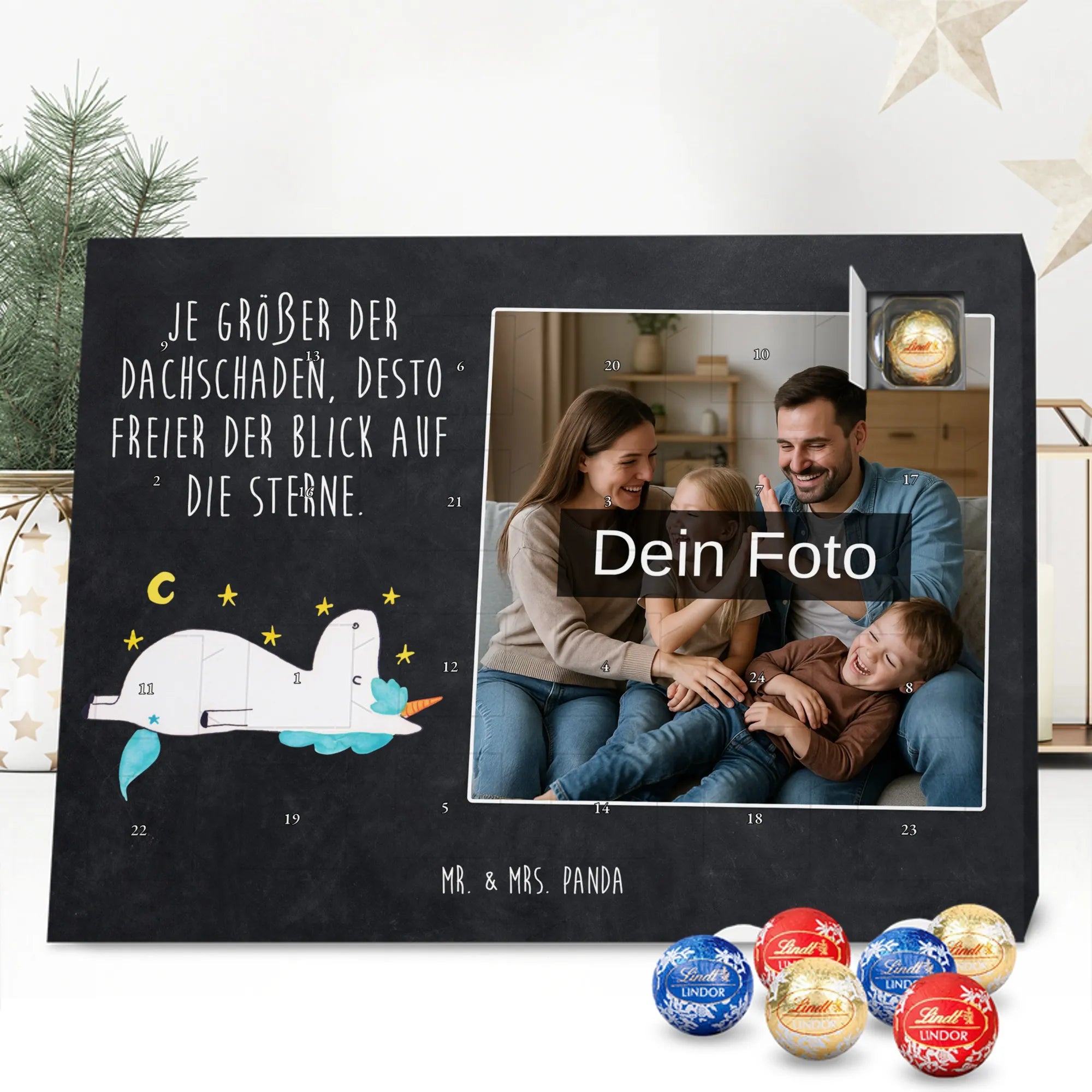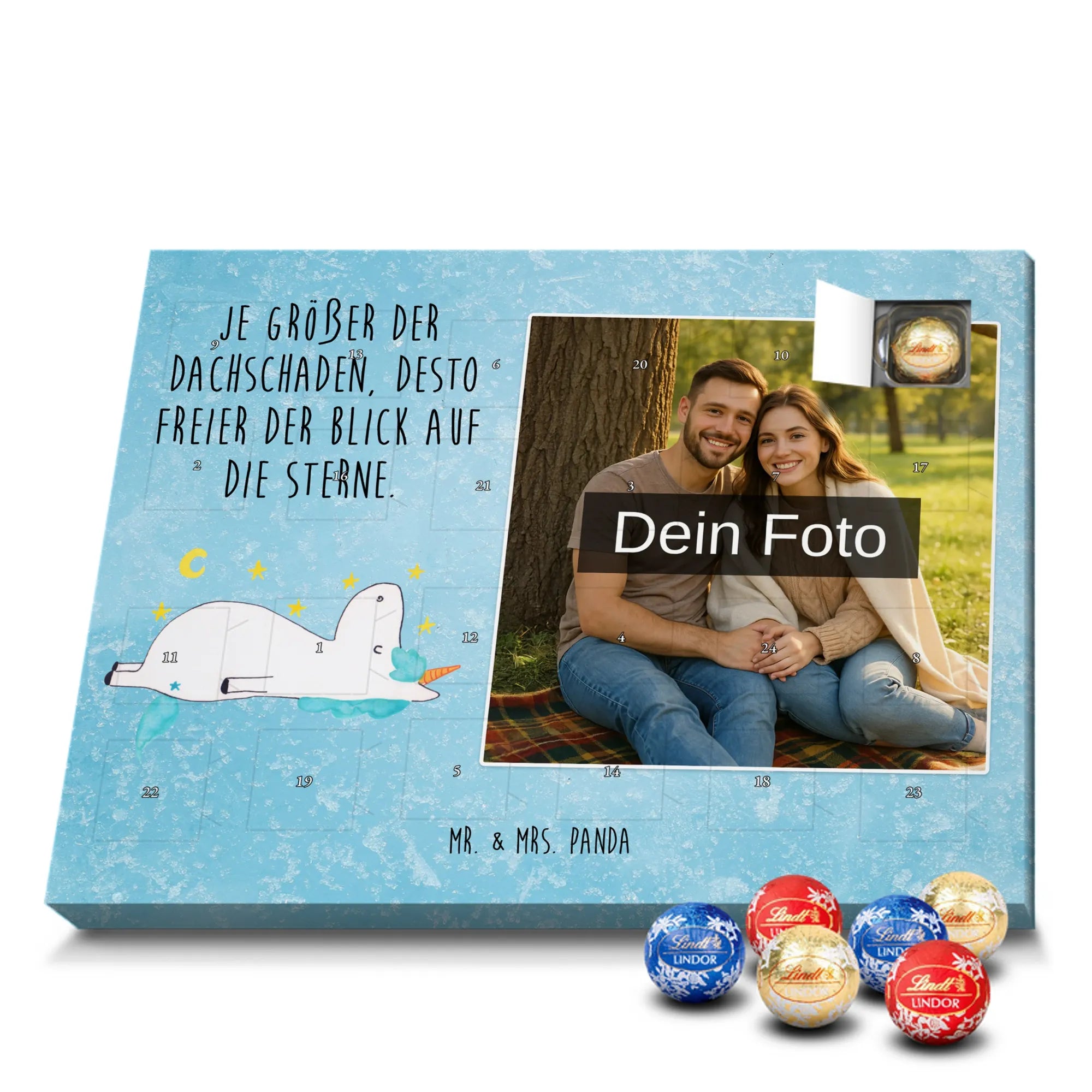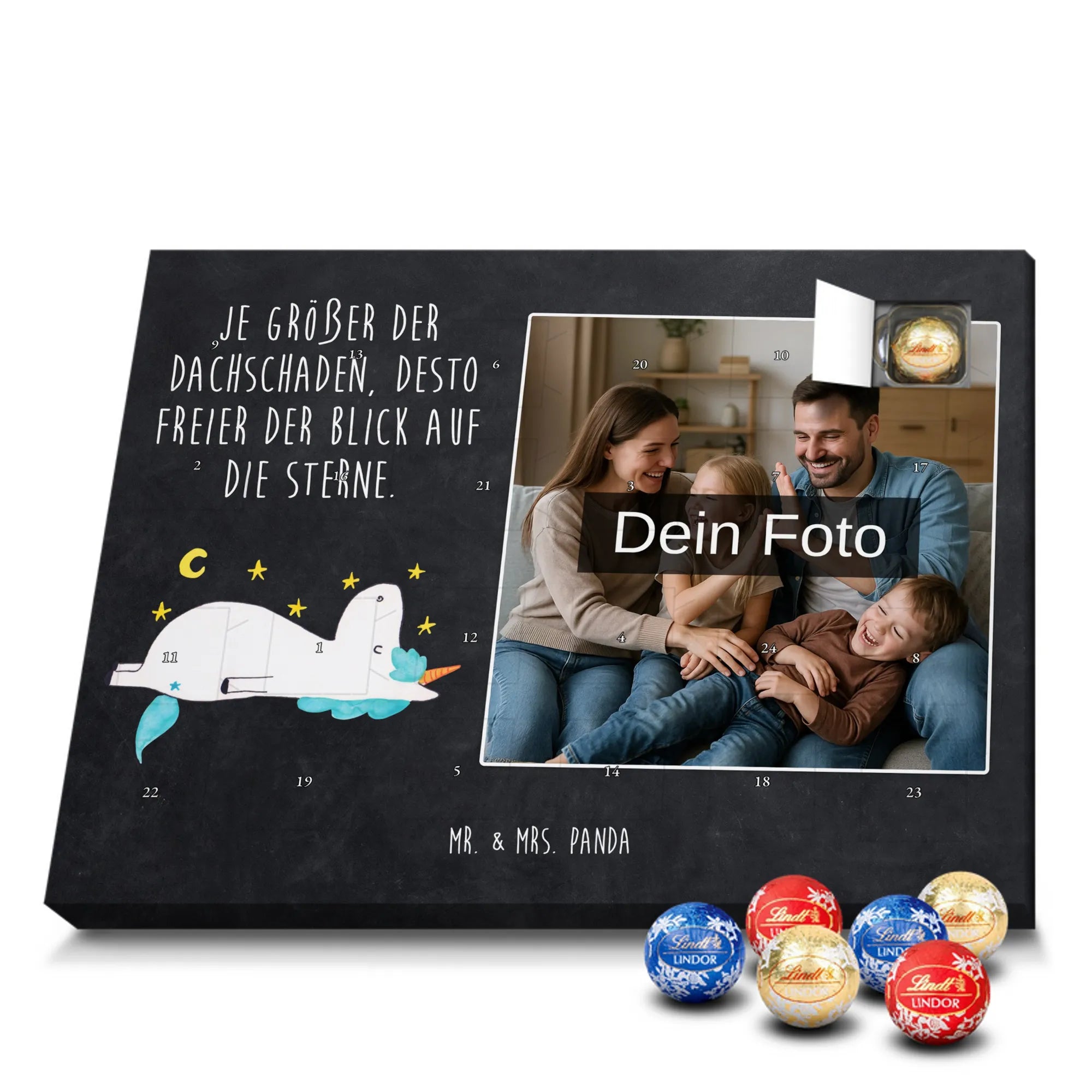 Suchst du ein besonderes Geschenk, das persönlich, zauberhaft und voller Vorfreude ist? Unser Personalisierter Schoko Foto Adventskalender aus der Einhorn - Kollektion von Mr. & Mrs. Panda vereint ein liebevoll handgezeichnetes Einhornmotiv mit deiner eigenen Lieblingsfoto-Erinnerung. Das süße Einhorn blickt verträumt in den Sternenhimmel und trägt den frechen Spruch: „Je größer der Dachschaden, desto freier der Blick auf die Sterne.“ – perfekt für alle, die das Besondere lieben.
