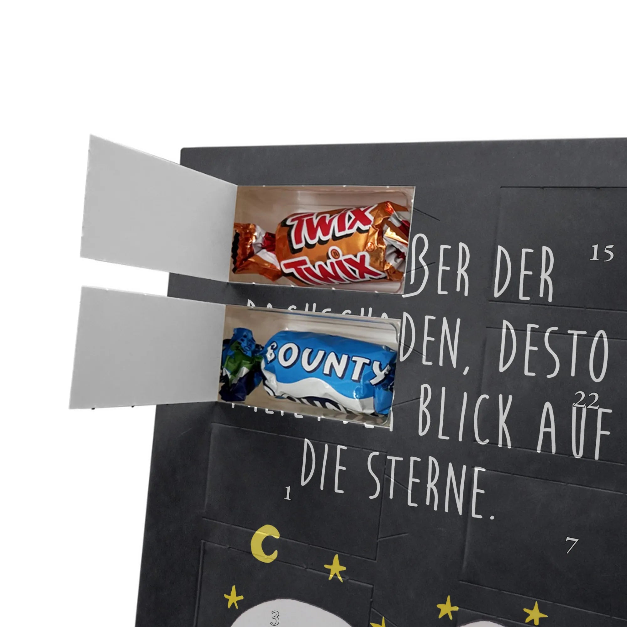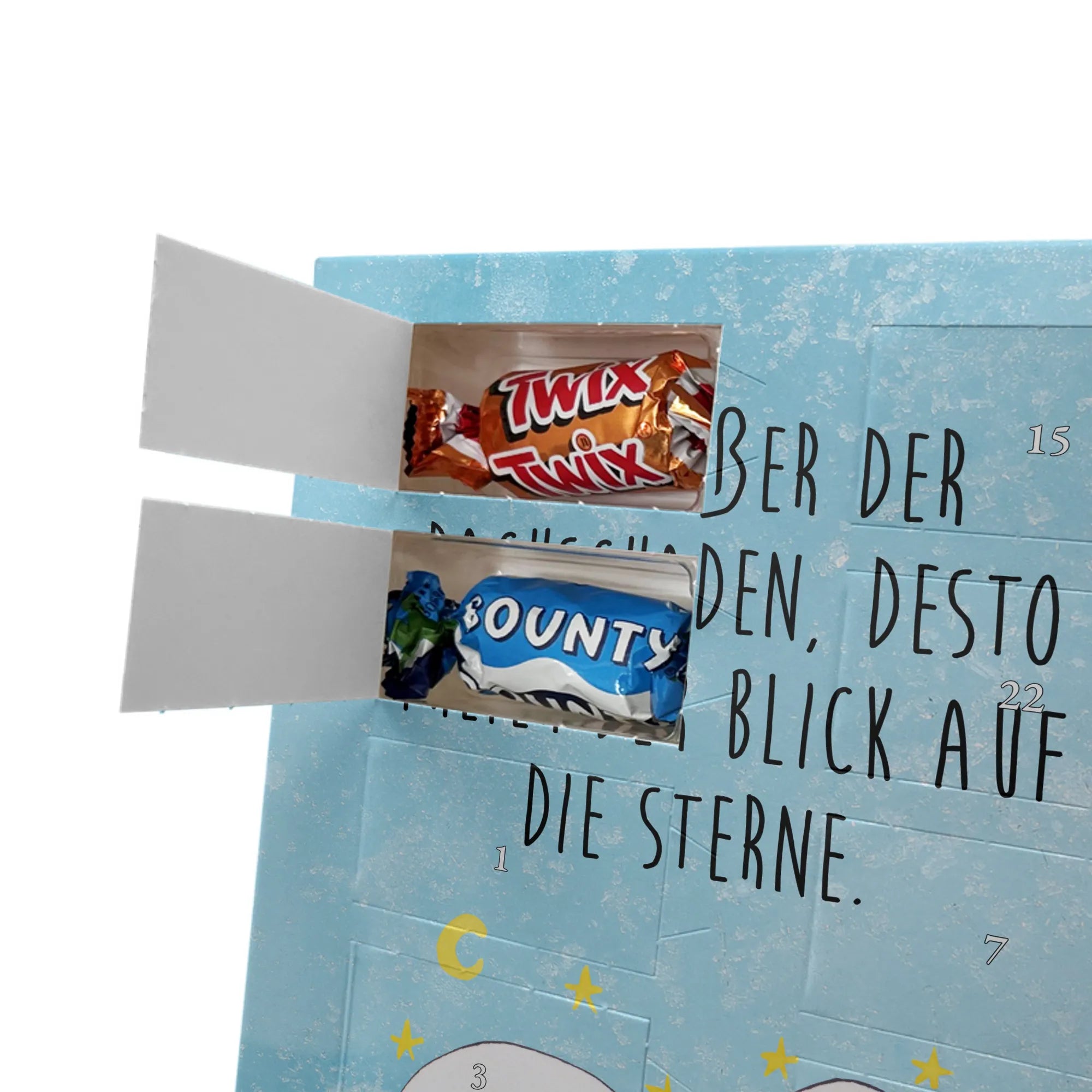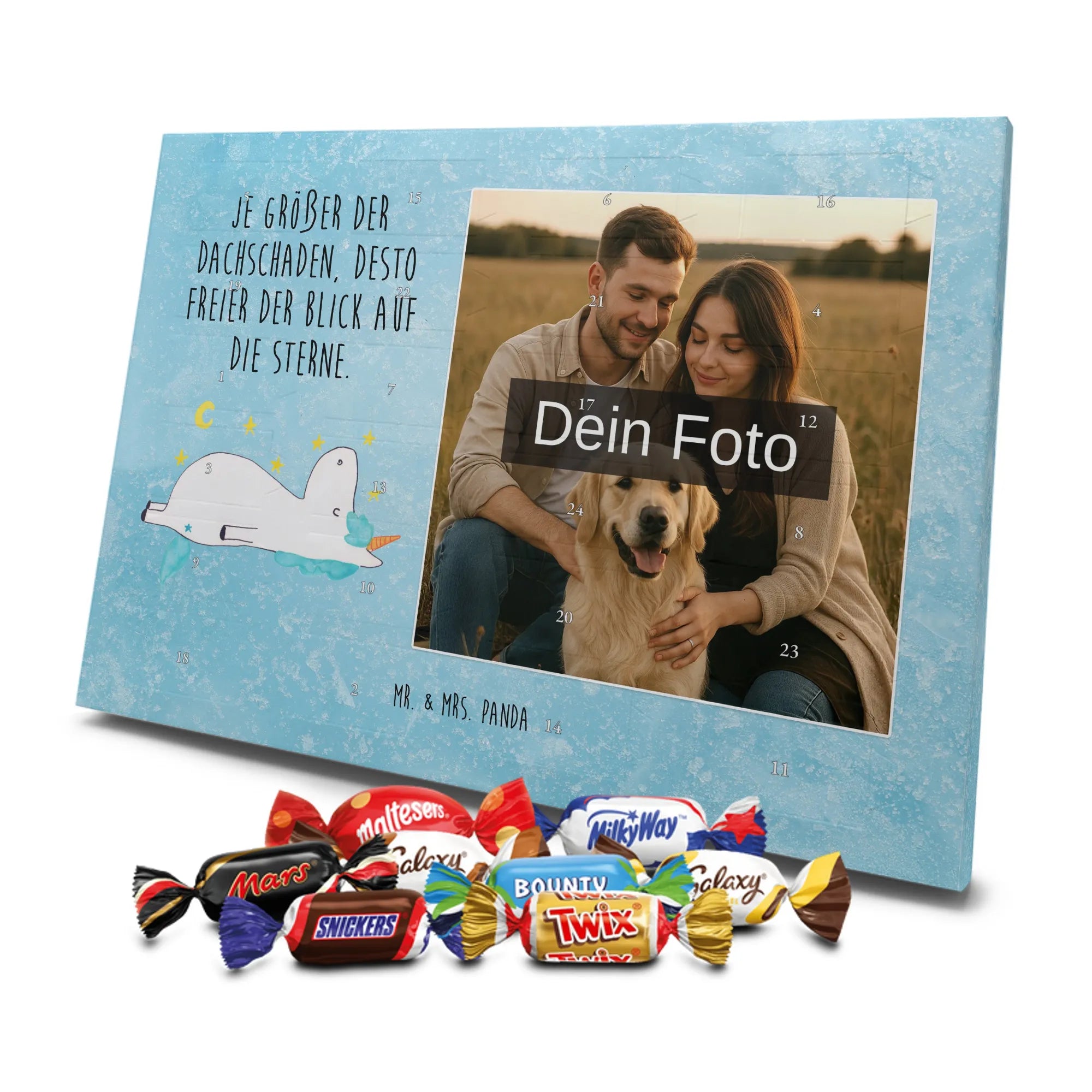 Lustiger Personalisierter Schoko Foto-Adventskalender – das Must-have für eine persönliche Adventszeit von Mr. & Mrs. Panda. Jeder Kalender wird mit unseren charmanten Illustrationen und liebevollen Sprüchen bedruckt, während dein Foto die Vorderseite einzigartig macht. Achte bitte darauf, ein Foto mit guter Qualität und ausreichend hoher Auflösung hochzuladen, damit der Druck gestochen scharf wirkt. Überprüfe den Bildausschnitt, damit wichtige Bereiche nicht verloren gehen. Denk daran, nur Bilder zu verwenden, bei denen du die nötigen Rechte besitzt. Die Verarbeitung ist hochwertig: brillante Druckqualität mit seidenmatter Oberflächenveredelung und bedruckten Seitenflächen. Maße: 325 mm x 225 mm x 27 mm. Du kannst den Kalender aufhängen oder aufstellen – sehr praktisch. Hinweis: Die hochgeladenen Fotos werden nicht nachbearbeitet oder zugeschnitten; Rücknahme bei personalisierten Foto-Artikeln ist ausgeschlossen. Gefüllt ist der Kalender mit Celebrations Schokolade – 24 Stück in 8 verschiedenen Sorten (Maltesers, Mars, Snickers, Twix, Milky Way, Bounty, Galaxy, Galaxy Caramel). Verschenke ein Stück persönlich gestaltete Vorfreude und mache jeden Dezembertag zu etwas Besonderem.