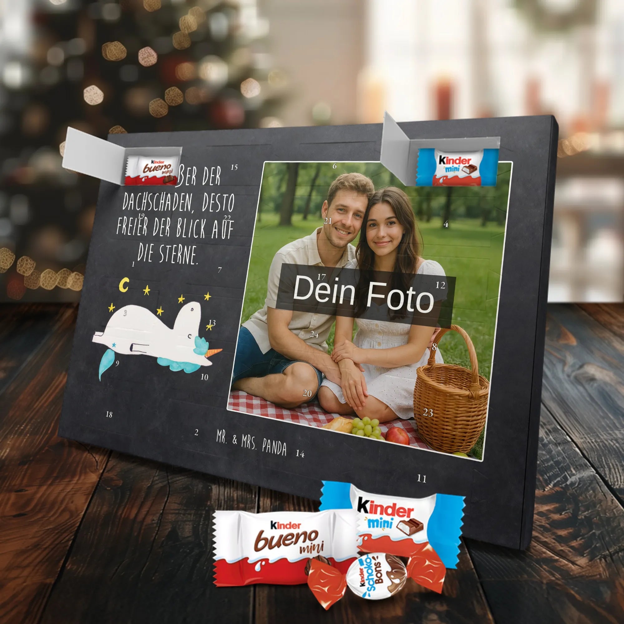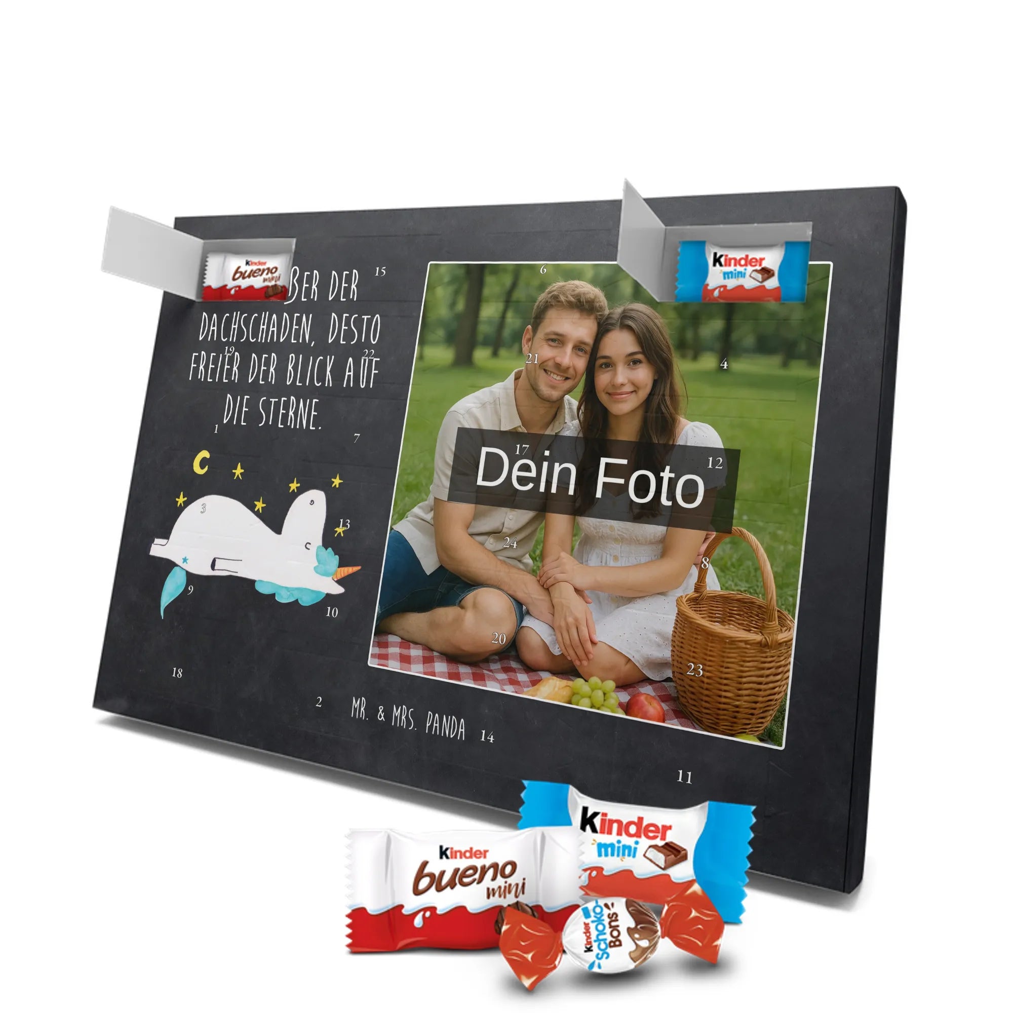 🐼 Personalisierter Schoko-Foto-Adventskalender mit deinem Bild, Mr. & Mrs. Panda Motiven und gefüllt mit kinder® Schokolade.