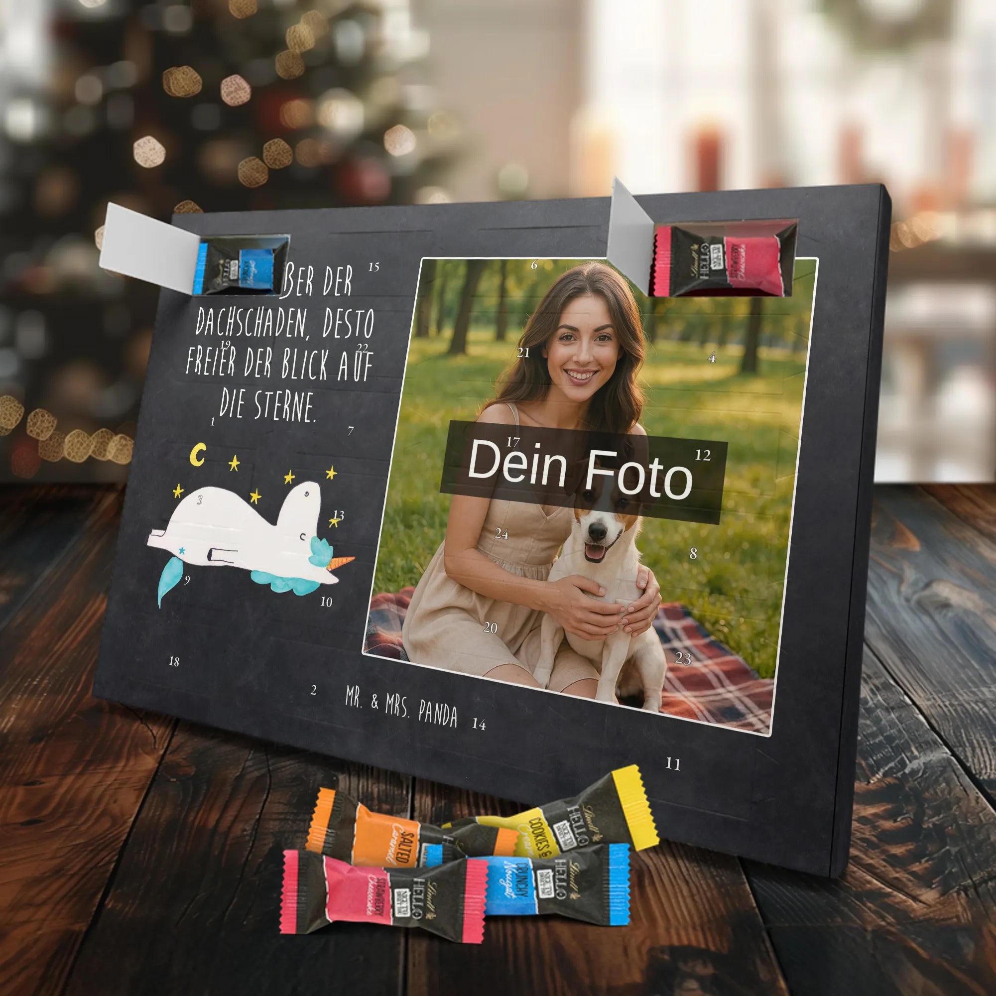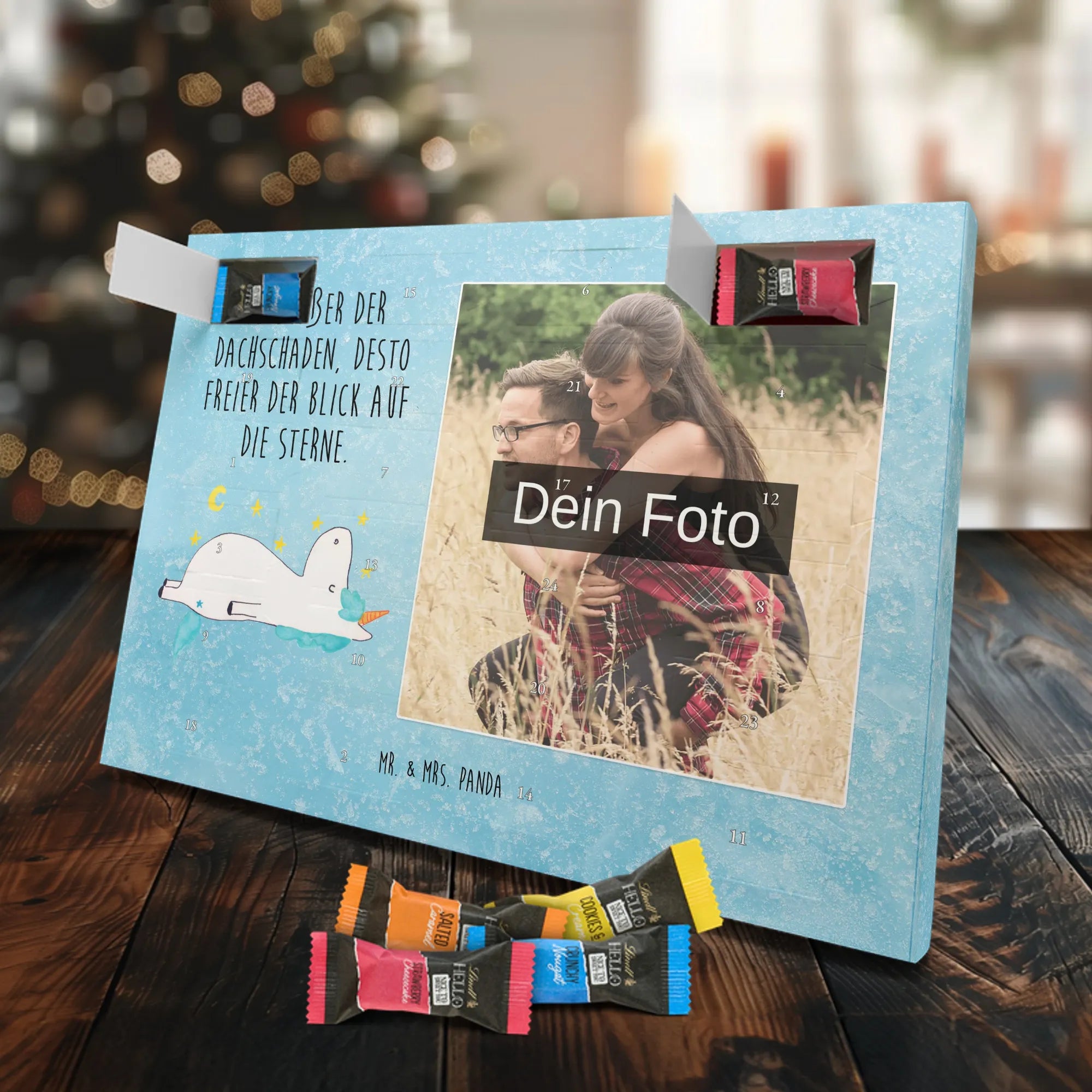 Mach die Adventszeit persönlich mit unserem Personalisiertes Schoko Foto-Adventskalender von Mr. & Mrs. Panda. Dieser Kalender kombiniert dein Lieblingsfoto mit unseren fröhlichen Illustrationen und liebevollen Sprüchen – perfekt als Geschenk für Partner, Familie oder Freunde. Für ein optimales Druckergebnis bitte ein hochauflösendes Bild verwenden und den Bildausschnitt so wählen, dass wichtige Details nicht verloren gehen. Beachte, dass wir Fotos nicht nachbearbeiten oder zuschneiden; lade nur Bilder hoch, für die du die Rechte besitzt. Die hochwertige Verarbeitung beinhaltet eine seidenmatte Oberflächenveredelung und bedruckte Seitenflächen, außerdem ist der Kalender robust und kann aufgehängt oder aufgestellt werden. Maße: 233 mm x 178 mm x 24 mm. Gefüllt mit Lindt Lindor Markenschokolade: 24 einzeln verpackte Kugeln in den Sorten Vollmilch, Feinherb und Weiße Schokolade. Inhaltsstoffe und Allergene sind angegeben; es kann Haselnüsse und Mandeln enthalten. Hinweis: Personalisierte Foto-Artikel sind vom Umtausch ausgeschlossen. Ein süßer, persönlicher Adventsgruß von Mr. & Mrs. Panda.
