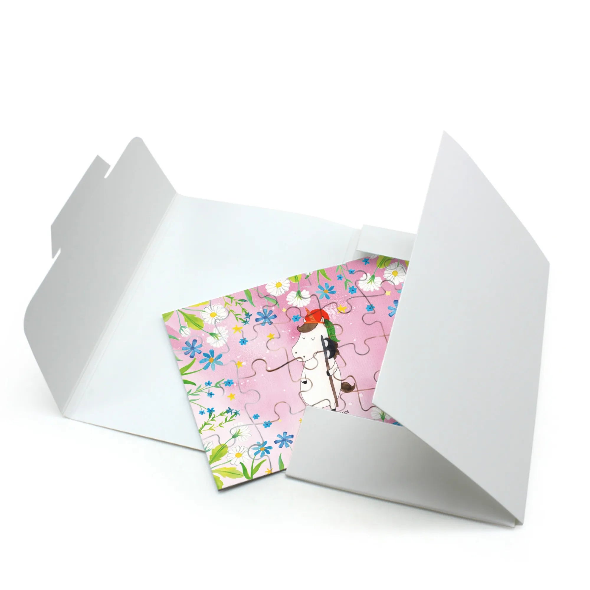 Entdecke die liebevoll gestaltete Einhorn-Welt von Mr. & Mrs. Panda. Unser Puzzle „Einhorn Bube“ aus der Einhorn - Kollektion zeigt ein verspieltes Einhorn mit Bubenhelm, einem Stock in der Hand und einem charmanten, kindlichen Ausdruck. Das Motiv wurde von Mrs. Panda per Aquarell handgezeichnet und strahlt dank brillant seidenmattem Aufdruck in satten, pastellroten Farben.