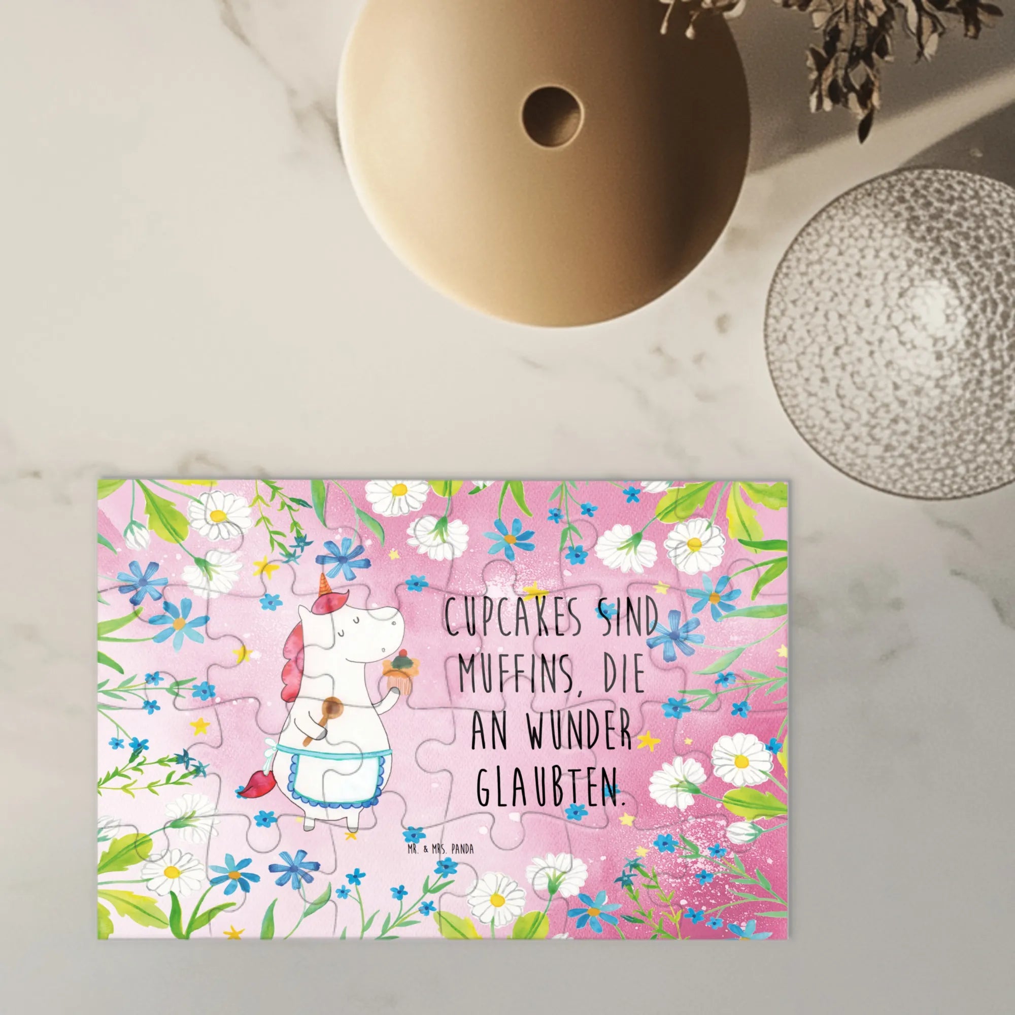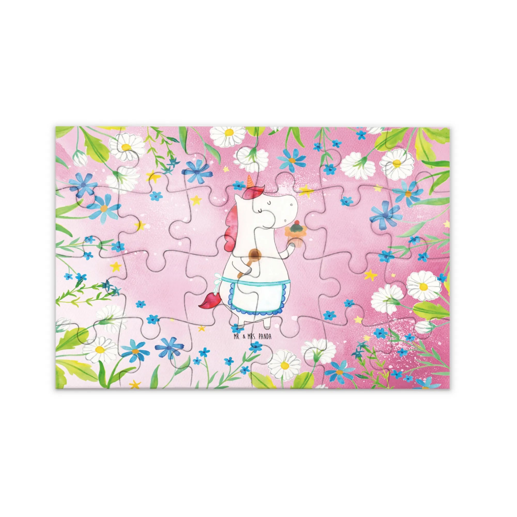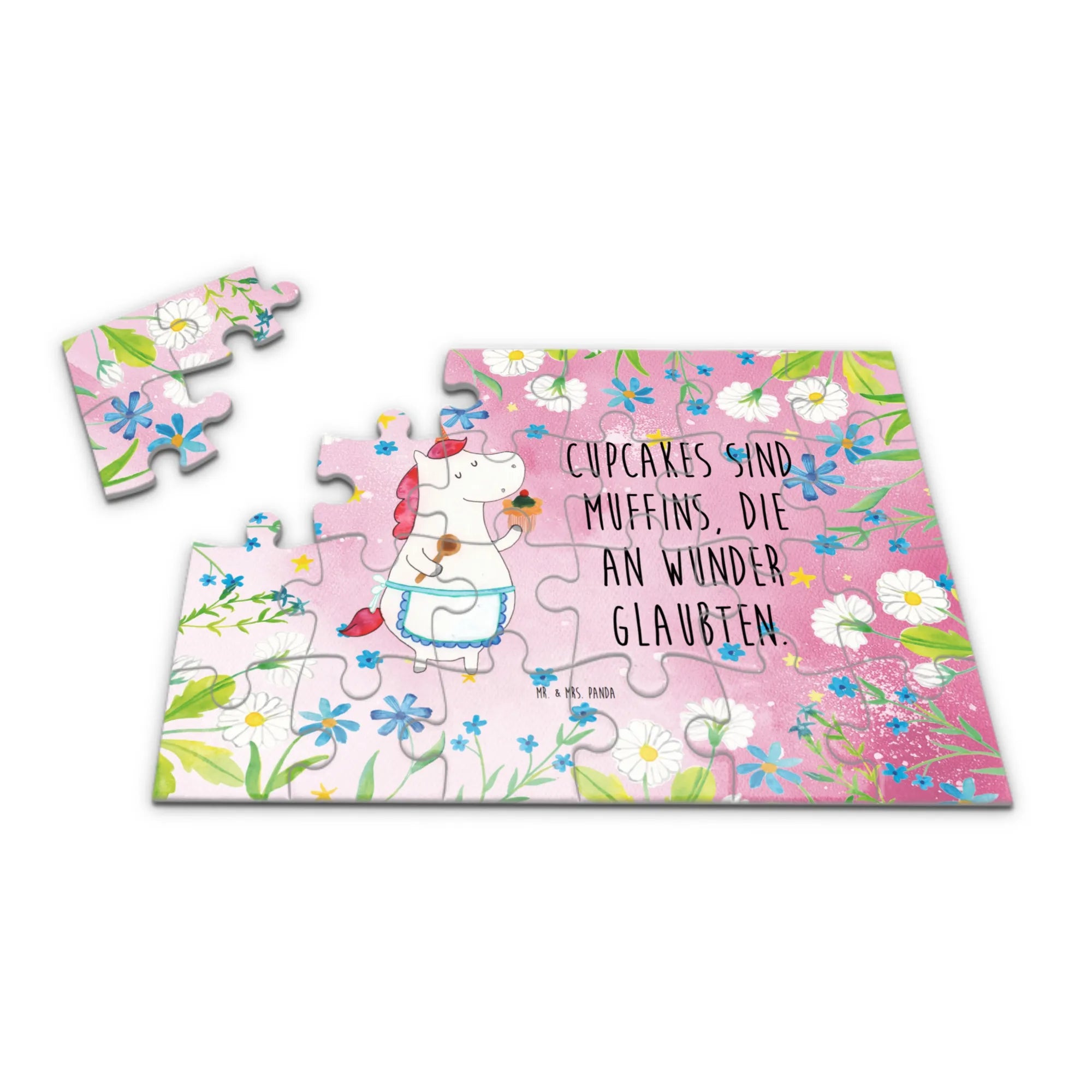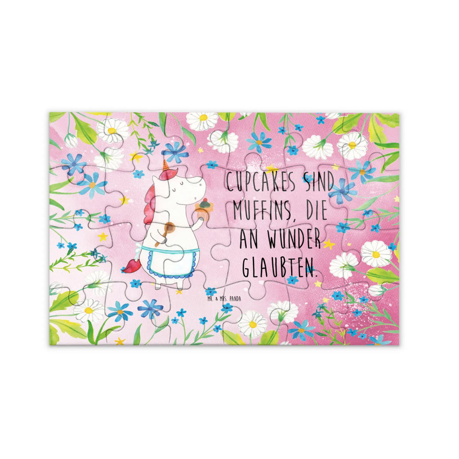 Du liebst Einhörner, Backen und schöne Details? Unser Einhorn Küchenfee Puzzle aus der Einhorn - Kollektion von Mr. & Mrs. Panda vereint all das in einem liebevoll gestalteten Motiv. Das süße Einhorn trägt Kochmütze und Schürze, umgeben von Torten, Muffins und dem fröhlichen Spruch „Cupcakes sind Muffins, die an Wunder glaubten.“