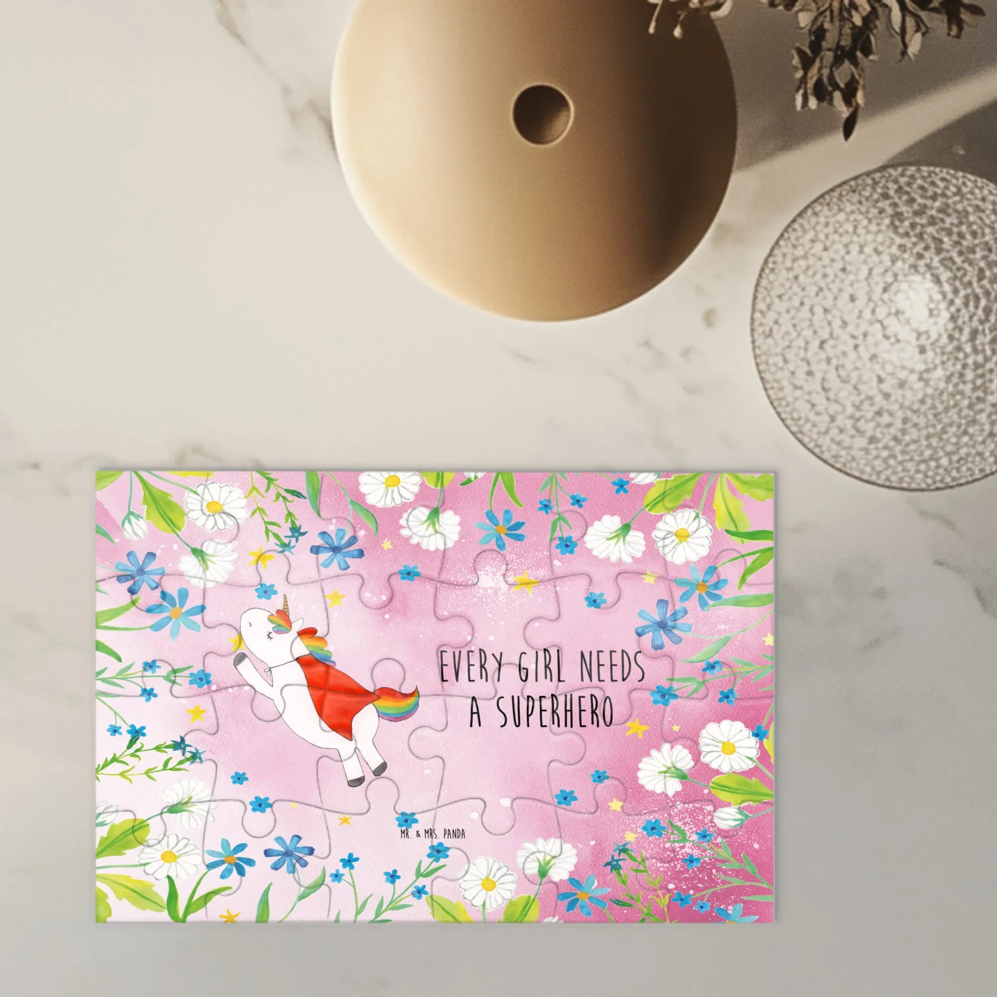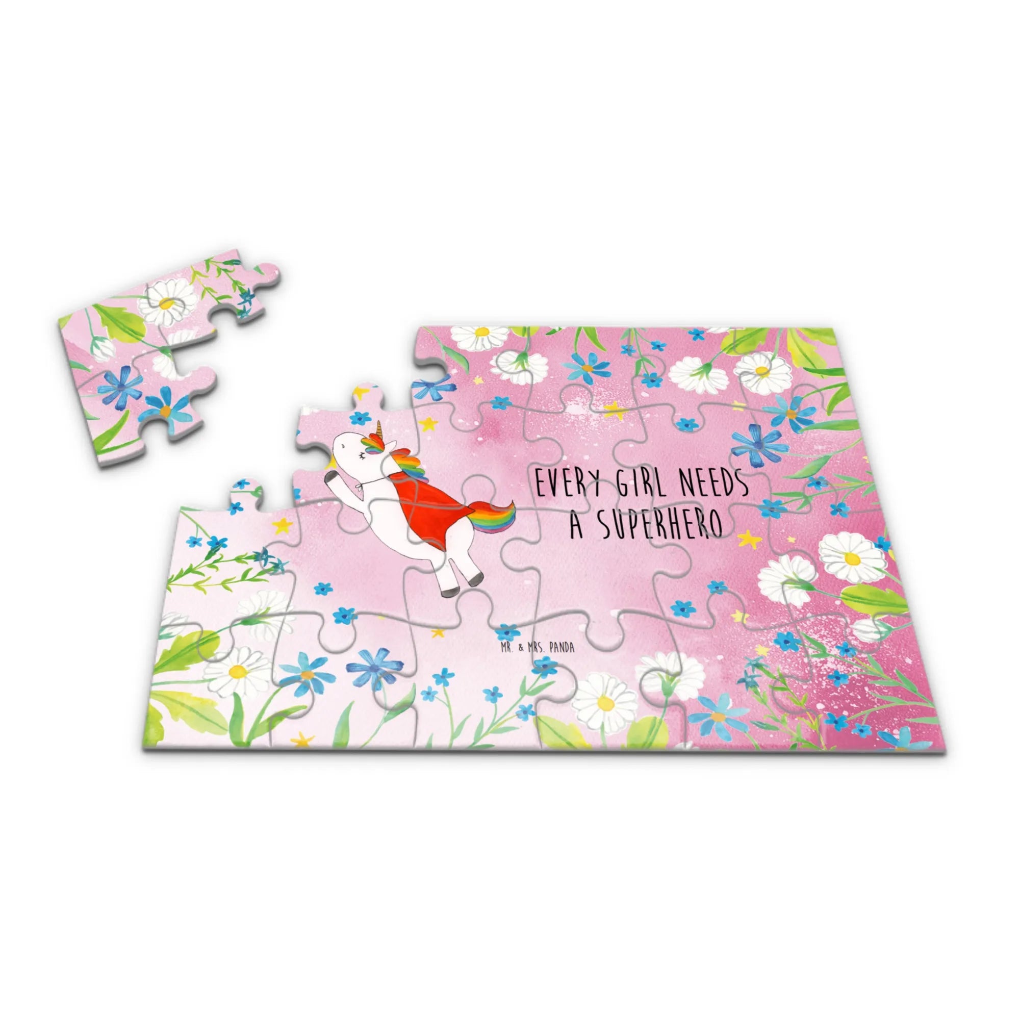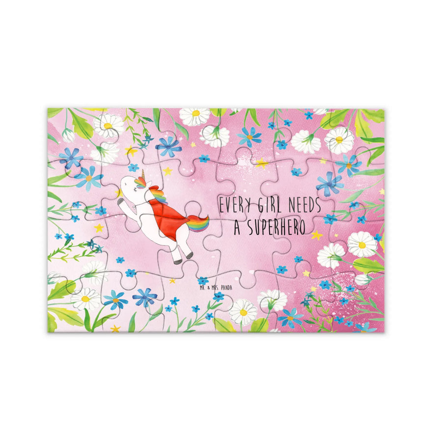 Dieses fröhliche Puzzle aus der Einhorn - Kollektion ist das perfekte Geschenk für Mädchen, Einhorn-Liebhaberinnen und deine beste Freundin. Das süße Super-Einhorn trägt den charmanten Spruch „Every girl needs a superhero“ und zaubert jedem Betrachter ein Lächeln ins Gesicht. Die liebevollen Aquarell-Details stammen aus Mrs. Panda's Feder und machen das Motiv einzigartig und zart.