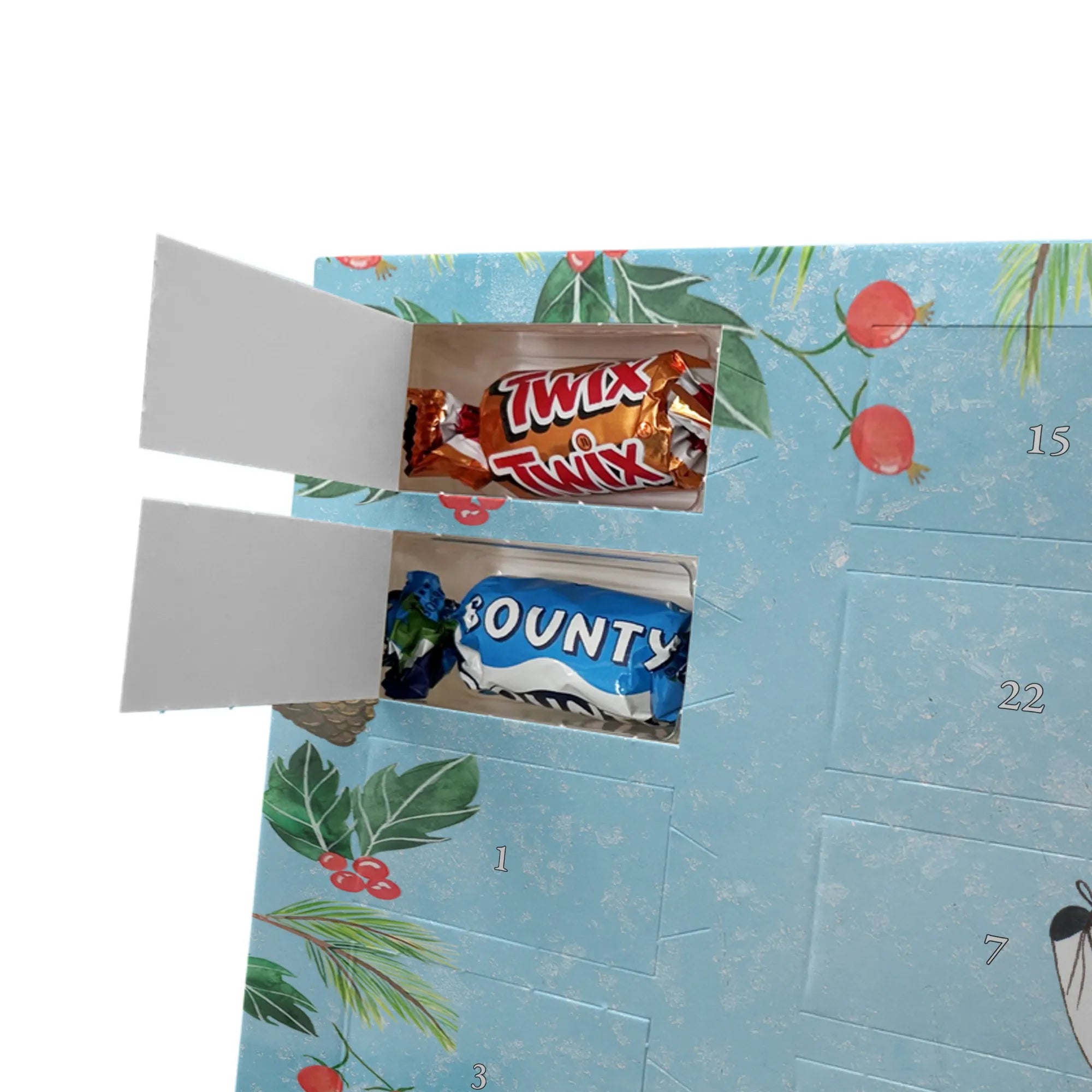 Unser Schoko Adventskalender von Mr. & Mrs. Panda bringt dir und deinen Lieben jede Menge Vorfreude und zauberhafte Momente in die Adventszeit. Der Kalender ist liebevoll bedruckt mit wunderschönen Motiven und frechen Sprüchen im typischen Mr. & Mrs. Panda Stil – ein echter Blickfang auf dem Tisch oder an der Wand. Die brillante Druckqualität kombiniert mit einer seidenmatten Oberflächenveredelung sorgt für edle Farben und ein angenehmes Gefühl beim Anfassen. Auch die Seitenflächen sind bedruckt, sodass der Kalender von allen Seiten hübsch aussieht. Er ist nicht personalisierbar, dafür aber in seiner Gestaltung rundum stimmig. Gefüllt ist der Adventskalender mit 24 hochwertigen Celebrations-Füllungen in acht verschiedenen Sorten: Maltesers, Mars, Snickers, Twix, Milky Way, Bounty, Galaxy und Galaxy Caramel — so ist für jede Naschkatze etwas dabei. Die Besonderheit: Du kannst den Kalender entweder aufstellen oder dank rückseitiger Aufhängung an die Wand hängen. Maße: 325 mm x 225 mm x 27 mm. Ein liebevolles Geschenk für Familie, Freunde oder einfach für dich selbst, das kleine tägliche Glücksmomente schenkt und die Adventszeit versüßt.