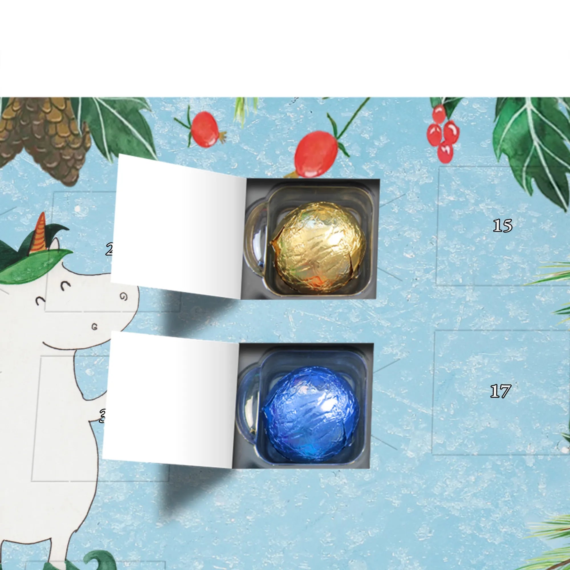 Wunderschöner Schokoladen-Adventskalender von Mr. & Mrs. Panda – süßes Design trifft hochwertige Verarbeitung. Unser Schokoladen-Adventskalender ist bedruckt mit wunderschönen Motiven & Sprüchen von Mr. & Mrs. Panda und nicht personalisierbar, dafür aber mit liebevollen Details gestaltet. Die brillante Druckqualität mit seidenmatter Oberflächenveredelung verleiht dem Kalender ein edles Finish, und auch die Seitenflächen sind bedruckt für einen rundum stimmigen Look. Maße: 233 mm x 178 mm x 24 mm. Die Konstruktion erlaubt sowohl das Aufstellen als auch das Aufhängen – Besonderheit: kann aufgehängt oder aufgestellt werden. Gefüllt mit MARKENNAMEN Schokolade und mit leckeren Schokoladenkugeln bestückt, ist jeder Dezembertag eine kleine Belohnung. Bitte lies die besonderen Hinweise: (Kann Spuren von Haselnüssen, Mandeln, Gluten und Soja enthalten!), kühl und trocken lagern. Ideal als Geschenk, Adventsdekoration oder süße Überraschung für Freunde und Familie. Mr. & Mrs. Panda wünscht dir eine gemütliche und genussvolle Adventszeit!