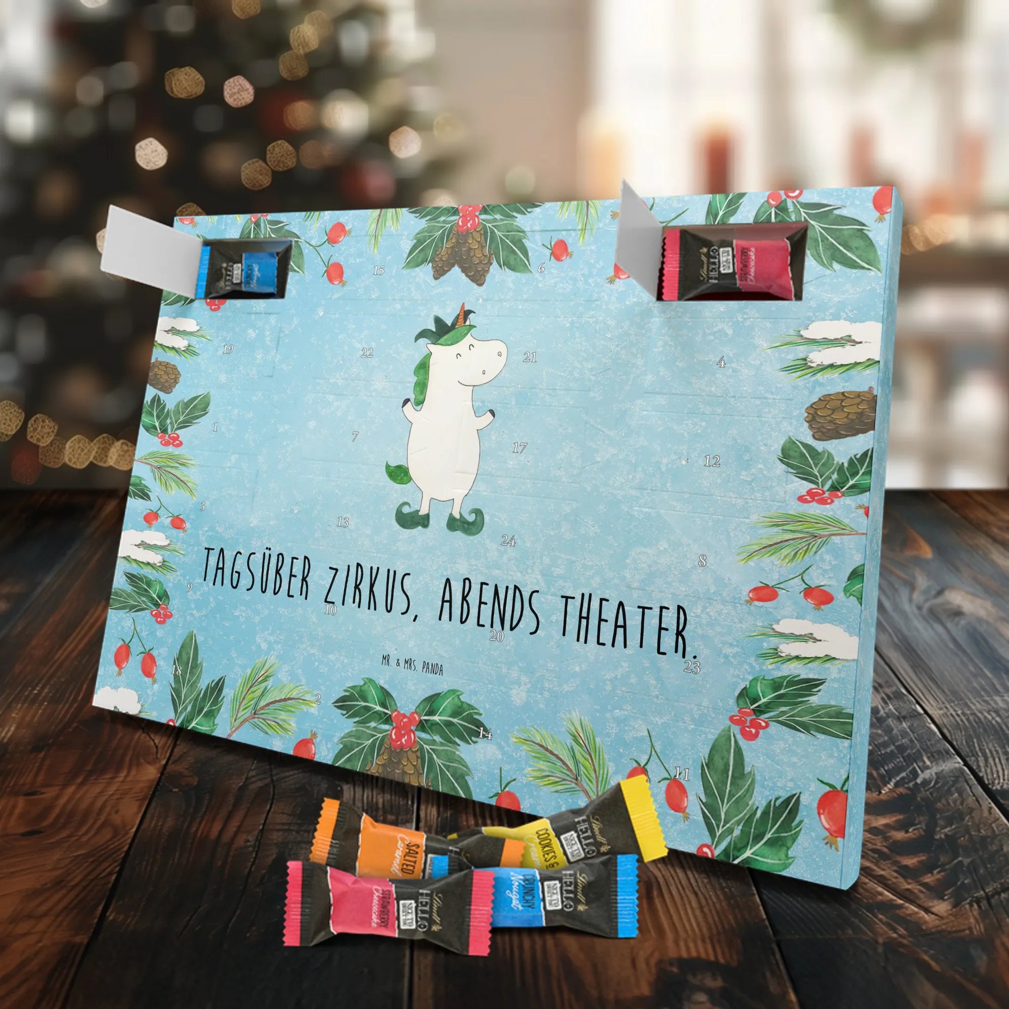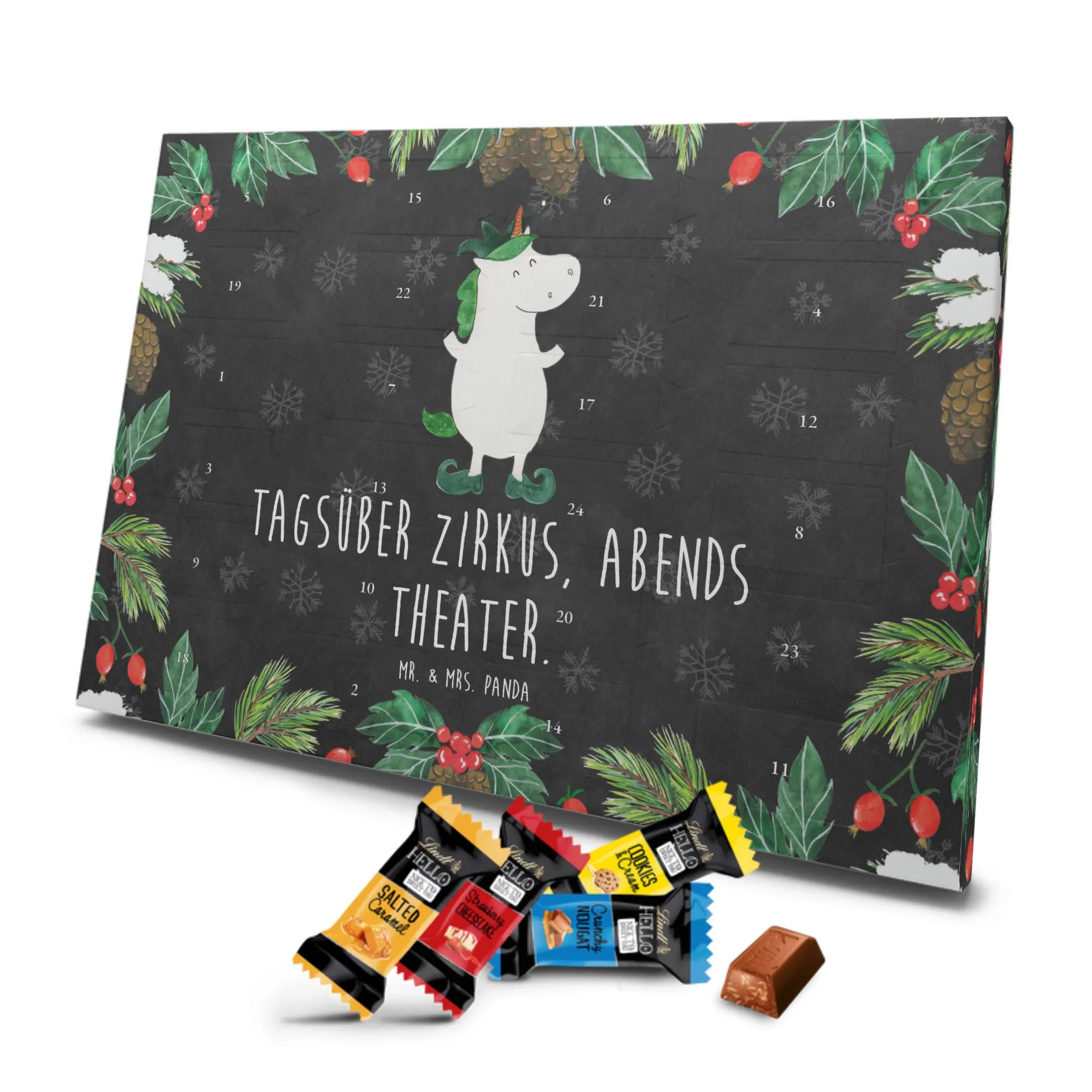 Unser Adventskalender Schokolade von Mr. & Mrs. Panda bringt dir jeden Tag eine kleine Freude. Das Design ist liebevoll bedruckt mit unseren typischen Motiven und lustigen Sprüchen – ein echter Blickfang in deinem Zuhause. Der Kalender ist nicht personalisierbar, überzeugt aber durch brillante Druckqualität und seidenmatte Oberflächenveredelung. Zusätzlich sind die Seitenflächen bedruckt, sodass das Motiv rundum zur Geltung kommt. Maße: 325 mm x 225 mm x 27 mm. Dank seines cleveren Aufhängemechanismus kannst du ihn entweder an die Wand hängen oder frei aufstellen. Gefüllt mit Lindt Hello Schokolade: 24 einzeln verpackte Schokoladen Mini Sticks in den Sorten Karamell-Schokoladenkuchen, Kekse, Knuspriger Nougat und Erdbeer-Cheesecake. Zutatenliste enthält u. a. Zucker, Kakaomasse, Vollmilchpulver, Haselnüsse; Allergene: Milcheiweiß, Milchzucker, Soja, Weizen und Haselnüsse, kann Mandeln und andere Schalenfrüchte enthalten. Perfekt als Geschenk für Kinder, Freunde oder als kleines Mitbringsel in der Adventszeit.