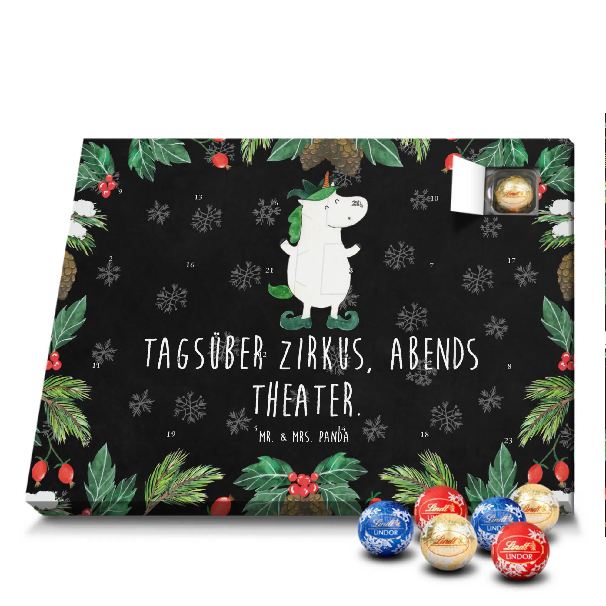 Unser zauberhafter Schoko Adventskalender von Mr. & Mrs. Panda bringt dir die süßeste Vorfreude auf Weihnachten! Dieser liebevoll gestaltete Adventskalender ist bedruckt mit wunderschönen Motiven & Sprüchen von Mr. & Mrs. Panda und ist nicht personalisierbar – dafür aber ein perfektes Geschenk für Freunde und Familie. Brillante Druckqualität mit seidenmatter Oberflächenveredelung sorgt für ein edles Finish, und die bedruckten Seitenflächen machen den Kalender von allen Seiten zu einem Hingucker. Maße: 233 mm x 178 mm x 24 mm. Besonderheit: kann aufgehängt oder aufgestellt werden, je nachdem, wie du ihn präsentieren möchtest. Gefüllt mit Lindt Lindor: 24 einzeln verpackte Markenschokoladen Kugeln in drei verschiedenen Sorten – Vollmilch, Feinherb und Weiße Schokolade – sorgen für abwechslungsreichen Genuss in der Adventszeit. Zutaten: Zucker, pflanzliches Fett (Kokosnuss, Palmkern), Kakaobutter, Vollmilchpulver, Kakaomasse, Milchzucker, Magermilchpulver, Butterreinfett, Emulgator (Sojalecithin), Gerstenmalzextrakt, Aromen. Besondere Hinweise: Kann Haselnüsse und Mandeln enthalten. Unser Schoko Adventskalender verbindet niedliches Design mit hochwertiger Füllung – ideal zum Verschenken oder selbst Naschen. Mr. & Mrs. Panda wünschen dir eine fröhliche und leckere Adventszeit!