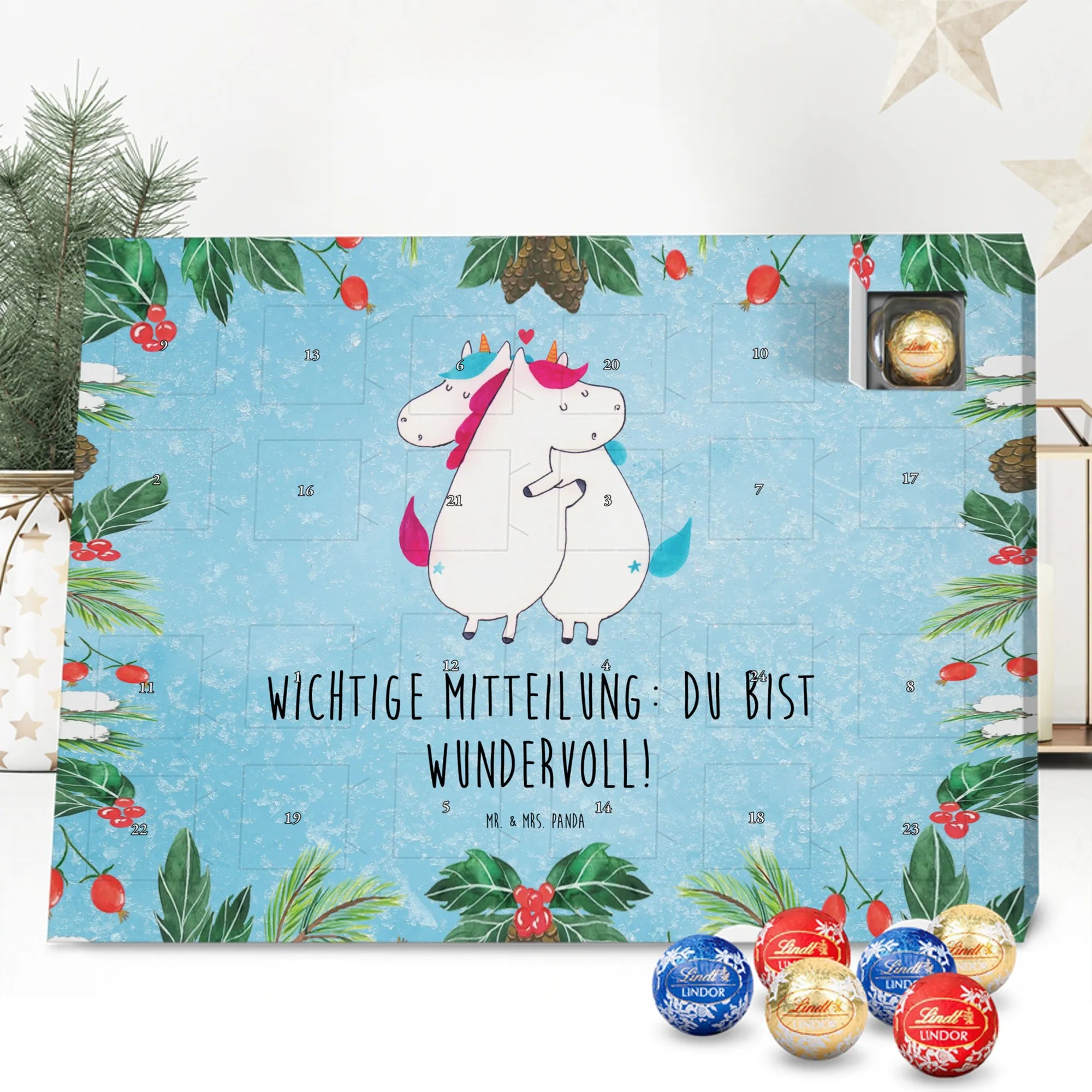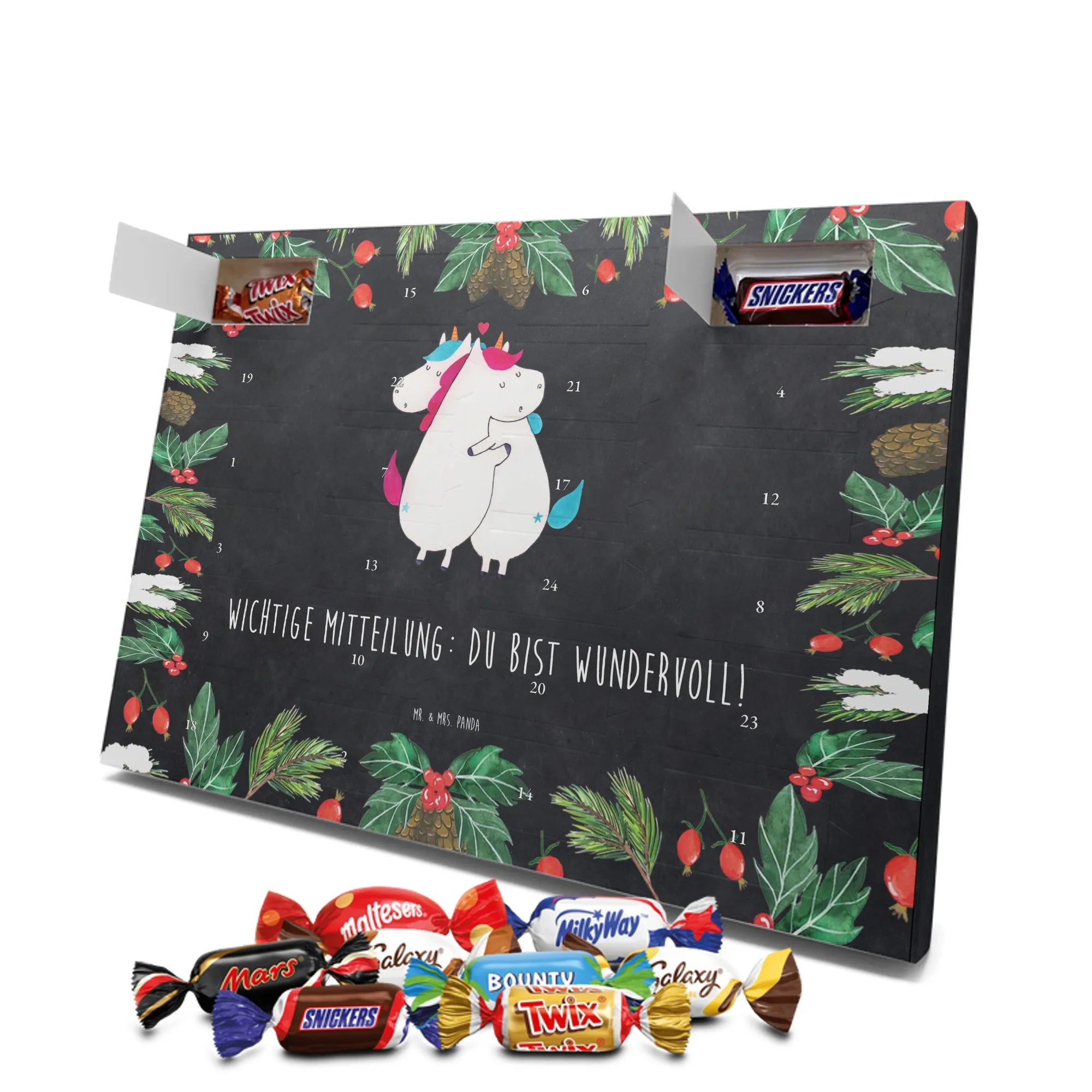 Schoko Adventskalender „Einhorn Mitteilung“ – ein zauberhaftes Geschenk aus der Einhorn - Kollektion von Mr. & Mrs. Panda. Auf einer hübschen Kreidetafel-Optik kuscheln zwei Einhörner und überbringen die herzerwärmende Botschaft: Wichtige Mitteilung: du bist wundervoll! 🦄💌 Dieser Adventskalender ist die perfekte Mischung aus Humor, Liebe und süßem Genuss – ideal für Partner, Ehe, Freundinnen, Kollegen oder einfach für alle Einhorn-Fans.