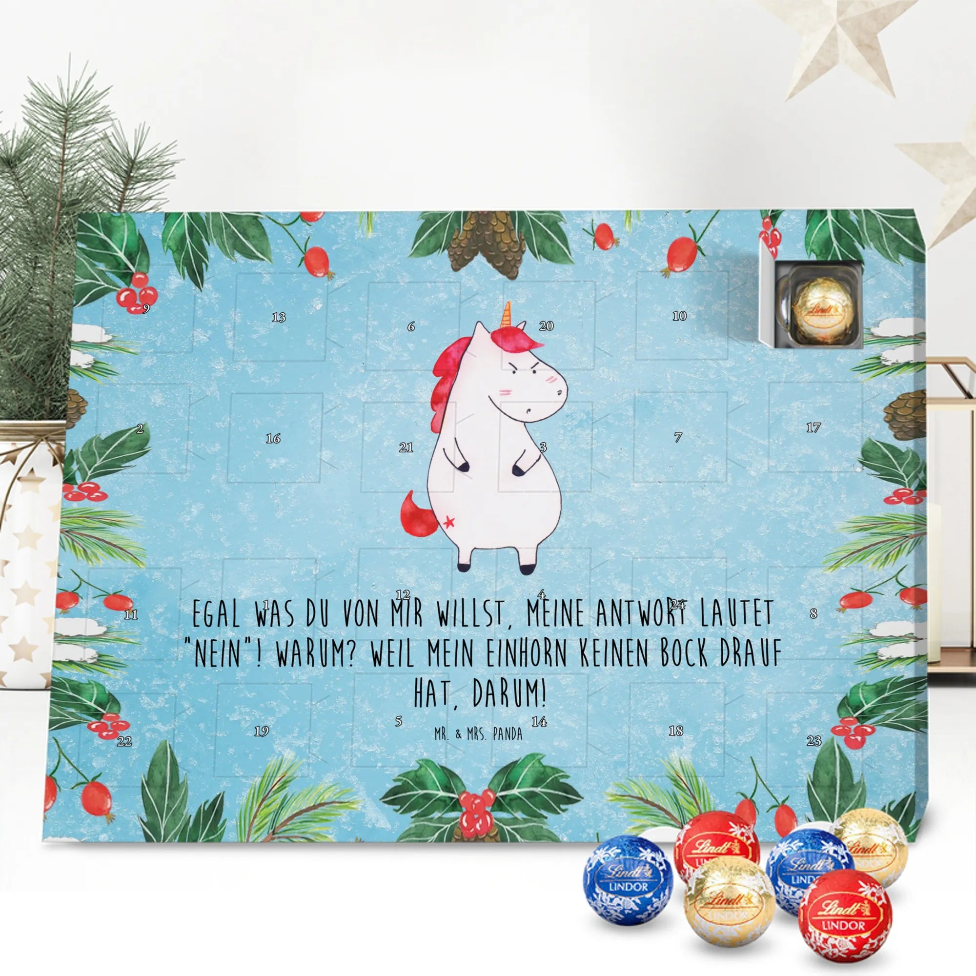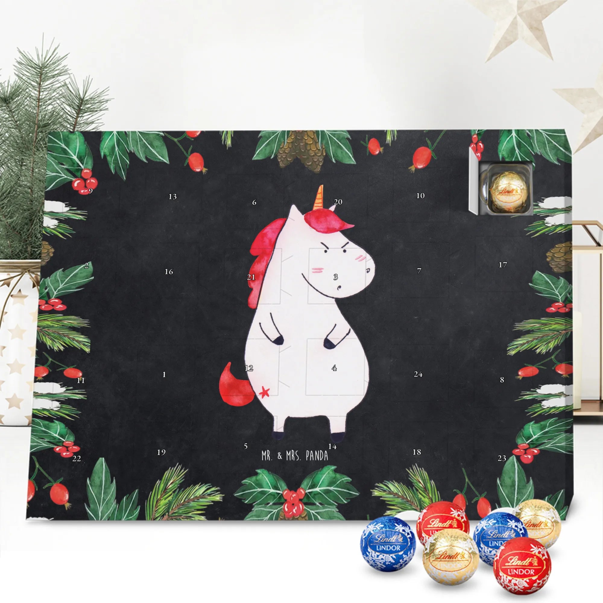 Der Schokolade Adventskalender von Mr. & Mrs. Panda ist ein liebevoll gestaltetes Highlight für deine Adventsdeko. Bedruckt mit wunderschönen Motiven & Sprüchen, nicht personalisierbar, bietet er eine charmante Optik für jeden Haushalt. Die brillante Druckqualität mit seidenmatter Oberflächenveredelung sorgt für edle Akzente, und die bedruckten Seitenflächen machen den Kalender rundum schön. Maße: 233 mm x 178 mm x 24 mm. Besonderheit: kann aufgehängt oder aufgestellt werden – richtig praktisch! Gefüllt mit Lindt Lindor: 24 einzeln verpackte Markenschokoladen Kugeln in drei köstlichen Varianten – Vollmilch, Feinherb und Weiße Schokolade – sorgen für tägliche Freuden. Zutaten: Zucker, pflanzliches Fett (Kokosnuss, Palmkern), Kakaobutter, Vollmilchpulver, Kakaomasse, Milchzucker, Magermilchpulver, Butterreinfett, Emulgator (Sojalecithin), Gerstenmalzextrakt, Aromen. Besondere Hinweise: Kann Haselnüsse und Mandeln enthalten. Ob als Geschenk oder für dich selbst – dieser Kalender ist eine wunderbare Mischung aus Design und feiner Markenschokolade.