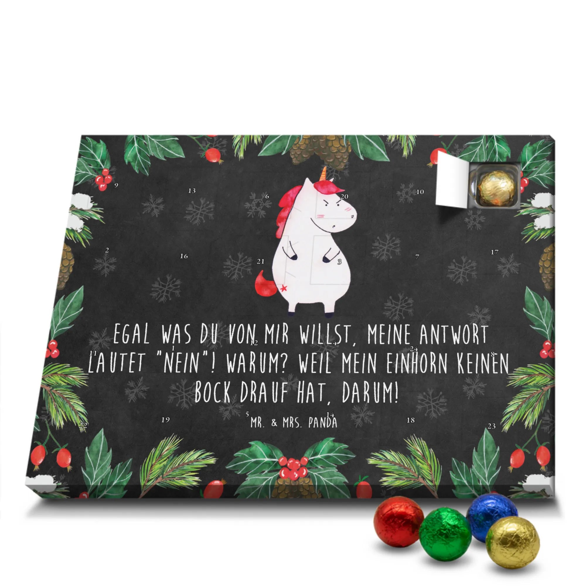 Wunderschöner Schokoladen-Adventskalender von Mr. & Mrs. Panda – süßes Design trifft hochwertige Verarbeitung. Unser Schokoladen-Adventskalender ist bedruckt mit wunderschönen Motiven & Sprüchen von Mr. & Mrs. Panda und nicht personalisierbar, dafür aber mit liebevollen Details gestaltet. Die brillante Druckqualität mit seidenmatter Oberflächenveredelung verleiht dem Kalender ein edles Finish, und auch die Seitenflächen sind bedruckt für einen rundum stimmigen Look. Maße: 233 mm x 178 mm x 24 mm. Die Konstruktion erlaubt sowohl das Aufstellen als auch das Aufhängen – Besonderheit: kann aufgehängt oder aufgestellt werden. Gefüllt mit MARKENNAMEN Schokolade und mit leckeren Schokoladenkugeln bestückt, ist jeder Dezembertag eine kleine Belohnung. Bitte lies die besonderen Hinweise: (Kann Spuren von Haselnüssen, Mandeln, Gluten und Soja enthalten!), kühl und trocken lagern. Ideal als Geschenk, Adventsdekoration oder süße Überraschung für Freunde und Familie. Mr. & Mrs. Panda wünscht dir eine gemütliche und genussvolle Adventszeit!