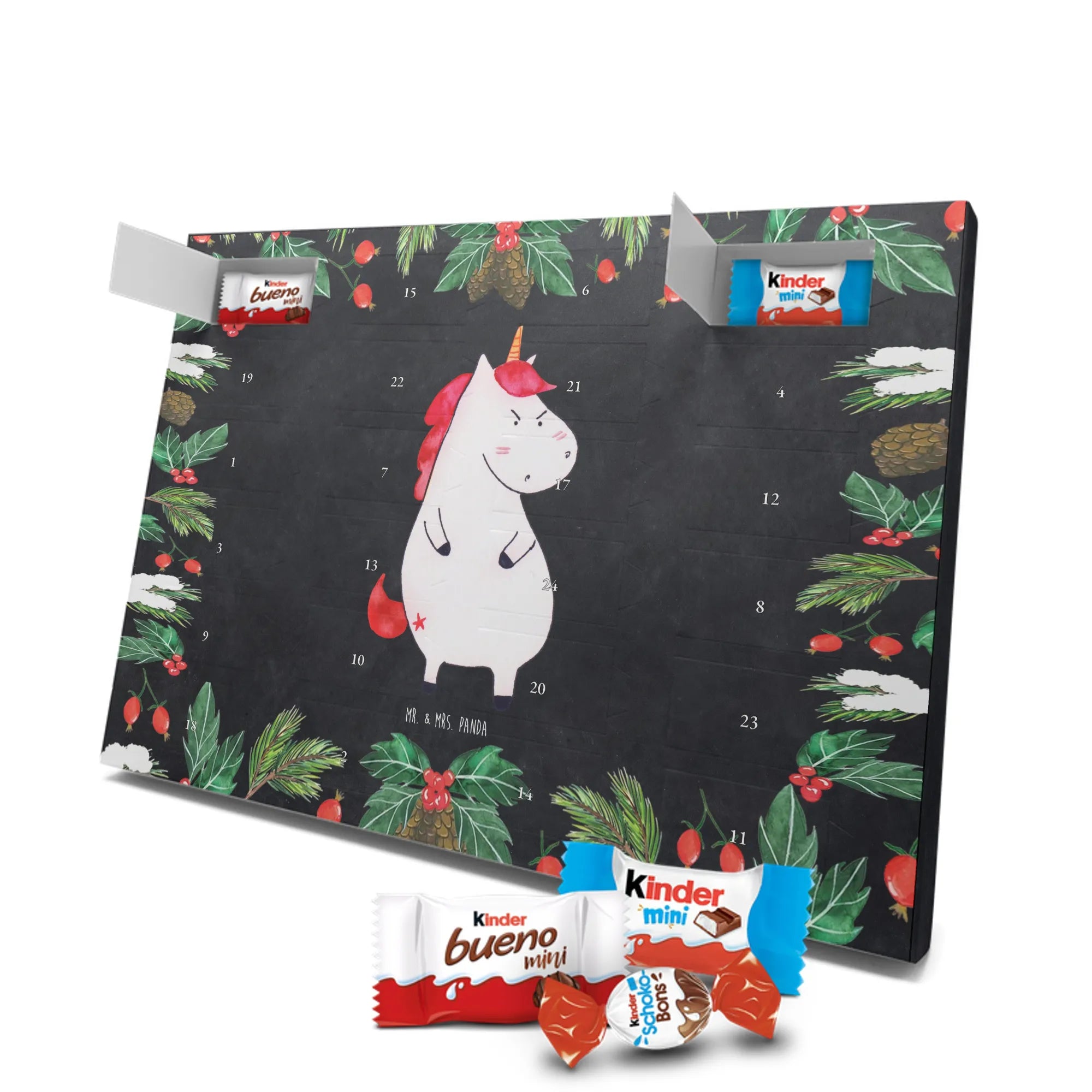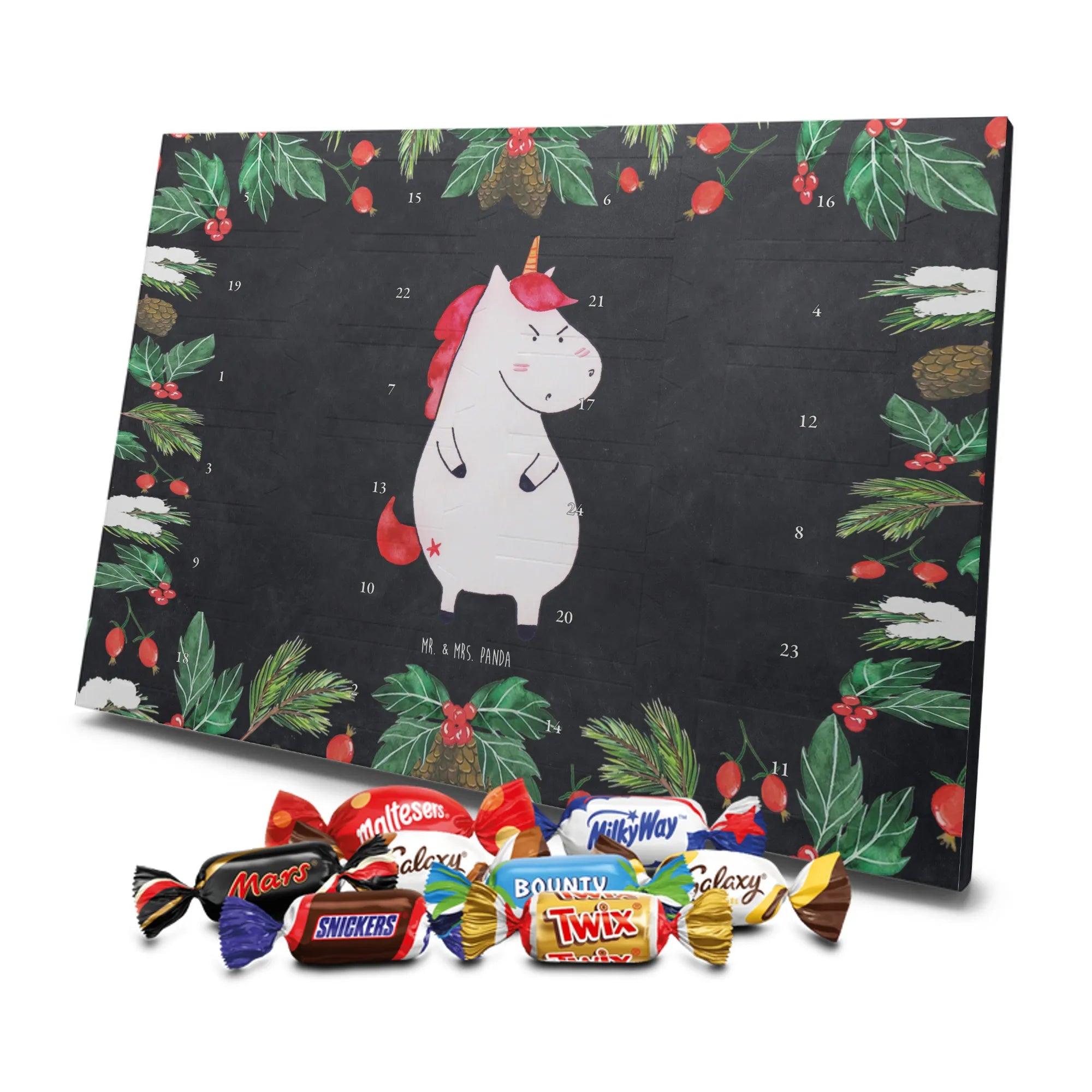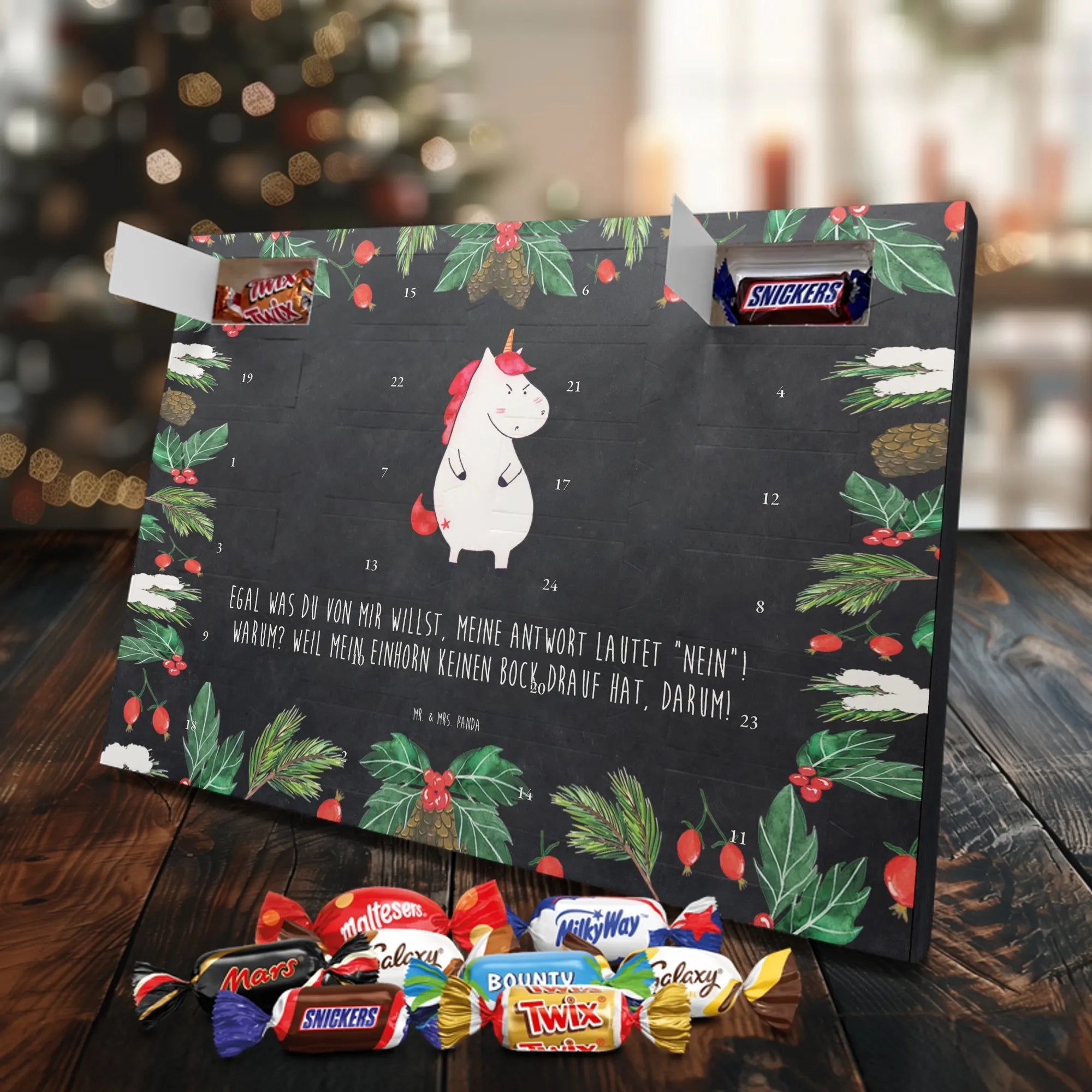 Unser Schoko Adventskalender von Mr. & Mrs. Panda bringt dir und deinen Lieben jede Menge Vorfreude und zauberhafte Momente in die Adventszeit. Der Kalender ist liebevoll bedruckt mit wunderschönen Motiven und frechen Sprüchen im typischen Mr. & Mrs. Panda Stil – ein echter Blickfang auf dem Tisch oder an der Wand. Die brillante Druckqualität kombiniert mit einer seidenmatten Oberflächenveredelung sorgt für edle Farben und ein angenehmes Gefühl beim Anfassen. Auch die Seitenflächen sind bedruckt, sodass der Kalender von allen Seiten hübsch aussieht. Er ist nicht personalisierbar, dafür aber in seiner Gestaltung rundum stimmig. Gefüllt ist der Adventskalender mit 24 hochwertigen Celebrations-Füllungen in acht verschiedenen Sorten: Maltesers, Mars, Snickers, Twix, Milky Way, Bounty, Galaxy und Galaxy Caramel — so ist für jede Naschkatze etwas dabei. Die Besonderheit: Du kannst den Kalender entweder aufstellen oder dank rückseitiger Aufhängung an die Wand hängen. Maße: 325 mm x 225 mm x 27 mm. Ein liebevolles Geschenk für Familie, Freunde oder einfach für dich selbst, das kleine tägliche Glücksmomente schenkt und die Adventszeit versüßt.