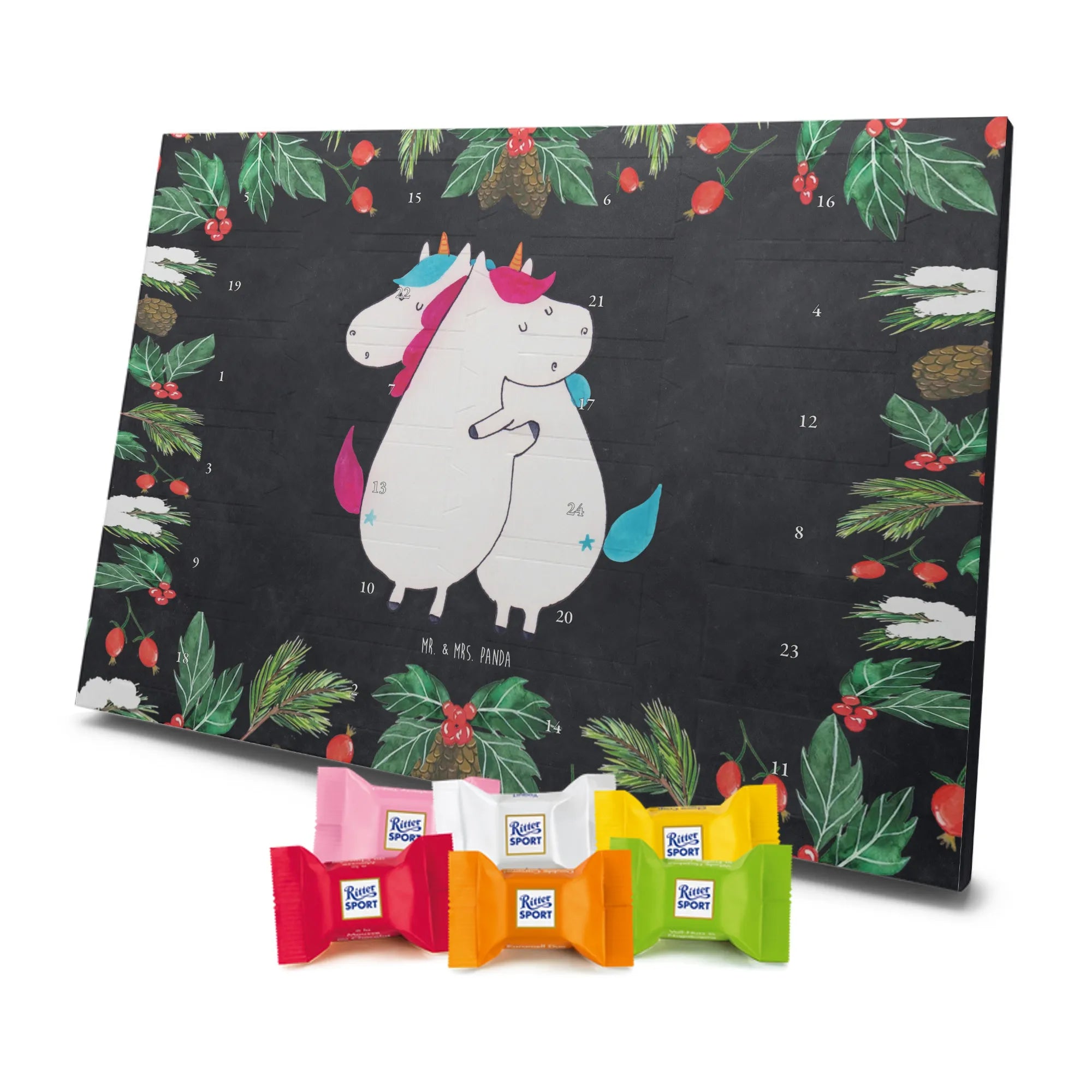 Unser entzückender Schokoladen Adventskalender von Mr. & Mrs. Panda ist das perfekte Highlight für die Adventszeit. Bedruckt mit wunderschönen Motiven & Sprüchen von Mr. & Mrs. Panda zaubert er dir ein Lächeln an jedem Tag im Dezember. Der Kalender ist nicht personalisierbar, überzeugt aber durch brillante Druckqualität mit seidenmatter Oberflächenveredelung und sorgsame bedruckte Seitenflächen. Die stabile Verarbeitung macht ihn zu einem dekorativen Hingucker. Maße: 325 mm x 225 mm x 27 mm. Besonders praktisch: Er kann aufgehängt oder aufgestellt werden, ganz nach deinem Geschmack und Platzangebot. Gefüllt ist der Adventskalender mit Ritter Sport Schokowürfeln – in verführerischen Sorten wie Mousse au Chocolat, Schoko Crisp, Voll-Nuss in Nougatcreme, Karamell Duo, Joghurt und Erdbeer-Joghurt. Wichtiger Hinweis: Es handelt sich um einen Kalender gefüllt mit Ritter Sport Schokolade, nicht um einen Kalender der Marke Ritter Sport. Schenk ihn Freunden, der Familie oder gönn dir selbst eine süße Vorfreude: kleine Schokoladenmomente, liebevoll verpackt von Mr. & Mrs. Panda.