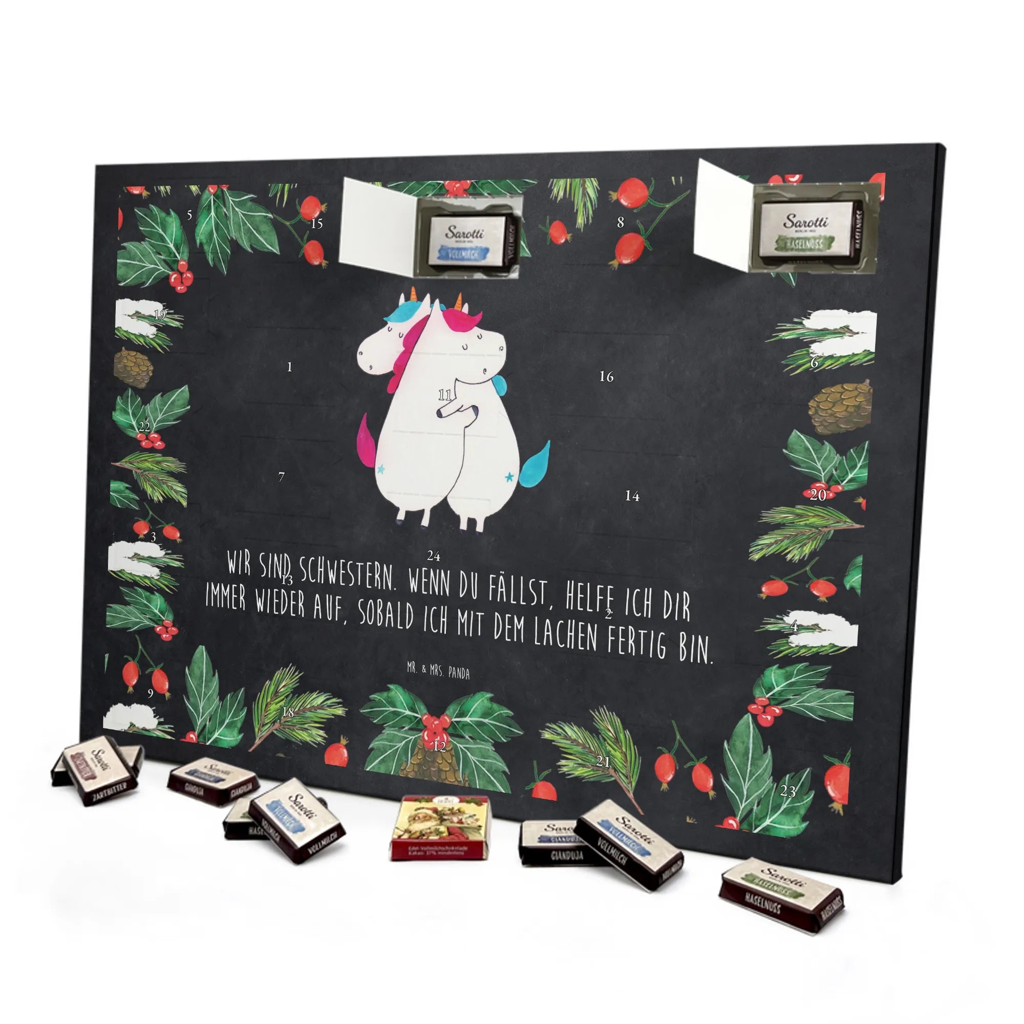 Wunderschöner Schoko Adventskalender von Mr. & Mrs. Panda – perfekt für alle, die die Vorweihnachtszeit mit süßen Momenten feiern möchten. Unser Adventskalender ist liebevoll bedruckt mit zauberhaften Motiven und freundlichen Sprüchen von Mr. & Mrs. Panda. Die brillante Druckqualität und die seidenmatte Oberflächenveredelung lassen die Farben sanft und edel wirken, während die bedruckten Seitenflächen den besonderen Look abrunden. Der Kalender ist nicht personalisierbar, dafür aber vielseitig: Du kannst ihn aufstellen oder ganz einfach an der Wand aufhängen. Gefüllt ist der Kalender mit hochwertiger Markenschokolade: 24 einzeln verpackte Schokoladentäfelchen in vier leckeren Geschmacksrichtungen von Sarotti® und Confiserie Heidel® – Vollmilch, Nougat, Zartbitter und Haselnuss. Insgesamt enthält der Kalender 107 g Markenschokolade von Sarotti® und Confiserie Heidel®. Die kompakte Bauweise macht ihn zum dekorativen Hingucker auf dem Sideboard, auf dem Esstisch oder als besonderes Geschenk für Freundinnen, Familie und liebe Menschen. Maße: 355 mm x 245 mm x 11 mm. Mit diesem Schoko Adventskalender schenkst du kleine Freuden und zauberhafte Vorfreude auf die schönsten Tage des Jahres – ganz im gemütlichen Stil von Mr. & Mrs. Panda.
