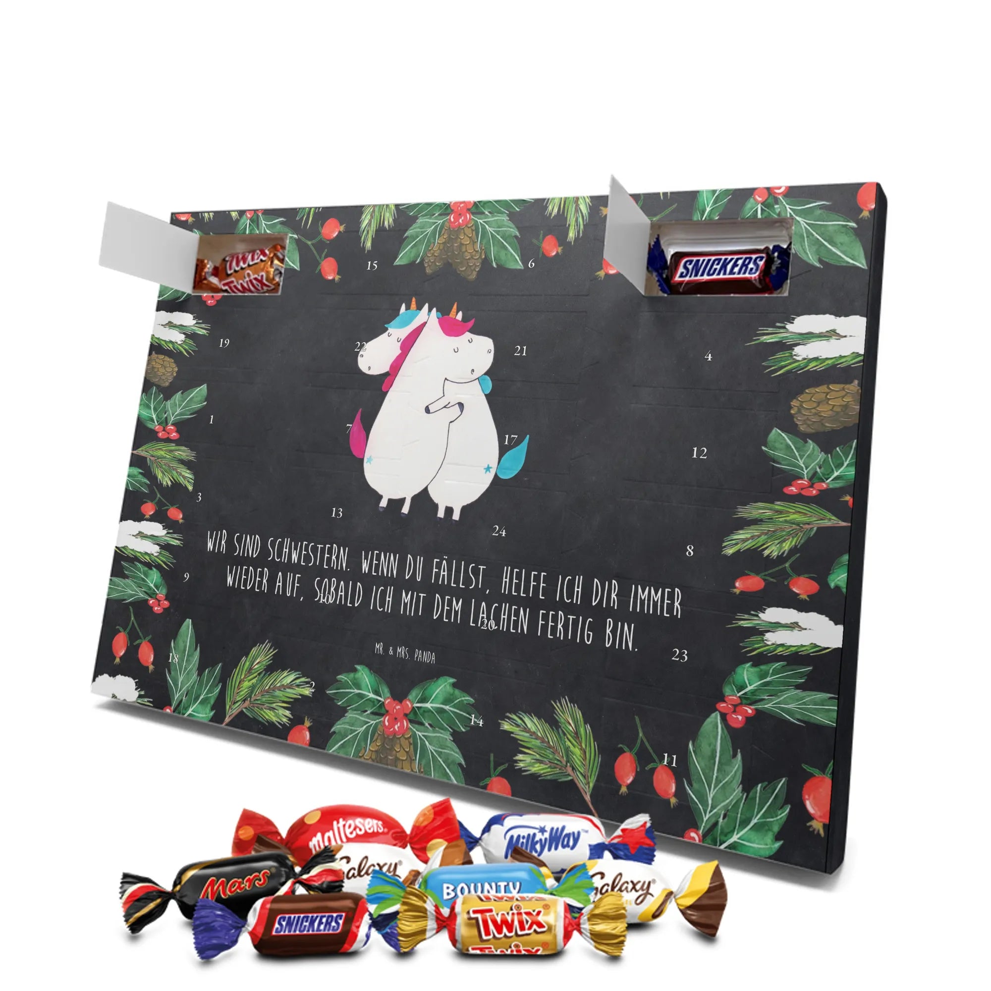 Unser Schoko Adventskalender von Mr. & Mrs. Panda bringt dir und deinen Lieben jede Menge Vorfreude und zauberhafte Momente in die Adventszeit. Der Kalender ist liebevoll bedruckt mit wunderschönen Motiven und frechen Sprüchen im typischen Mr. & Mrs. Panda Stil – ein echter Blickfang auf dem Tisch oder an der Wand. Die brillante Druckqualität kombiniert mit einer seidenmatten Oberflächenveredelung sorgt für edle Farben und ein angenehmes Gefühl beim Anfassen. Auch die Seitenflächen sind bedruckt, sodass der Kalender von allen Seiten hübsch aussieht. Er ist nicht personalisierbar, dafür aber in seiner Gestaltung rundum stimmig. Gefüllt ist der Adventskalender mit 24 hochwertigen Celebrations-Füllungen in acht verschiedenen Sorten: Maltesers, Mars, Snickers, Twix, Milky Way, Bounty, Galaxy und Galaxy Caramel — so ist für jede Naschkatze etwas dabei. Die Besonderheit: Du kannst den Kalender entweder aufstellen oder dank rückseitiger Aufhängung an die Wand hängen. Maße: 325 mm x 225 mm x 27 mm. Ein liebevolles Geschenk für Familie, Freunde oder einfach für dich selbst, das kleine tägliche Glücksmomente schenkt und die Adventszeit versüßt.