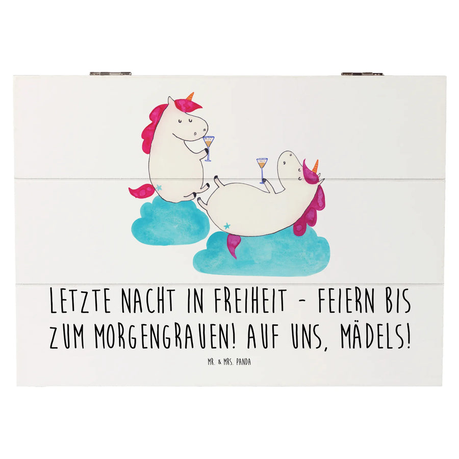Mach den JGA unvergesslich mit dieser süßen Holzkiste von Mr. & Mrs. Panda. Bedruckt mit dem lustigen Spruch „Letzte Nacht in Freiheit - Feiern bis zum Morgengrauen! Auf uns, Mädels!“ ist sie das perfekte Erinnerungsstück für Braut und Freundinnen. Ideal, um Fotos, kleine Geschenke oder Erinnerungsstücke sicher aufzubewahren.