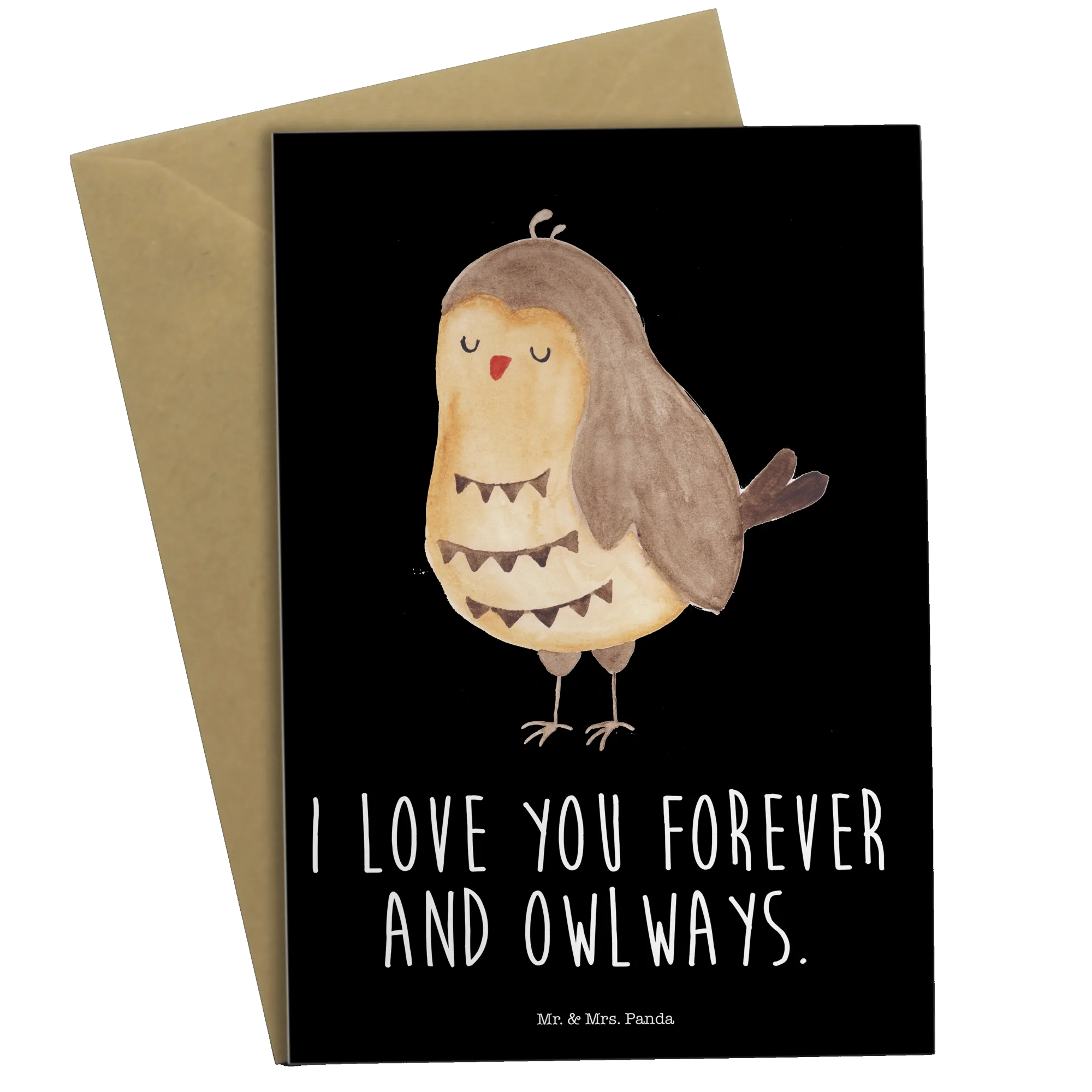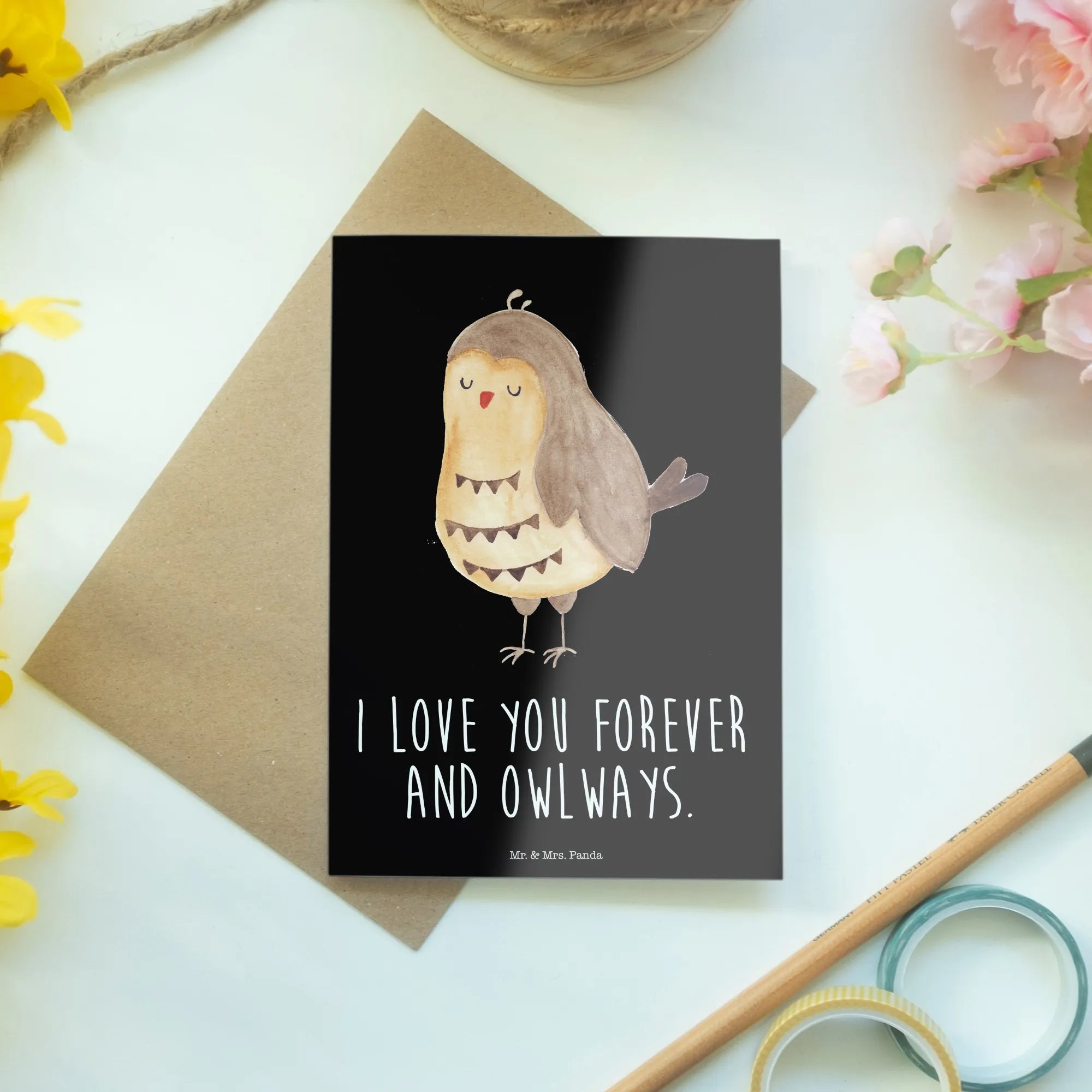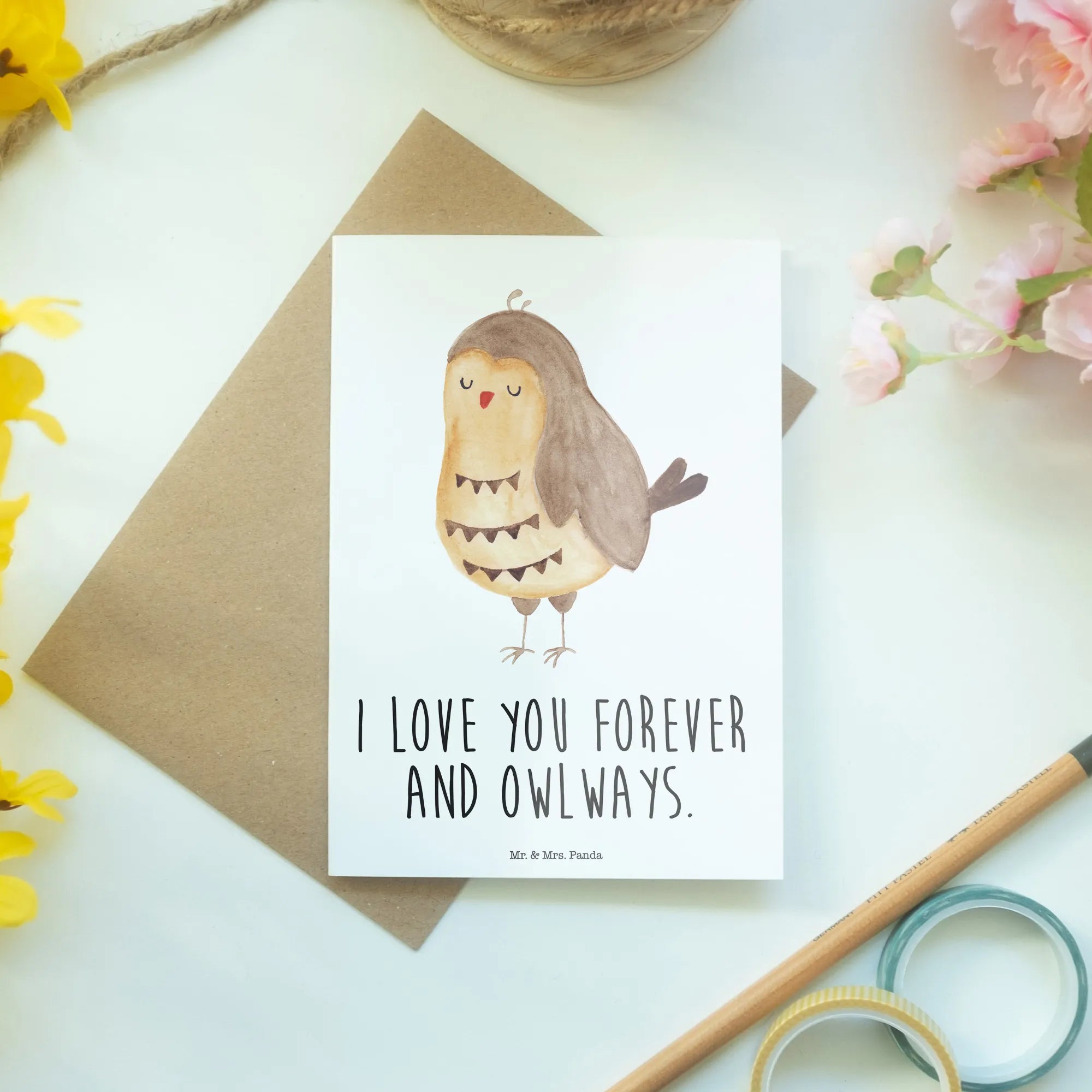Die liebevolle Grußkarte Eule Zufrieden von Mr. & Mrs. Panda ist das perfekte Geschenk für all jene, die einer besonderen Person eine Freude machen möchten! Egal ob zum Geburtstag, Hochzeitstag oder einfach nur so - diese Karte enthält den zauberhaften Spruch "I love you forever and owlways" und wird garantiert für Herzklopfen sorgen. Mit einer niedlichen Eule, die zufrieden dasteht, bringt sie Freude in jedes Zuhause.