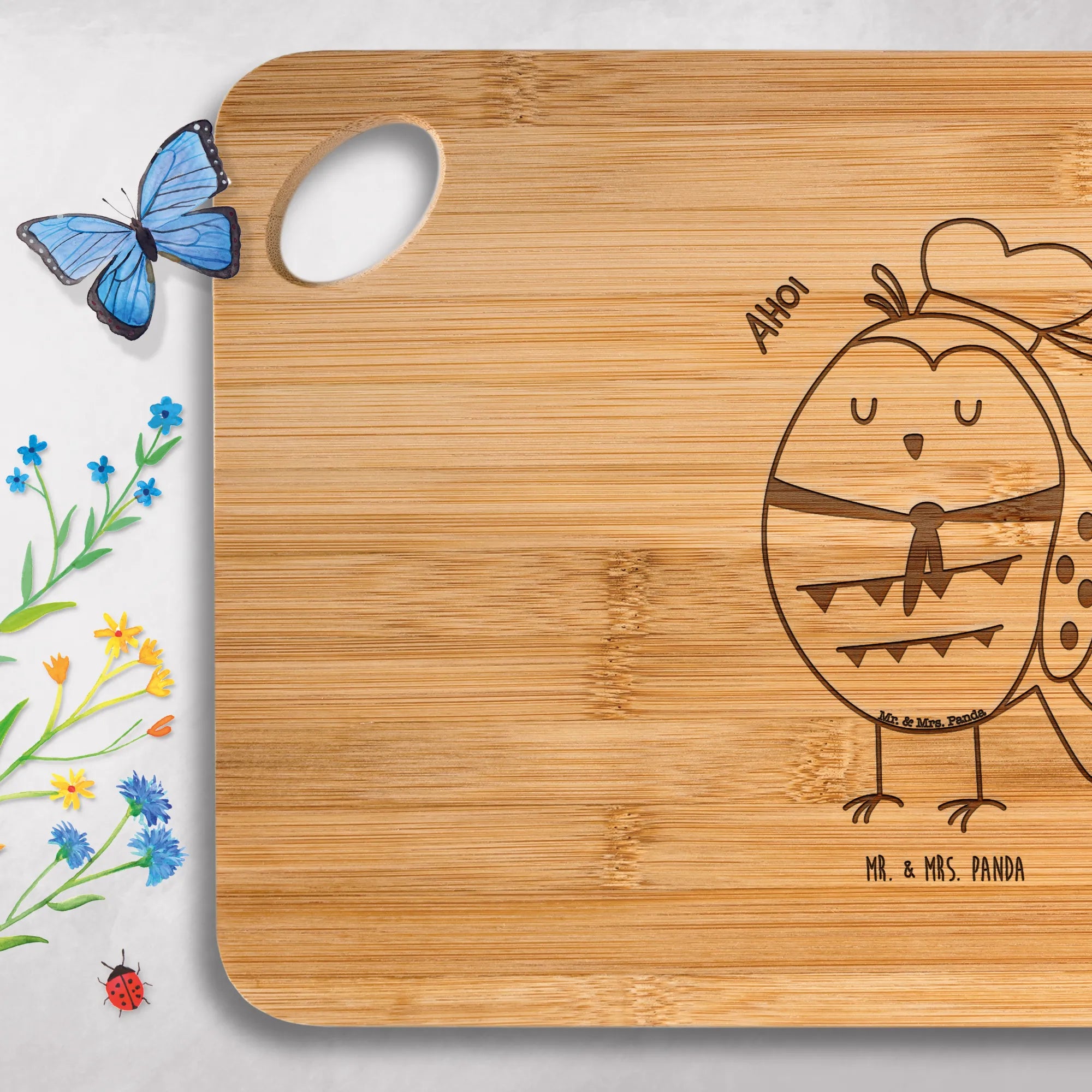 🐼 Hochwertiges Bambus-Schneidebrett mit robuster Beschaffenheit und liebevoller Gravur – ideal für Speisen und Frühstück.