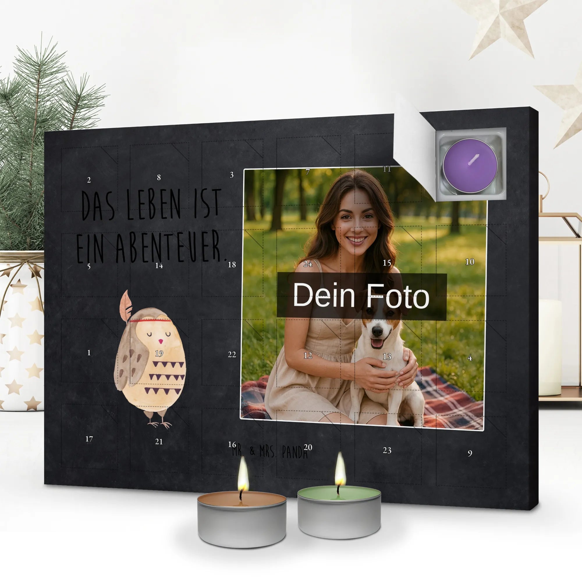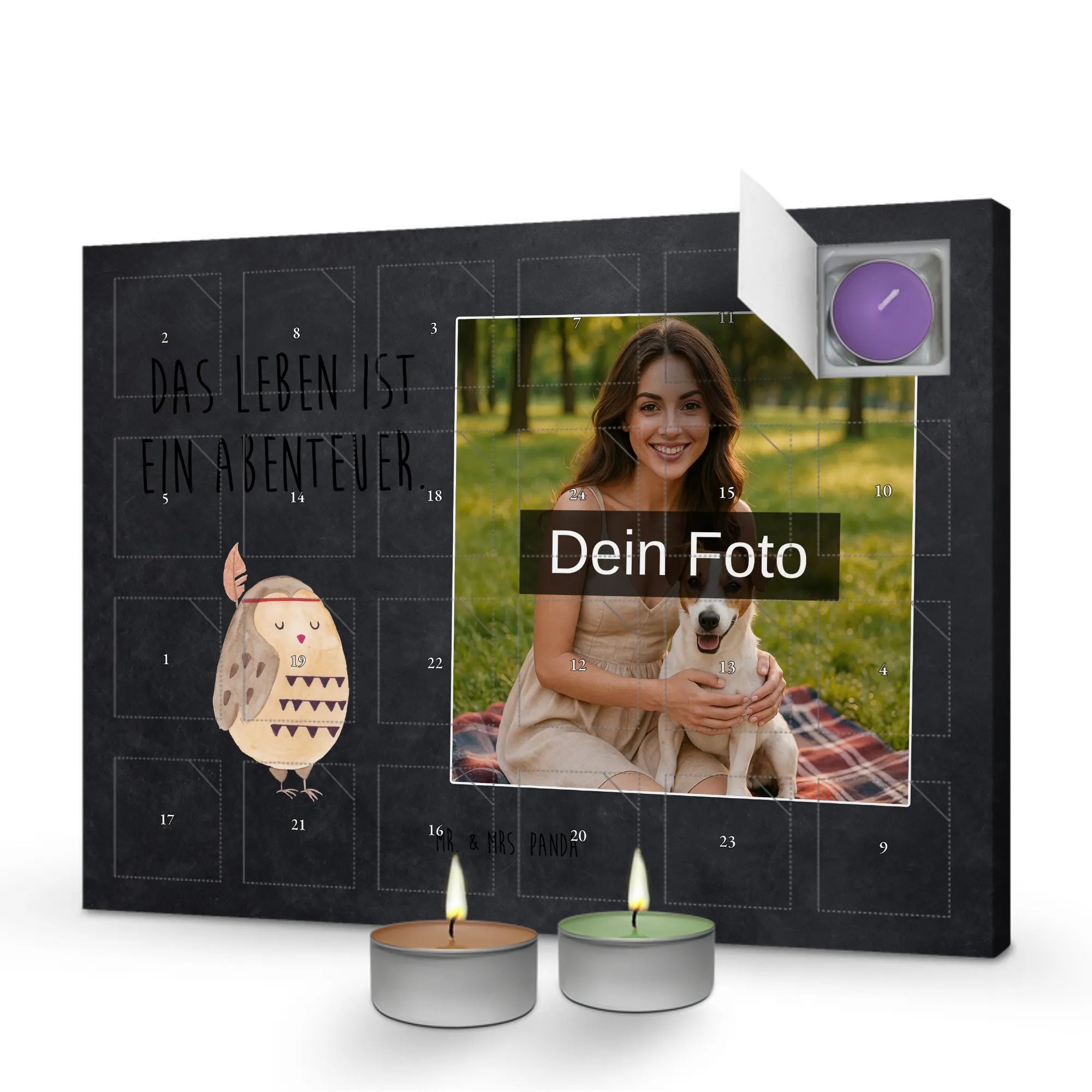 Personalisierter Duftkerzen Foto Adventskalender Eule Federschmuck - Kreidetafel