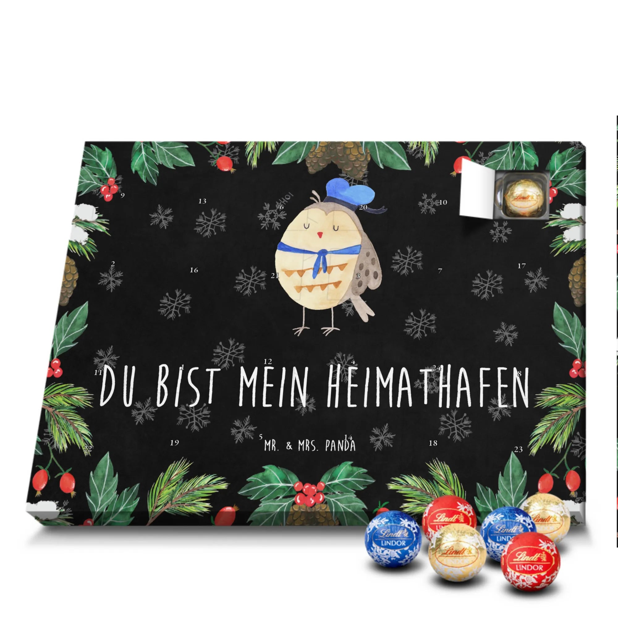 Unser zauberhafter Schoko Adventskalender von Mr. & Mrs. Panda bringt dir die süßeste Vorfreude auf Weihnachten! Dieser liebevoll gestaltete Adventskalender ist bedruckt mit wunderschönen Motiven & Sprüchen von Mr. & Mrs. Panda und ist nicht personalisierbar – dafür aber ein perfektes Geschenk für Freunde und Familie. Brillante Druckqualität mit seidenmatter Oberflächenveredelung sorgt für ein edles Finish, und die bedruckten Seitenflächen machen den Kalender von allen Seiten zu einem Hingucker. Maße: 233 mm x 178 mm x 24 mm. Besonderheit: kann aufgehängt oder aufgestellt werden, je nachdem, wie du ihn präsentieren möchtest. Gefüllt mit Lindt Lindor: 24 einzeln verpackte Markenschokoladen Kugeln in drei verschiedenen Sorten – Vollmilch, Feinherb und Weiße Schokolade – sorgen für abwechslungsreichen Genuss in der Adventszeit. Zutaten: Zucker, pflanzliches Fett (Kokosnuss, Palmkern), Kakaobutter, Vollmilchpulver, Kakaomasse, Milchzucker, Magermilchpulver, Butterreinfett, Emulgator (Sojalecithin), Gerstenmalzextrakt, Aromen. Besondere Hinweise: Kann Haselnüsse und Mandeln enthalten. Unser Schoko Adventskalender verbindet niedliches Design mit hochwertiger Füllung – ideal zum Verschenken oder selbst Naschen. Mr. & Mrs. Panda wünschen dir eine fröhliche und leckere Adventszeit!