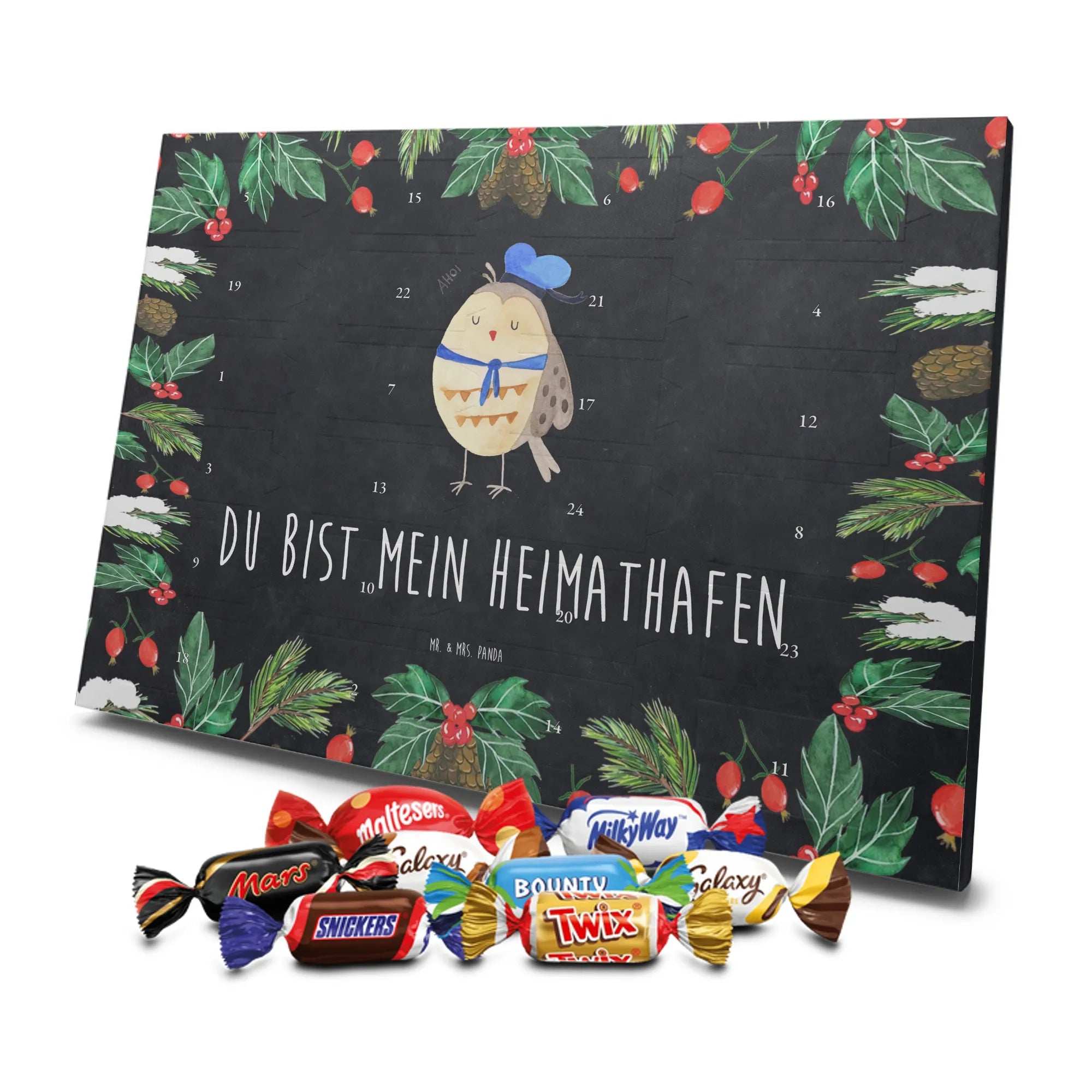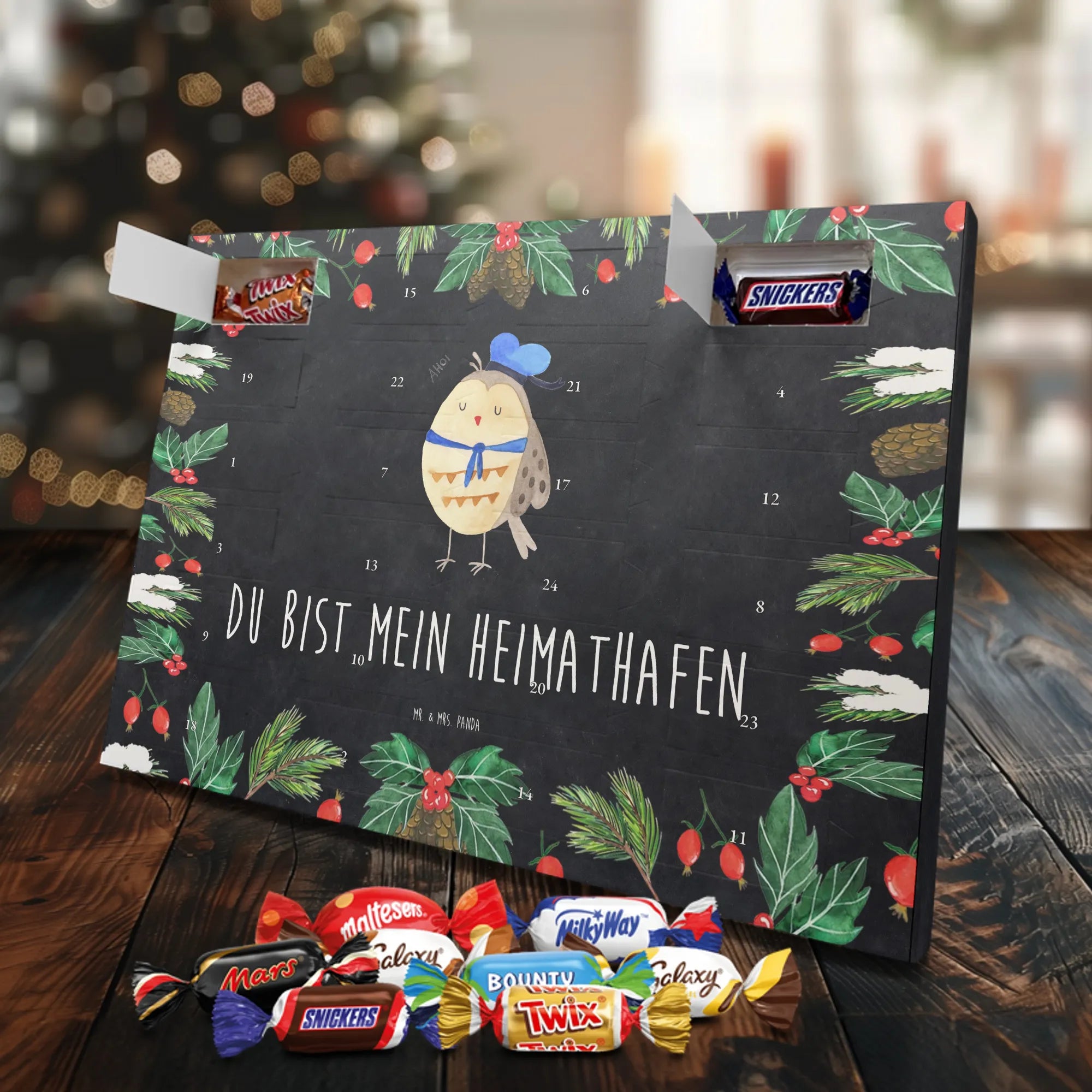 Unser Schoko Adventskalender von Mr. & Mrs. Panda bringt dir und deinen Lieben jede Menge Vorfreude und zauberhafte Momente in die Adventszeit. Der Kalender ist liebevoll bedruckt mit wunderschönen Motiven und frechen Sprüchen im typischen Mr. & Mrs. Panda Stil – ein echter Blickfang auf dem Tisch oder an der Wand. Die brillante Druckqualität kombiniert mit einer seidenmatten Oberflächenveredelung sorgt für edle Farben und ein angenehmes Gefühl beim Anfassen. Auch die Seitenflächen sind bedruckt, sodass der Kalender von allen Seiten hübsch aussieht. Er ist nicht personalisierbar, dafür aber in seiner Gestaltung rundum stimmig. Gefüllt ist der Adventskalender mit 24 hochwertigen Celebrations-Füllungen in acht verschiedenen Sorten: Maltesers, Mars, Snickers, Twix, Milky Way, Bounty, Galaxy und Galaxy Caramel — so ist für jede Naschkatze etwas dabei. Die Besonderheit: Du kannst den Kalender entweder aufstellen oder dank rückseitiger Aufhängung an die Wand hängen. Maße: 325 mm x 225 mm x 27 mm. Ein liebevolles Geschenk für Familie, Freunde oder einfach für dich selbst, das kleine tägliche Glücksmomente schenkt und die Adventszeit versüßt.