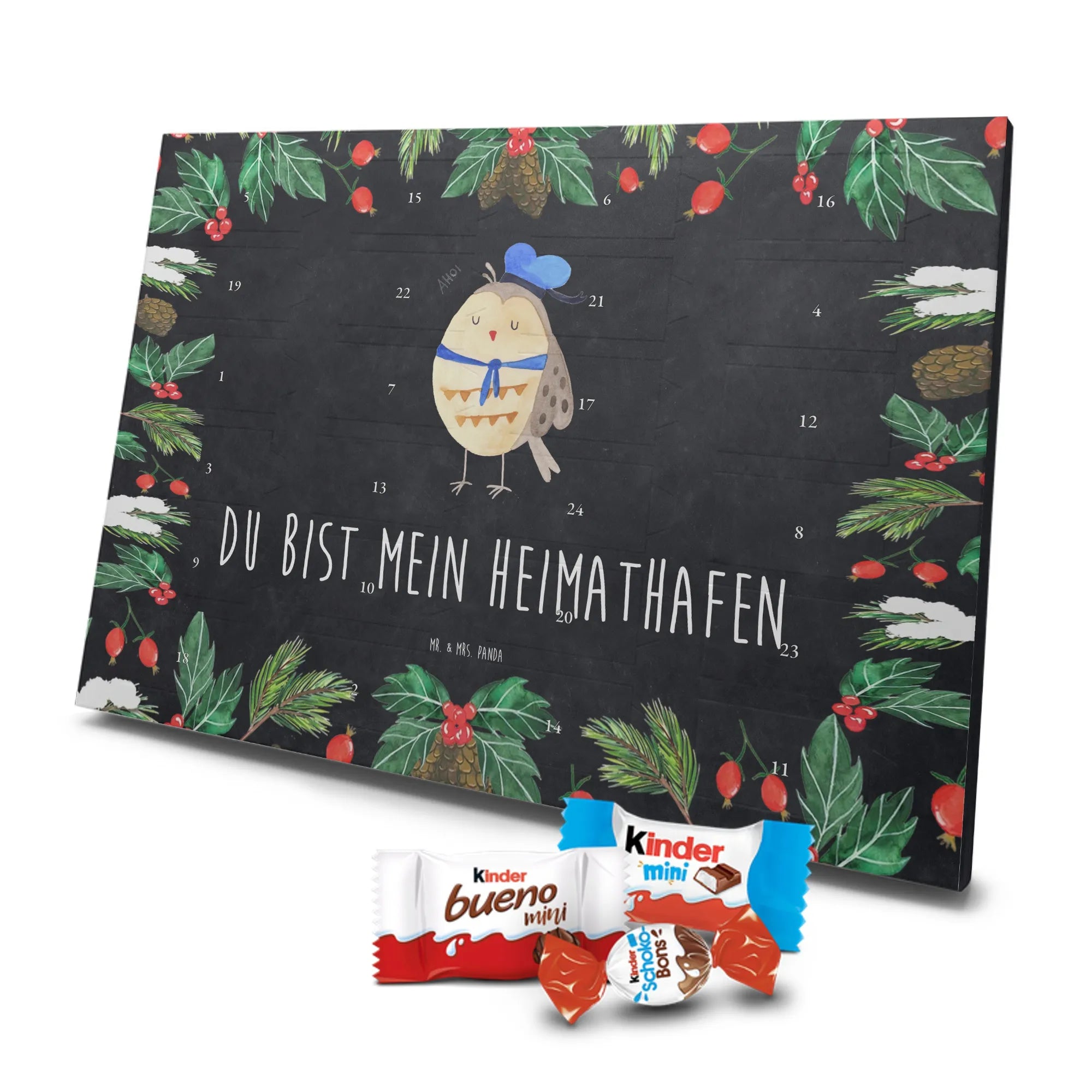 Unser Schokoladen Adventskalender von Mr. & Mrs. Panda bringt Charme und süße Überraschungen in deine Adventszeit. Liebevoll bedruckt mit wunderschönen Motiven & Sprüchen von Mr. & Mrs. Panda, ist dieser Kalender nicht personalisierbar, dafür aber mit hochwertiger Verarbeitung und stimmigem Design. Die brillante Druckqualität mit seidenmatter Oberflächenveredelung verleiht jedem Motiv eine edle Optik, und die bedruckten Seitenflächen runden das Gesamtbild ab. Maße: 355 mm x 245 mm x 11 mm. Eine praktische Besonderheit: kann aufgehängt oder aufgestellt werden – so passt er perfekt in jede Deko. Gefüllt mit Markenname Schokolade: Adventskalender gefüllt mit kinder® Schokolade. Inhalt: kinder® Schoko-Bons, kinder® Bueno mini und kinder® Schokolade mini. Mit 24 kleinen Leckereien hinter den Türchen ist dieser Kalender ideal für Kinder und alle Naschkatzen. Er eignet sich wunderbar als Adventsgeschenk oder als liebevolle Aufmerksamkeit für Kollegen und Freunde. Gönn dir oder anderen eine süße Adventszeit mit diesem bezaubernden Schokoladen Adventskalender!