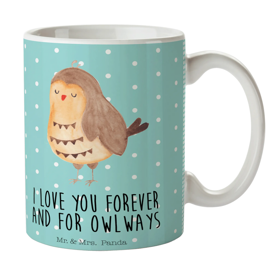 Die Eule Zufrieden von Mr. & Mrs. Panda ist die perfekte Tasse für alle Tierliebhaber und Eulen-Fans! 🦉 Sie bringt nicht nur Farbe, sondern auch besondere Freude in deinen Alltag. Mit ihrem putzigen Design und dem liebevollen Slogan "I love you forever and owlways" zaubert sie jedem ein Lächeln ins Gesicht. Ob beim gemütlichen Kaffeetrinken am Morgen, beim Teetrinken nachmittags oder beim Pausensnack im Büro – diese wunderschöne Tasse aus hochwertiger Keramik ist ein treuer Begleiter. Die Tasse hat eine Füllmenge von 325 ml – ideal für deinen Lieblingstee oder -kaffee.