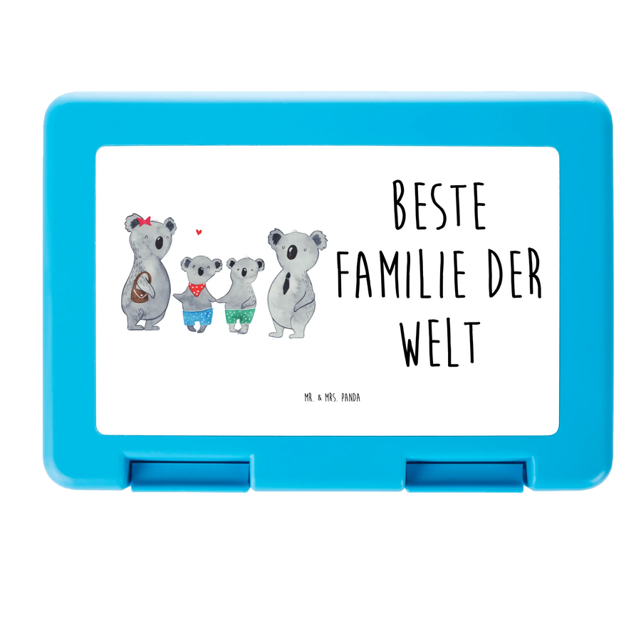 Die größte Koala-Dame mit ihrem roten Sternchen im Haar repräsentiert jede liebevolle Mama, während der zärtliche Papa mit Anzug und Krawatte für väterliche Hinwendung steht. Die beiden kleinen Koalas in bunten Shorts symbolisieren die unbeschwerte Kindheit und das Familienleben. "Beste Familie der Welt" steht als schöner Slogan auf der Brotdose, der perfekt für Geschenke an die eigene Familie geeignet ist.