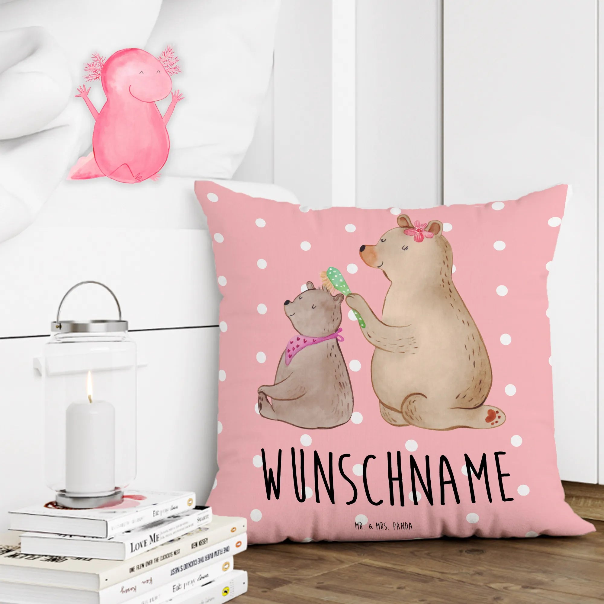 🐼 Gestalte dein Kissen mit Namen oder Datum.