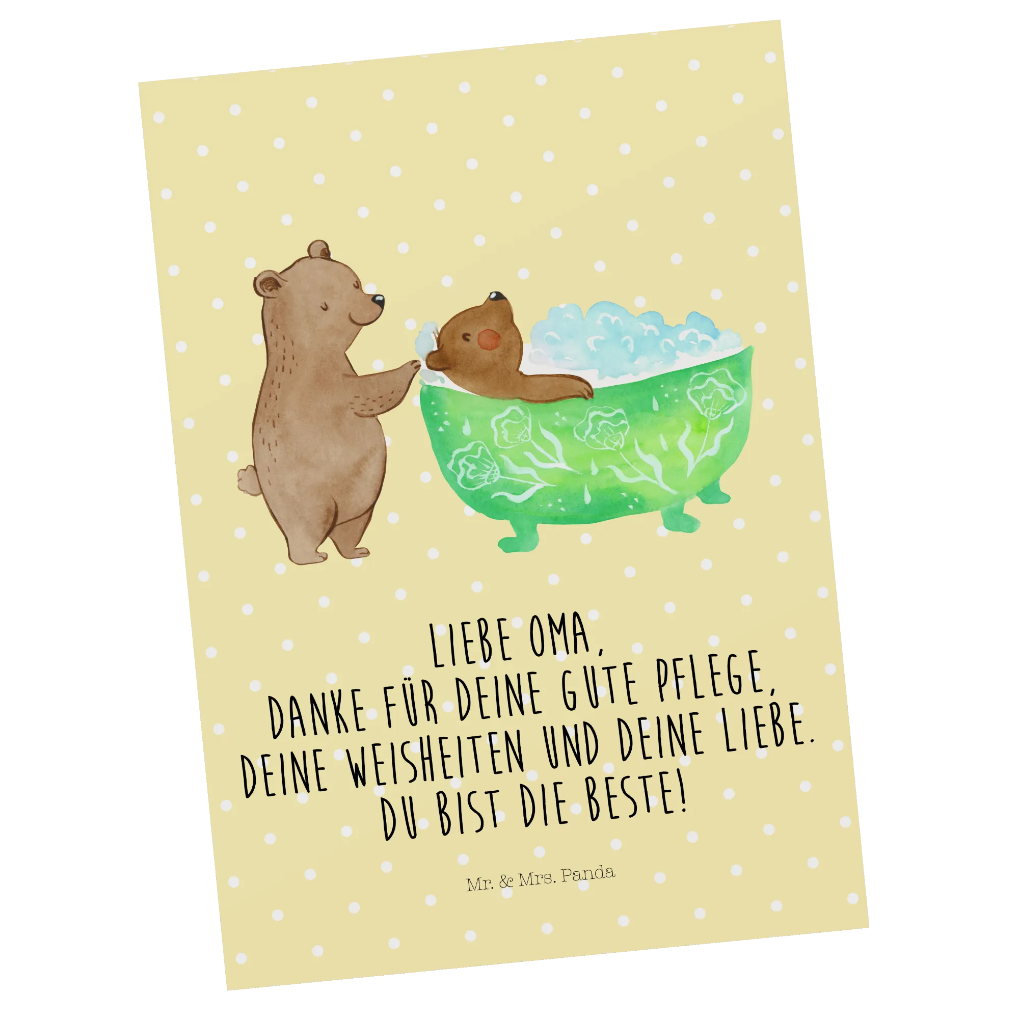 Die Postkarte "Oma badet" aus der Familie-Kollektion von Mr. & Mrs. Panda ist das perfekte Geschenk, um deine Oma zu überraschen und ihr zu zeigen, wie sehr du sie schätzt.