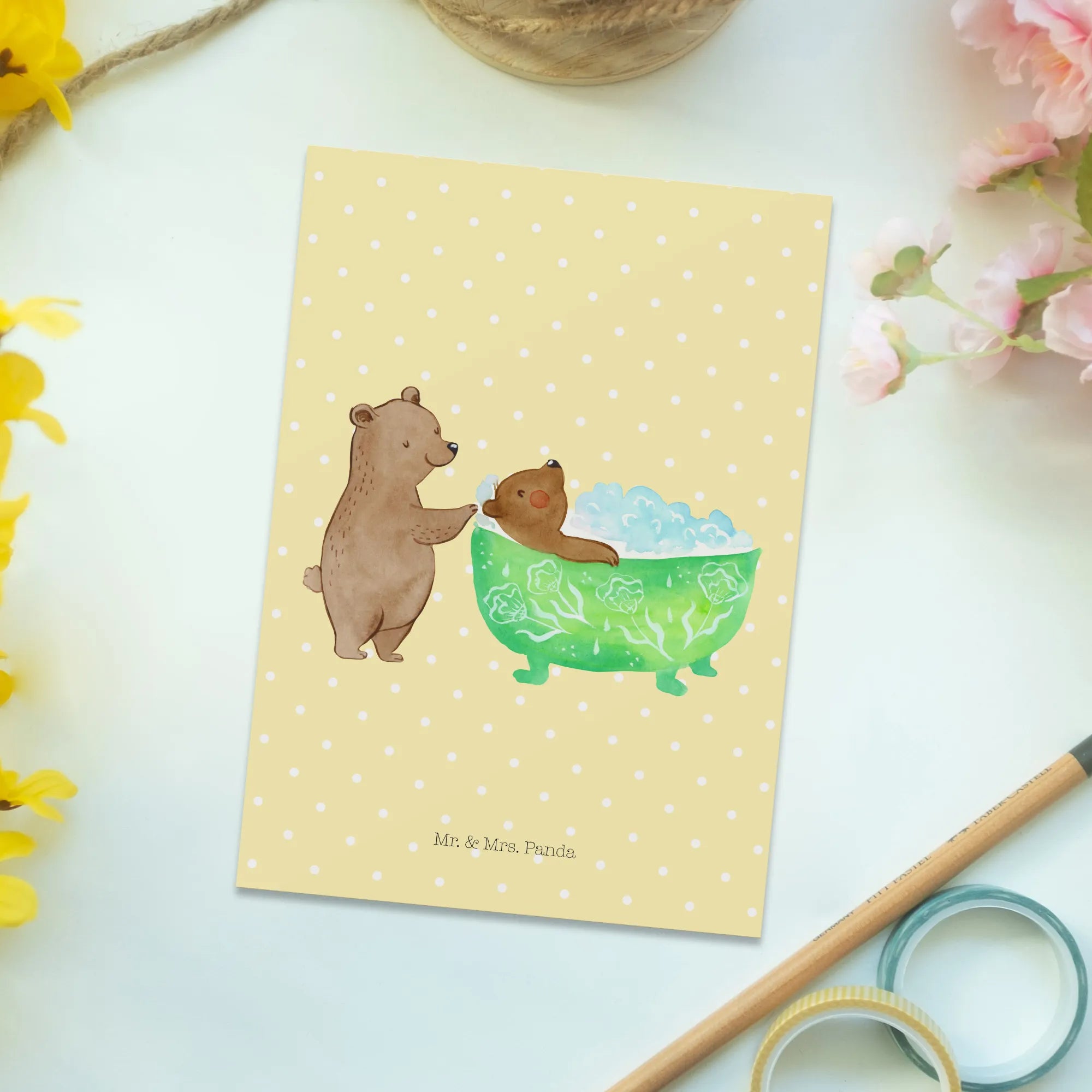 Oma badet – eine süße Postkarte aus der Familien-Kollektion von Mr. & Mrs. Panda, die direkt ins Herz trifft. Auf der Vorderseite siehst du zwei Bären in einer warmen, fürsorglichen Szene: Ein größerer Bär hilft dem kleineren beim Baden in einer hübsch mit Blumen verzierten Wanne. Diese Illustration strahlt Geborgenheit, Liebe und familiäre Nähe aus – genau das Richtige für deine liebe Oma. 😊