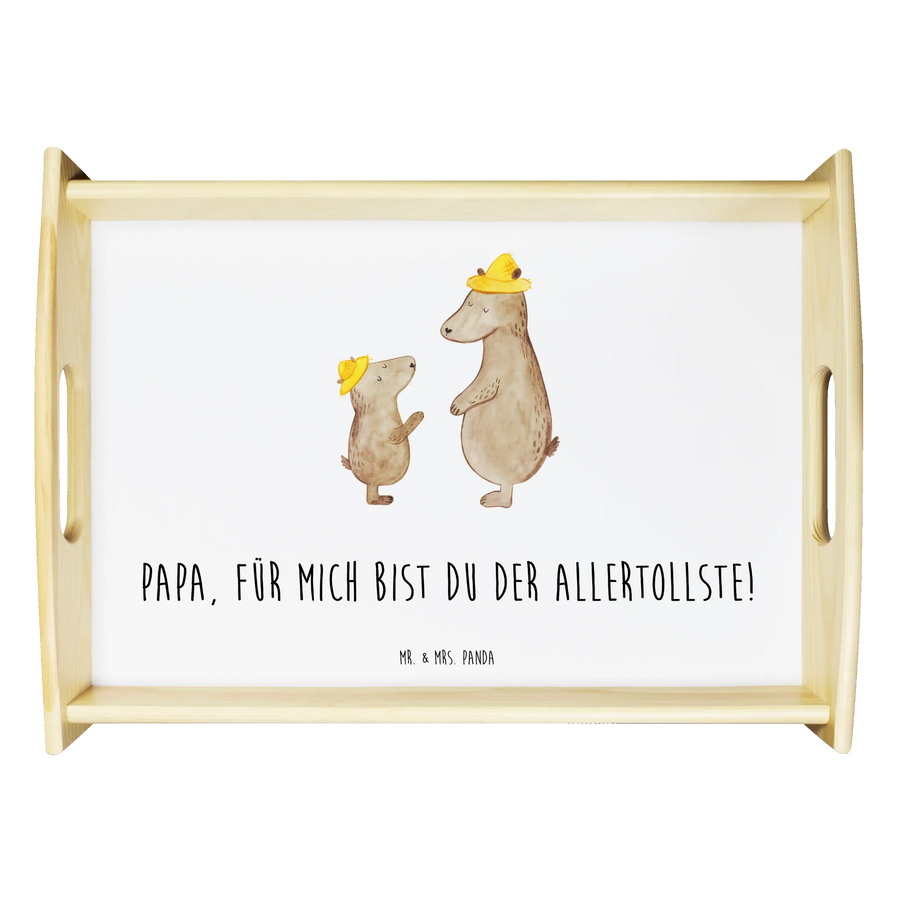 Verwöhne Deine Liebsten mit unserem bezaubernden Serviertablett von Mr. & Mrs. Panda! Mit den Maßen von 480 mm x 480 mm x 65 mm und einem gewicht von 925 g ist es nicht nur hübsch, sondern auch praktisch. Aus lasiertem Echtholz gefertigt, begeistert es mit einem lebendigen Druck, der gute Stimmung verbreitet. Egal ob beim Frühstück im Bett oder beim gemütlichen Abendessen auf dem Sofa – die seitlichen Griffmulden ermöglichen ein einfaches Tragen. Die Anti-Rutsch Pads auf der Unterseite sorgen dafür, dass alles sicher an seinem Platz bleibt. Dank der kratzfesten Oberfläche bleibt dein Tablett nach jeder Benutzung in bestem Zustand – einfach mit einem feuchten Tuch und Spülmittel abwischen, aber nicht einweichen! Beachte bitte die längere Anfertigungszeit aufgrund der besonderen Verarbeitung.
