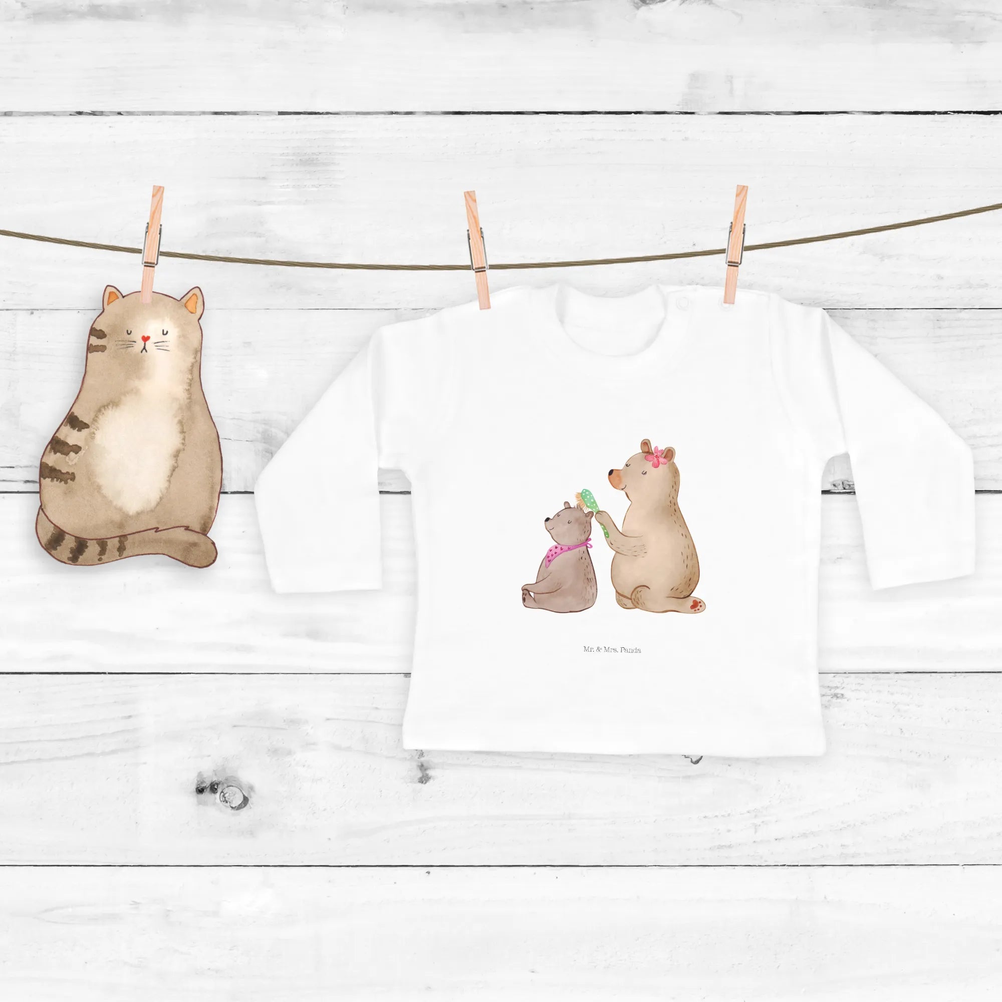 Stell dir vor, wie das kleine Baby in diesem kuscheligen Langarmshirt aus 100% Bio-Baumwolle liegt, während das Motiv eine Geschichte von unendlicher Geborgenheit erzählt. Auf dem handgezeichneten Aquarellbild von Mrs. Panda sieht man einen großen, liebevollen Bären, der mit einer blumengeschmückten Haarspange im Haar ganz behutsam das Fell eines kleineren Bären bürstet. Der kleine Bär genießt diesen Moment der Pflege mit geschlossenen Augen und einem zufriedenen Lächeln. Es ist eine Szene, die jede Mutter und jeder Vater sofort wiederkennt – dieser stille, magische Moment der Zuwendung. ✨