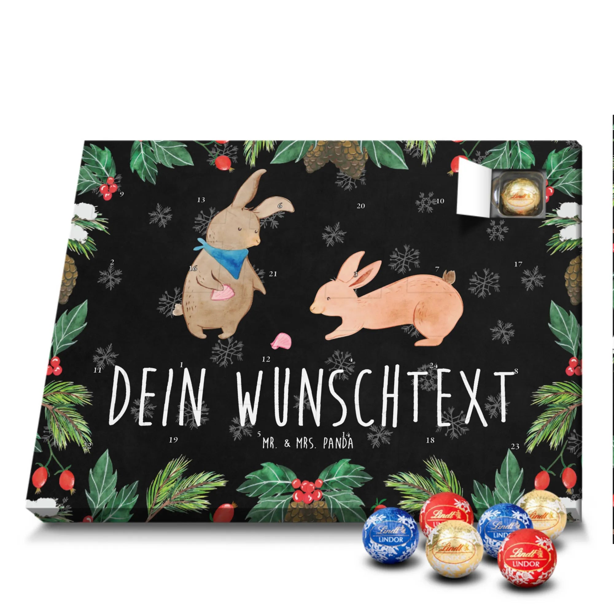 Personalisierter Schoko Adventskalender von Mr. & Mrs. Panda – der süße Countdown für dich oder deine Liebsten! Unser liebevoll gestalteter Adventskalender ist bedruckt mit wunderschönen Motiven und fröhlichen Sprüchen von Mr. & Mrs. Panda und lässt sich mit deinem Wunschnamen oder Wunschtext personalisieren. Die brillante Druckqualität kombiniert mit einer seidenmatten Oberflächenveredelung sorgt für ein edles Finish, zusätzlich sind die Seitenflächen bedruckt für ein durchgängiges Design. Maße: 233 mm x 178 mm x 24 mm. Der Kalender ist besonders praktisch: du kannst ihn entweder aufstellen oder an der Wand aufhängen – so passt er überall hin und verbreitet vorweihnachtliche Stimmung. Gefüllt mit Lindt Lindor Schokolade: 24 einzeln verpackte Markenschokoladen Kugeln in drei verschiedenen Sorten. Geschmacksrichtungen: Vollmilch, Feinherb und Weiße Schokolade. Zutaten: Zucker, pflanzliches Fett (Kokosnuss, Palmkern), Kakaobutter, Vollmilchpulver, Kakaomasse, Milchzucker, Magermilchpulver, Butterreinfett, Emulgator (Sojalecithin), Gerstenmalzextrakt, Aromen. Besondere Hinweise: Kann Haselnüsse und Mandeln enthalten. Dieser Adventskalender ist das perfekte Geschenk für Familien, Paare, Freunde oder für dich selbst – ein kleines tägliches Verwöhnmoment im Dezember. Bestell jetzt deinen personalisierten Schoko Adventskalender und zaubere ein Lächeln unter den Tannenbaum!