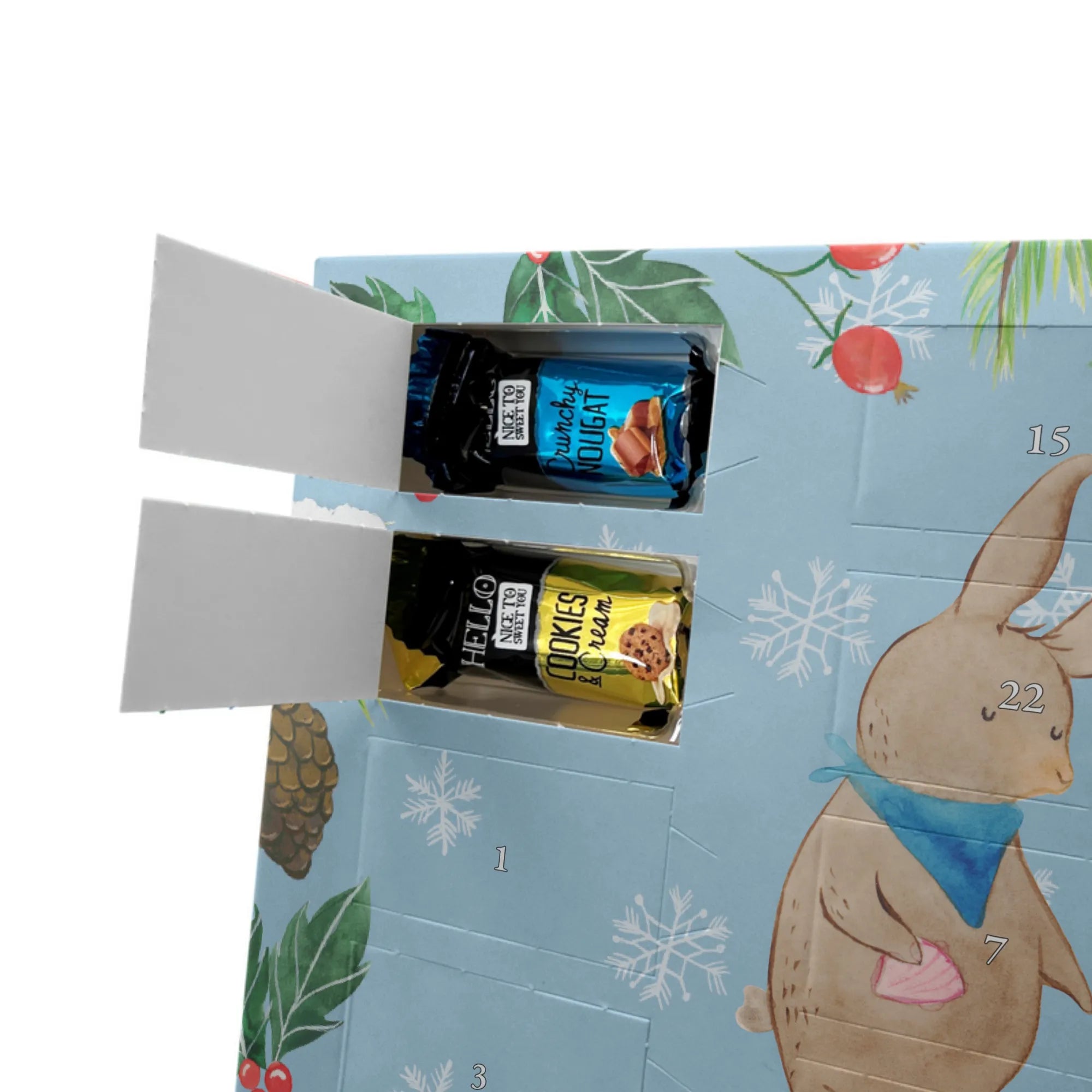 Personalisierter Schoko Adventskalender – ein liebevolles Detail für deine Adventsdeko von Mr. & Mrs. Panda. Mit süßen Illustrationen und witzigen Sprüchen bedruckt, lässt sich der Kalender ganz nach deinen Wünschen personalisieren: füge einfach einen Namen oder einen kurzen Gruß hinzu. Die Seitenflächen sind ebenfalls bedruckt, was dem Stück ein stimmiges Erscheinungsbild verleiht. Die seidenmatte Oberflächenveredelung sorgt für eine hochwertige Haptik, die brillante Druckqualität hebt die Motive hervor. Praktisch: Du kannst den Kalender aufstellen oder dank der Aufhängung an die Wand hängen. Gefüllt mit Lindt Hello: 24 einzeln verpackte Schokoladen Mini Sticks in vier verführerischen Geschmacksrichtungen – Karamell-Schokoladenkuchen, Kekse, Knuspriger Nougat und Erdbeer-Cheesecake. Zutaten sind aufgelistet; Allergene: Milcheiweiß, Milchzucker, Soja, Weizen, Haselnüsse; kann Mandeln und andere Schalenfrüchte enthalten. Ein durchdachtes, persönliches Geschenk, das Vorfreude und Genuss verbindet. Maße: 325 mm x 225 mm x 27 mm.