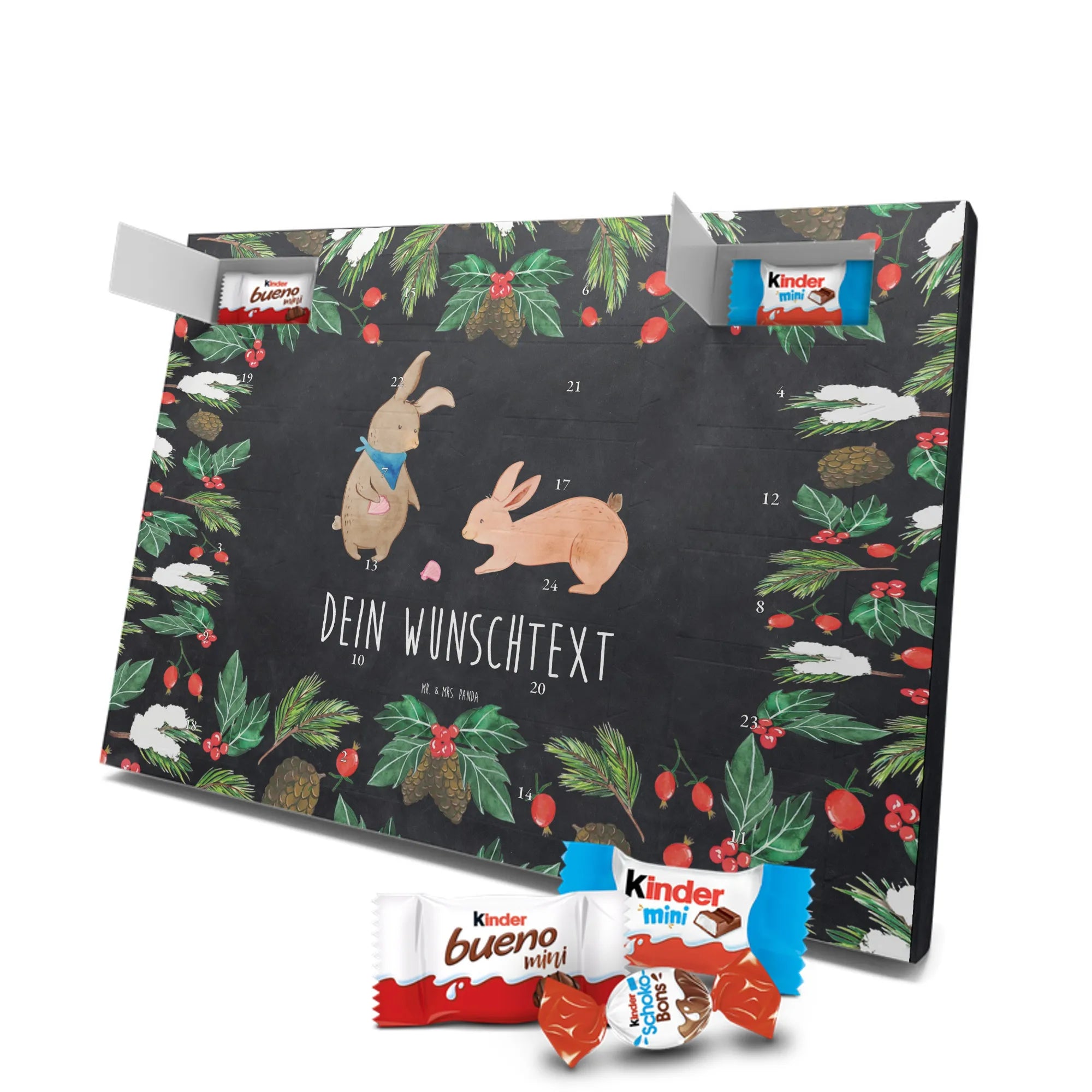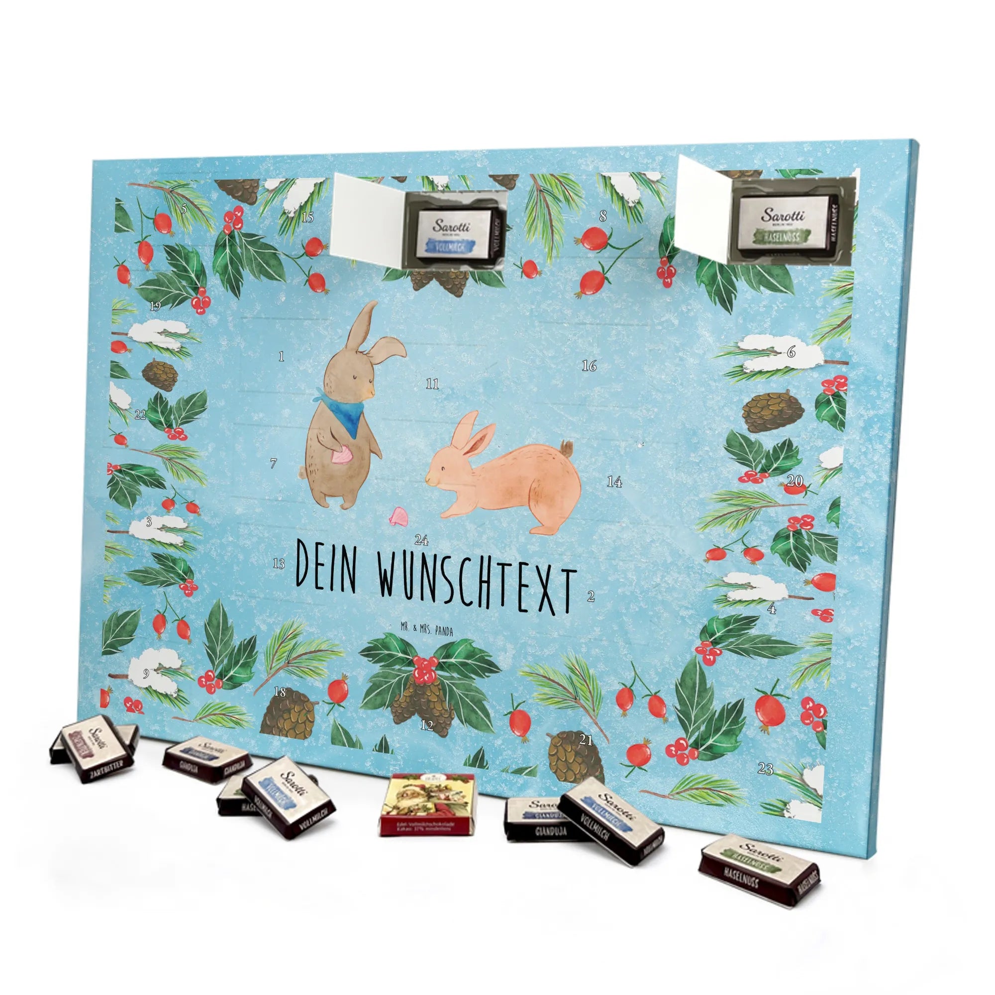 🐼 PERSONALISIERTER SCHOKO-ADVENTSKALENDER: Mit Wunschtext, bedruckt mit Mr. & Mrs. Panda Motiven, gefüllt mit MARKENNAMEN Schokolade.