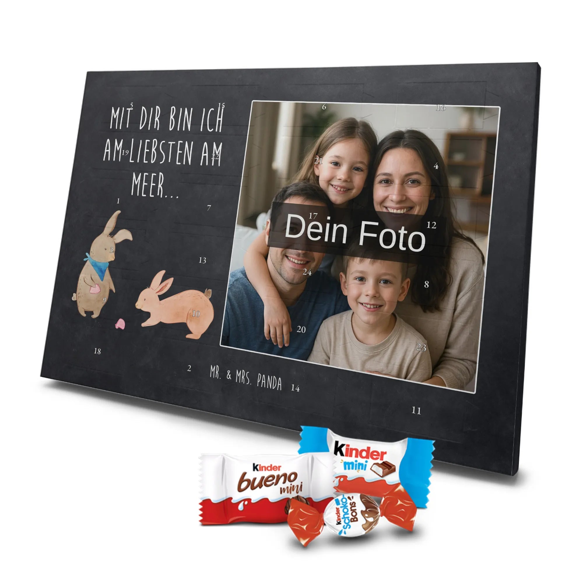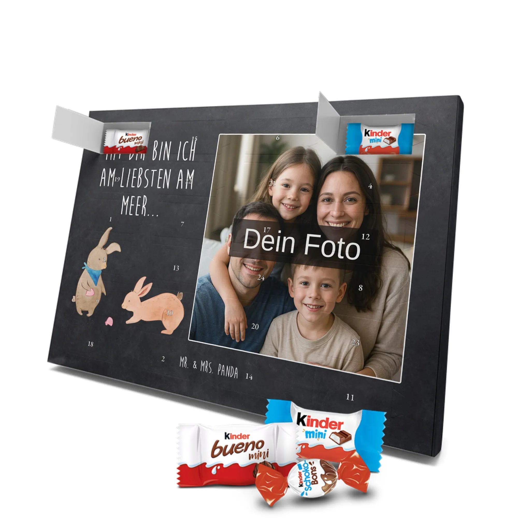 🐼 Personalisierter Schoko-Foto-Adventskalender mit deinem Bild, Mr. & Mrs. Panda Motiven und gefüllt mit kinder® Schokolade.