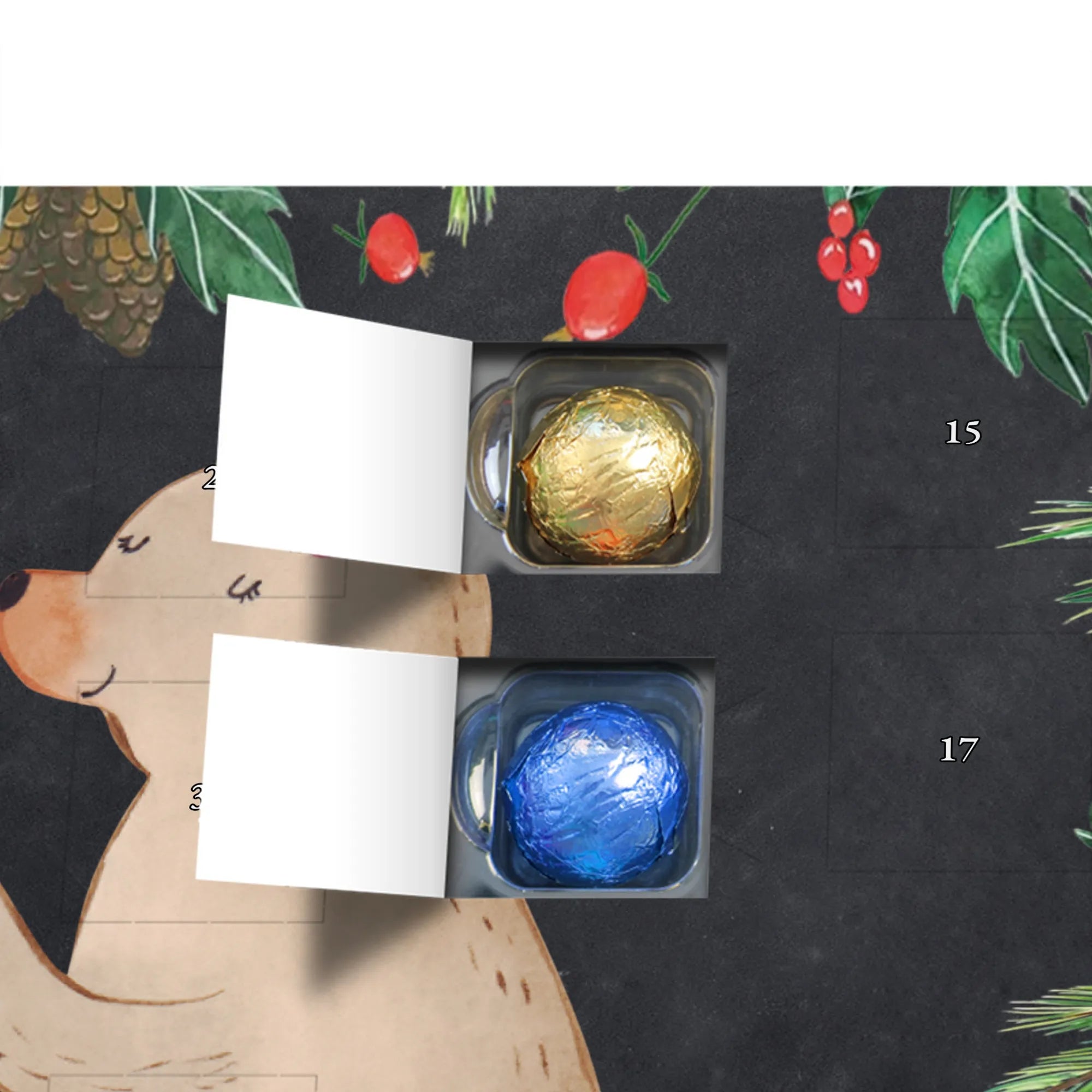 Wunderschöner Schokoladen-Adventskalender von Mr. & Mrs. Panda – süßes Design trifft hochwertige Verarbeitung. Unser Schokoladen-Adventskalender ist bedruckt mit wunderschönen Motiven & Sprüchen von Mr. & Mrs. Panda und nicht personalisierbar, dafür aber mit liebevollen Details gestaltet. Die brillante Druckqualität mit seidenmatter Oberflächenveredelung verleiht dem Kalender ein edles Finish, und auch die Seitenflächen sind bedruckt für einen rundum stimmigen Look. Maße: 233 mm x 178 mm x 24 mm. Die Konstruktion erlaubt sowohl das Aufstellen als auch das Aufhängen – Besonderheit: kann aufgehängt oder aufgestellt werden. Gefüllt mit MARKENNAMEN Schokolade und mit leckeren Schokoladenkugeln bestückt, ist jeder Dezembertag eine kleine Belohnung. Bitte lies die besonderen Hinweise: (Kann Spuren von Haselnüssen, Mandeln, Gluten und Soja enthalten!), kühl und trocken lagern. Ideal als Geschenk, Adventsdekoration oder süße Überraschung für Freunde und Familie. Mr. & Mrs. Panda wünscht dir eine gemütliche und genussvolle Adventszeit!