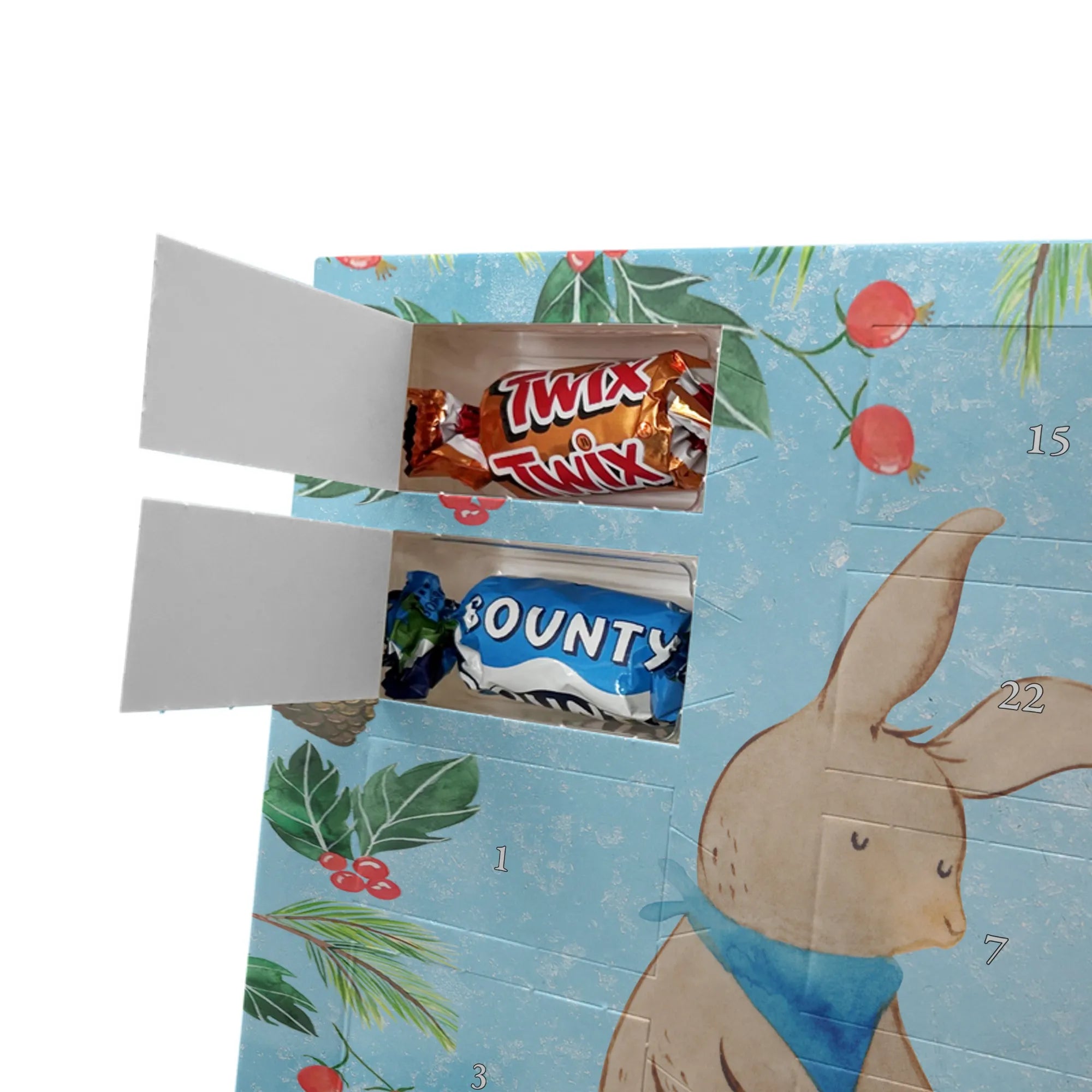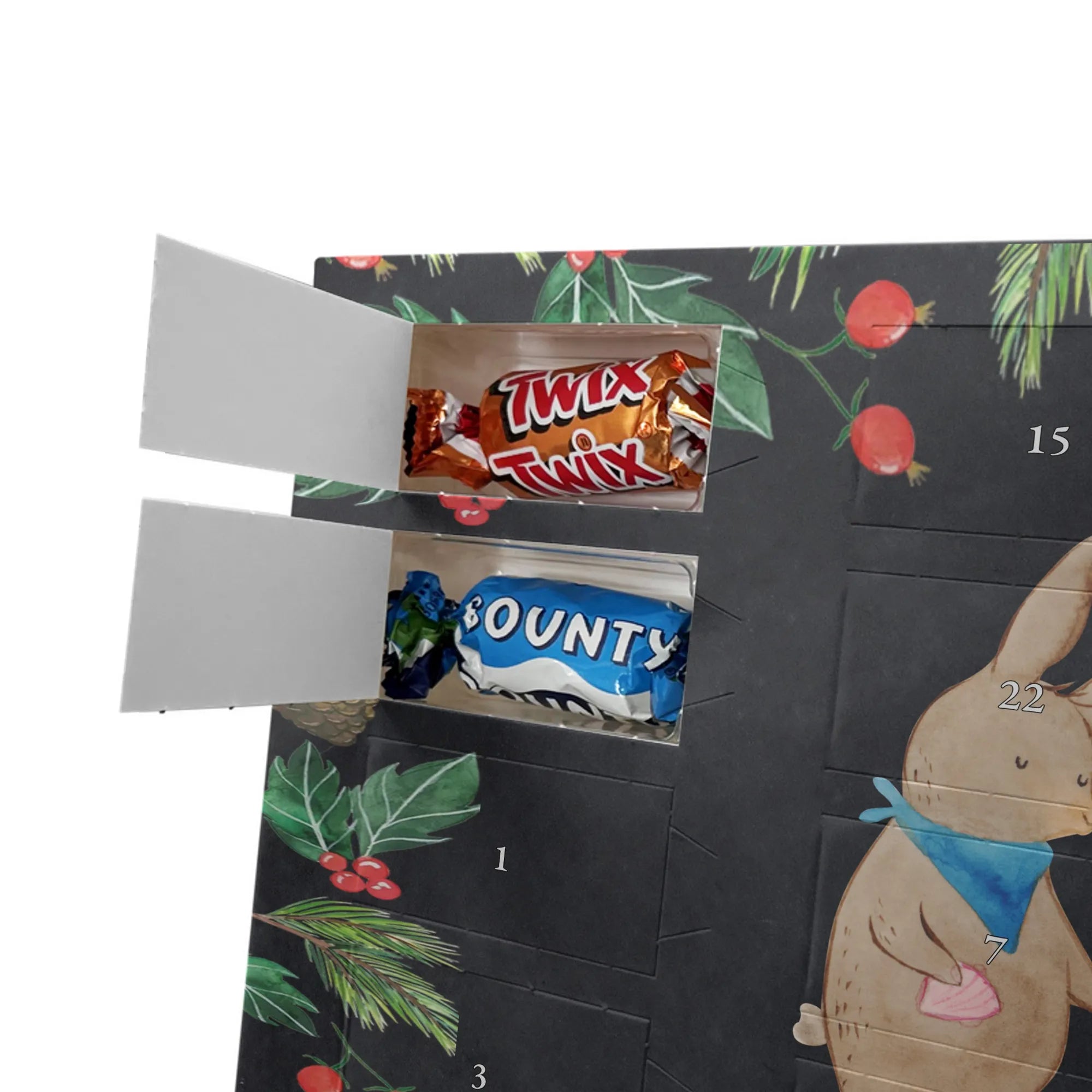 Unser Schoko Adventskalender von Mr. & Mrs. Panda bringt dir und deinen Lieben jede Menge Vorfreude und zauberhafte Momente in die Adventszeit. Der Kalender ist liebevoll bedruckt mit wunderschönen Motiven und frechen Sprüchen im typischen Mr. & Mrs. Panda Stil – ein echter Blickfang auf dem Tisch oder an der Wand. Die brillante Druckqualität kombiniert mit einer seidenmatten Oberflächenveredelung sorgt für edle Farben und ein angenehmes Gefühl beim Anfassen. Auch die Seitenflächen sind bedruckt, sodass der Kalender von allen Seiten hübsch aussieht. Er ist nicht personalisierbar, dafür aber in seiner Gestaltung rundum stimmig. Gefüllt ist der Adventskalender mit 24 hochwertigen Celebrations-Füllungen in acht verschiedenen Sorten: Maltesers, Mars, Snickers, Twix, Milky Way, Bounty, Galaxy und Galaxy Caramel — so ist für jede Naschkatze etwas dabei. Die Besonderheit: Du kannst den Kalender entweder aufstellen oder dank rückseitiger Aufhängung an die Wand hängen. Maße: 325 mm x 225 mm x 27 mm. Ein liebevolles Geschenk für Familie, Freunde oder einfach für dich selbst, das kleine tägliche Glücksmomente schenkt und die Adventszeit versüßt.